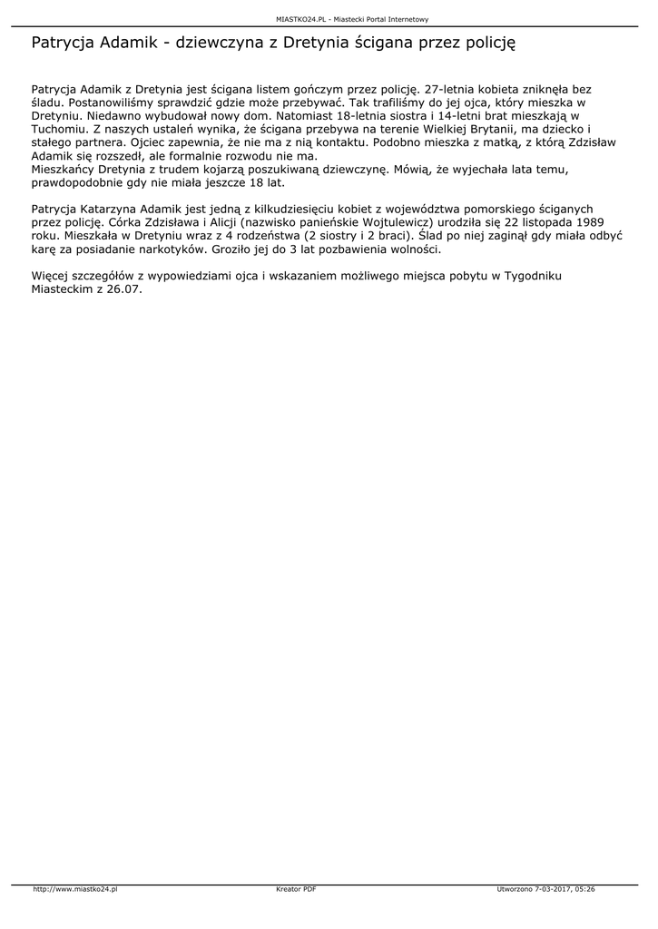 MIASTKO24.PL - Miastecki Portal Internetowy Patrycja Adamik - dziewczyna z Dretynia ścigana przez policję Patrycja Adamik z Dretynia jest ścigana listem gończym przez policję. 27-letnia kobieta zniknęła bez śladu. Postanowiliśmy sprawdzić gdzie może przebywać. Tak trafiliśmy do jej ojca, który mieszka w Dretyniu. Niedawno wybudował nowy dom. Natomiast 18-letnia siostra i 14-letni brat mieszkają w Tuchomiu. Z naszych ustaleń wynika, że ścigana przebywa na terenie Wielkiej Brytanii, ma dziecko i stałego partnera. Ojciec zapewnia, że nie ma z nią kontaktu. Podobno mieszka z matką, z którą Zdzisław Adamik się rozszedł, ale formalnie rozwodu nie ma. Mieszkańcy Dretynia z trudem kojarzą poszukiwaną dziewczynę. Mówią, że wyjechała lata temu, prawdopodobnie gdy nie miała jeszcze 18 lat. Patrycja Katarzyna Adamik jest jedną z kilkudziesięciu kobiet z województwa pomorskiego ściganych przez policję. Córka Zdzisława i Alicji (nazwisko panieńskie Wojtulewicz) urodziła się 22 listopada 1989 roku. Mieszkała w Dretyniu wraz z 4 rodzeństwa (2 siostry i 2 braci). Ślad po niej zaginął gdy miała odbyć karę za posiadanie narkotyków. Groziło jej do 3 lat pozbawienia wolności. Więcej szczegółów z wypowiedziami ojca i wskazaniem możliwego miejsca pobytu w Tygodniku Miasteckim z 26.07. http://www.miastko24.pl Kreator PDF Utworzono 7-03-2017, 05:26
