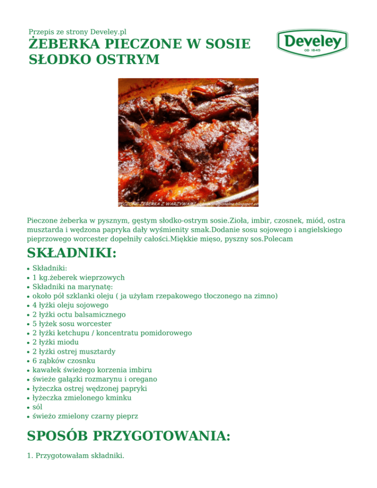Przepis ze strony Develey.pl ŻEBERKA PIECZONE W SOSIE SŁODKO OSTRYM Pieczone żeberka w pysznym, gęstym słodko-ostrym sosie.Zioła, imbir, czosnek, miód, ostra musztarda i wędzona papryka dały wyśmienity smak.Dodanie sosu sojowego i angielskiego pieprzowego worcester dopełniły całości.Miękkie mięso, pyszny sos.Polecam SKŁADNIKI: ● ● ● ● ● ● ● ● ● ● ● ● ● ● ● ● ● Składniki: 1 kg.żeberek wieprzowych Składniki na marynatę: około pół szklanki oleju ( ja użyłam rzepakowego tłoczonego na zimno) 4 łyżki oleju sojowego 2 łyżki octu balsamicznego 5 łyżek sosu worcester 2 łyżki ketchupu / koncentratu pomidorowego 2 łyżki miodu 2 łyżki ostrej musztardy 6 ząbków czosnku kawałek świeżego korzenia imbiru świeże gałązki rozmarynu i oregano łyżeczka ostrej wędzonej papryki łyżeczka zmielonego kminku sól świeżo zmielony czarny pieprz SPOSÓB PRZYGOTOWANIA: 1. Przygotowałam składniki. 2. Żeberka umyłam i pokroiłam na mniejsze kawałki. 3. Do miseczki kolejno dodawałam: olej, sos sojowy, ocet balsamiczny,sos worcester, starte ząbki czosnku, 4. miód, ketchup, musztardę, 5. przyprawy, starty korzeń imbiru, 6. świeże zioła. 7. Wszystkie składniki na marynatę wymieszałam. Polałam nią żeberka.Tak przygotowane - odstawiłam na noc do lodówki. 8. Żeberka przełożyłam do naczynia żaroodpornego. Wstawiłam do rozgrzanego piekarnika do temperatury 180 stopni na godzinę. Żeberka co jakiś czas przewracałam i smarowałam marynatą. Po tym czasie,przykryłam je folią aluminiową i piekłam jeszcze przez jakiś czas do miękkości.