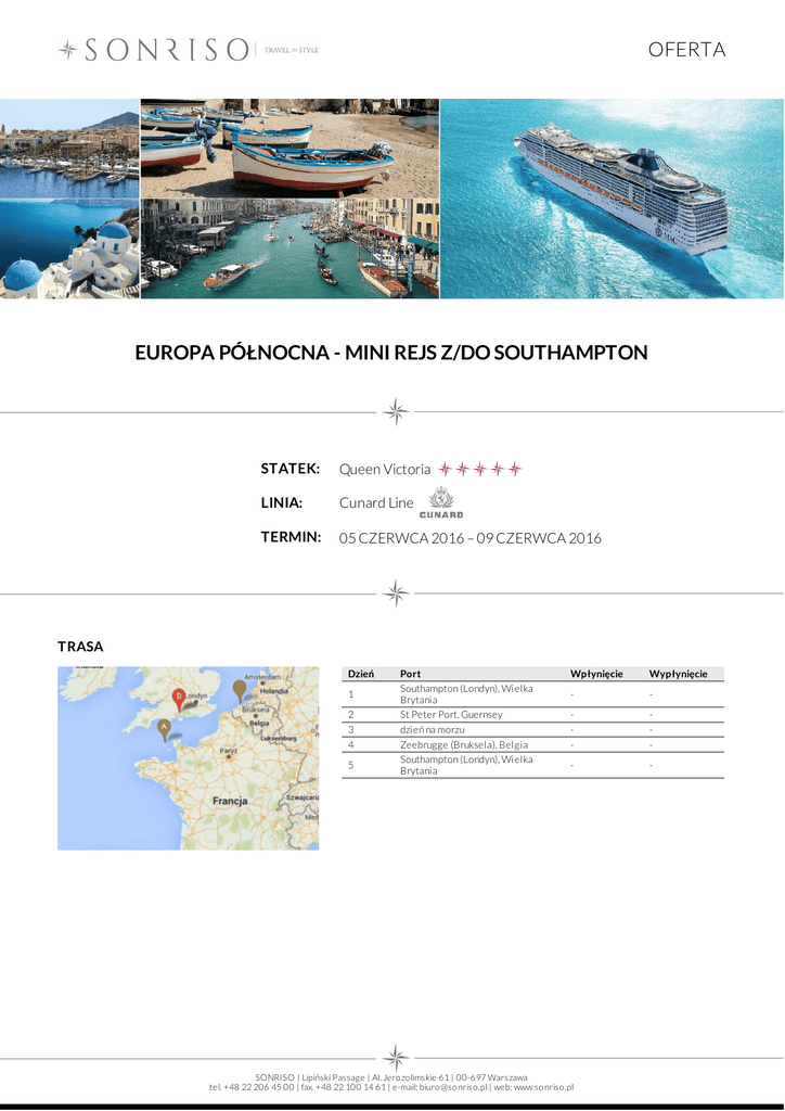 OFERTA EUROPA PÓŁNOCNA - MINI REJS Z/DO SOUTHAMPTON STATEK: Queen Victoria LINIA: Cunard Line TERMIN: 05 CZERWCA 2016 – 09 CZERWCA 2016 TRASA Dzień 1 2 3 4 5 Port Southampton (Londyn), Wielka Brytania St Peter Port, Guernsey dzień na morzu Zeebrugge (Bruksela), Belgia Southampton (Londyn), Wielka Brytania Wpłynięcie Wypłynięcie - - - - - - SONRISO | Lipiński Passage | Al. Jero zo limskie 61 | 00-697 Warszawa tel. +48 22 206 45 00 | fax. +48 22 100 14 61 | e-mail: biuro @so nriso .pl | web: www.so nriso .pl OFERTA CENA Typ kabiny Cena z osobę CENA ZAWIERA DOTATKOWE OPŁATY zakwaterowanie w 2 - os. kabinie wybranej kategorii pełne wyżywienie: 3 posiłki, przekąski między posiłakmi, bufet o północy napoje do posiłków: woda stołowa, kawa, herbata oraz sok do śniadania serwis bagażowy podczas wejścia i zejścia ze statku 24 godzinny serwis kabinowy korzystanie z urządzeń sportowo - rekreacyjnych dostępnych na pokładzie (baseny, jacuzzi, boiska sportowe itp.) udział we wszystkich imprezach organizowanych na pokładzie (przedstawienia, pokazy, aukcje, animacje i inne) obowiązkowe opłaty portowe dojazd/przelot do portu rozpoczęcia i zakończenia rejsu transfery (lotnisko - port - lotnisko) ewentulne noclegi przed lub po rejsie wycieczki fakultatywne napoje: bezalkoholowe, alkoholowe, woda mineralna dostępne w restauracjach i barach korzystanie z mini baru w kabinie korzystanie z usług typu: SPA, salon piękności, pralnia itp. wydatki osobiste tj. zakupy w butikach, internet, kasyno itp. obowiązkowa opłata serwisowa (napiwki dla obsługi statku ok. 12 USD/os. dorosła/dzień) obowiązkowe ubezpieczenie turystyczne koszt wymaganych wiz ewentualna opłata paliwowa (linia w momencie wzrotu cen ropy zastrzega sobie prawo do dodania oplaty paliwowej do każdej rezerwacji) Na życzenie świadczymy dodatkowo usługi: rezerwacje hotelowe na całym świecie rezerwacje biletów lotniczych, trasferów oraz parkingu w porcie rezerwacje wycieczek fakultatywnych i innych atrakcji SONRISO | Lipiński Passage | Al. Jero zo limskie 61 | 00-697 Warszawa tel. +48 22 206 45 00 | fax. +48 22 100 14 61 | e-mail: biuro @so nriso .pl | web: www.so nriso .pl