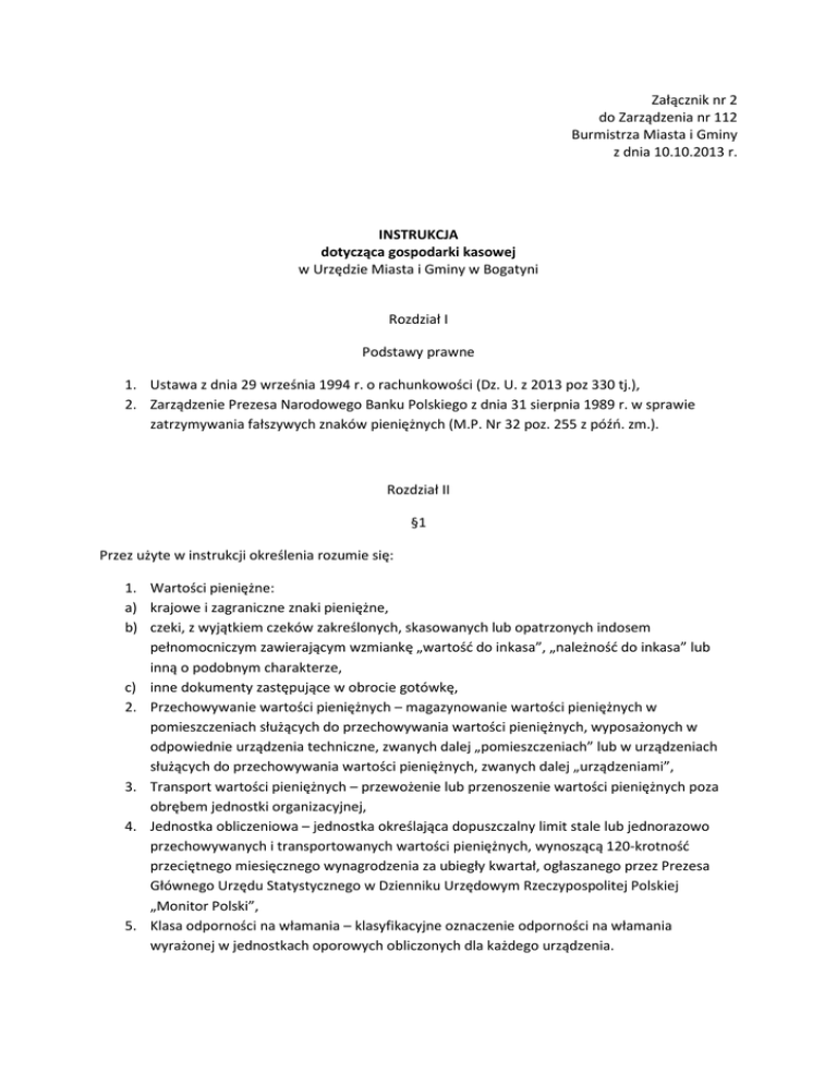 Załącznik nr 2 do Zarządzenia nr 112 Burmistrza Miasta i Gminy z dnia 10.10.2013 r. INSTRUKCJA dotycząca gospodarki kasowej w Urzędzie Miasta i Gminy w Bogatyni Rozdział I Podstawy prawne 1. Ustawa z dnia 29 września 1994 r. o rachunkowości (Dz. U. z 2013 poz 330 tj.), 2. Zarządzenie Prezesa Narodowego Banku Polskiego z dnia 31 sierpnia 1989 r. w sprawie zatrzymywania fałszywych znaków pieniężnych (M.P. Nr 32 poz. 255 z późń. zm.). Rozdział II §1 Przez użyte w instrukcji określenia rozumie się: 1. Wartości pieniężne: a) krajowe i zagraniczne znaki pieniężne, b) czeki, z wyjątkiem czeków zakreślonych, skasowanych lub opatrzonych indosem pełnomocniczym zawierającym wzmiankę „wartość do inkasa”, „należność do inkasa” lub inną o podobnym charakterze, c) inne dokumenty zastępujące w obrocie gotówkę, 2. Przechowywanie wartości pieniężnych – magazynowanie wartości pieniężnych w pomieszczeniach służących do przechowywania wartości pieniężnych, wyposażonych w odpowiednie urządzenia techniczne, zwanych dalej „pomieszczeniach” lub w urządzeniach służących do przechowywania wartości pieniężnych, zwanych dalej „urządzeniami”, 3. Transport wartości pieniężnych – przewożenie lub przenoszenie wartości pieniężnych poza obrębem jednostki organizacyjnej, 4. Jednostka obliczeniowa – jednostka określająca dopuszczalny limit stale lub jednorazowo przechowywanych i transportowanych wartości pieniężnych, wynoszącą 120-krotność przeciętnego miesięcznego wynagrodzenia za ubiegły kwartał, ogłaszanego przez Prezesa Głównego Urzędu Statystycznego w Dzienniku Urzędowym Rzeczypospolitej Polskiej „Monitor Polski”, 5. Klasa odporności na włamania – klasyfikacyjne oznaczenie odporności na włamania wyrażonej w jednostkach oporowych obliczonych dla każdego urządzenia. §2 Pomieszczenie kasy 1. Wartości pieniężne muszą być przechowywane w warunkach zapewniających należytą ochronę przed zniszczeniem, utratą lub zagięciem. 2. Pomieszczenie do przechowywania gotówki powinni być wydzielone. Okno pomieszczenia kasy winno być okratowane. W pomieszczeniu kasy powinno znajdować się okratowane okno i zamykane okienko, przez które kasjer dokonuje wypłaty i powinno być tak zainstalowane, aby uniemożliwiało wejście jakiejkolwiek osoby do wnętrza kasy. W pomieszczeniu kasy winno być zainstalowane urządzenie alarmowe. Pomieszczenie kasowe powinno być wyposażone w szafę stalową do przechowywania środków pieniężnych. §3 Kasjer 1. Kasjerem może być osoba o minimum średnim wykształceniu , mająca nienaganną opinię, nie karana za przestępstwa gospodarcze lub wykroczenia przeciwko mieniu oraz posiadająca pełną zdolność do czynności prawnych. 2. Przejęcia – przekazanie kasy może nastąpić jedynie protokolarnie, w obecności komisji wyznaczonej przez głównego księgowego. Kasjer w dowód przyjęcia odpowiedzialności materialnej składa deklarację odpowiedzialności za powierzone mienie oraz o znajomości przepisów w zakresie dokonywania operacji kasowych, transportu gotówki i znajomości przepisów w tym względzie obowiązujących. Kasjer powinien posiadać wykaz osób upoważnionych do dysponowania gotówką i zatwierdzania dowodów kasowych oraz wzorów ich podpisów. §4 Ochrona wartości pieniężnych Jednostki nie zaliczane do obiektów podlegających obowiązkowej ochronie zapewniają w budynkach i pomieszczeniach, w których przechowywane są wartości pieniężne co najmniej zabezpieczenia techniczne. W zakresie zabezpieczenia technicznego stosuje się: 1. Do przechowywania wartości pieniężnych – pomieszczenia lub urządzenia odpowiedniej klasy odporności do włamania, 2. Do przewożenia wartości pieniężnych – pojazdy przystosowane do przewozu wartości pieniężnych Klasa I – do 0,5 j.o. (przy odporności na włamania pomieszczeń i urządzeń 30, 50; klasie zamka 1xA), Klasa II – do 1,5 j.o. (przy odporności na włamania urządzeń i pomieszczeń 50, 80; klasie zamka 1xA), - do 3 j.o. (jak wyżej plus dodatkowo zabezpieczone systemem alarmowym) 3. do ochrony budynków i pomieszczeń oraz pojazdów – systemy alarmowe. W Urzędzie Miasta i Gminy stosuje się system alarmowy, stalową szafę, kasety stalowe i odpowiednie znaki. Do zabezpieczenia wartości pieniężnych stosuje się: - kasę stalową do 0,3 j.o. - szafę stalową do 1 j.o. - szafę pancerną do 20 j.o. §5 Transport wartości pieniężnych Transport wartości pieniężnych nie przekraczających 1 j.o. może być wykonywany pieszo, jeżeli użycie pojazdu mechanicznego nie jest uzasadnione ze względu na odległość dzielącą jednostkę, w której wartości pieniężne są pobierane, od jednostki, do której są transportowane, a do przenoszenia wartości pieniężnych używa się odpowiedniego zabezpieczenia technicznego. W przypadkach, gdy przenoszone wartości pieniężne przekraczają 0,3 j.o. osoba transportująca jest chroniona przez co najmniej jednego pracownika ochrony, który może być nie uzbrojony. Wartości pieniężne większe niż 1 j.o. transportuje się pojazdami specjalnymi lyb przystosowanymi. Przy przewozie wartości pieniężnych do 5 j.o. transport chroniony jest przez jednego konwojenta. §6 Gospodarka kasowa 1. a) b) c) 2. a) b) c) 3. Jednostka organizacyjna może mieć w kasie: Niezbędny zapas gotówki na bieżące wydatki, Gotówkę podjętą z rachunku bankowego na pokrycie określonych rodzajowo wydatków, Gotówkę pochodzącą z bieżących wpływów do kasy jednostki. Wysokość niezbędnego zapasu gotówki w kasie jest ustalona przez kierownika jednostki, w zależności od warunków zabezpieczenia gotówki i możliwości jej odprowadzenia na rachunek bankowy. Poza tym należy mieć na uwadze: Przy ustalaniu wysokości zapasu należy uwzględnić minimum potrzeb w zakresie obrotu gotówkowego, Niezbędny zapas gotówki w kasie urzędu w miar