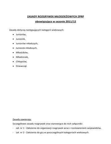 ZASADY ROZGRYWEK MŁODZIEŻOWYCH ZPRP obowiązujące w sezonie 2011/12 Zasady dotyczą następujących kategorii wiekowych: Juniorów, Juniorek, Juniorów młodszych, Juniorek młodszych, Młodzików, Młodziczek, Chłopców, Dziewcząt. Zasady zawierają: Szczegółowe zasady rozgrywek oraz stanowiące do nich załączniki: - zał. nr 1 - Założenia do organizacji rozgrywek wraz z rozstawieniem województw, - zał. nr 2 - Założenia do gry w poszczególnych kategoriach wiekowych. SZCZEGÓŁOWE ZASADY ROZGRYWEK Postanowienia ogólne §1 1. Niniejsze zasady dotyczą rozgrywek kobiet, mężczyzn, dziewcząt i chłopców o: - Mistrzostwo Polski w kategoriach wiekowych Juniorów i Juniorów Młodszych, - Puchar ZPRP Młodzików, Chłopców i Dziewcząt. 2. Rozgrywki młodzieżowe prowadzone są zgodnie z regułami zawartymi w: - „Przepisach gry w piłkę ręczną”, - niniejszych Zasadach, oraz obowiązują w nich inne uchwały i decyzje Zarządu ZPRP dotyczące tych rozgrywek. 3. Pod pojęciem rozgrywek szczebla centralnego rozumie się rozgrywki w poszczególnych kategoriach wiekowych powyżej szczebla wojewódzkiego. 4. Ilekrod w niniejszym regulaminie używa się pojęcia „zawodnik” to rozumie się pod nim również zawodniczkę. 5. Użyte w regulaminie poniższe skróty oznaczają: - ZPRP - Związek Piłki Ręcznej w Polsce, - WZPR - Wojewódzki Związek Piłki Ręcznej, - KRM ZPRP – Komisję Rozgrywek Młodzieżowych ZPRP, - KSW ZPRP - Kolegium Sędziów ZPRP. - KD ZPRP - Komisja Dyscyplinarna ZPRP, - KO ZPRP - Komisja Odwoławcza ZPRP. 6. Kluby biorące udział w rozgrywkach szczebla centralnego pocztą elektroniczną lub pocztą: 1) kierują korespondencję w sprawach rozgrywek bezpośrednio do KRM ZPRP; 2) otrzymują od KRM ZPRP pocztą elektroniczną komunikaty i pisma dotyczące rozgrywek. 7. Zasady korespondencji pomiędzy klubami uczestniczącymi w rozgrywkach na szczeblu wojewódzkim a prowadzącymi je organami określają właściwe WZPR. Organ prowadzący rozgrywki §2 1. Na szczeblu wojewódzkim organami prowadzącymi rozgrywki na zlecenie ZPRP i pod nadzorem KRM ZPRP są właściwe WZPR. Organem prowadzącym rozgrywki szczebla centralnego jest KRM ZPRP. Kluby uczestniczące w rozgrywkach podlegają w sprawach z nimi związanych bezpośrednio tym organom. 2. Bieżące decyzje w sprawach organizacyjno-porządkowych związanych z przebiegiem rozgrywek wojewódzkich podejmują właściwe WZPR, a na szczeblu centralnym – KRM ZPRP. Organa te prowadzą również odpowiednio postępowania dyscyplinarne i wydają decyzje w I instancji w sprawach naruszenia przepisów przez kluby, zawodników, trenerów i pozostałe osoby towarzyszące uczestniczące w rozgrywkach. W trakcie rozgrywek w formie turniejowej, w sprawach naruszenia przepisów i zasad w nich obowiązujących przez ww. uczestników zawodów, decyzje podejmuje sędzia główny delegowany na turniej przez organ prowadzący dane rozgrywki. 3. Organa prowadzące rozgrywki przekazują do KD ZPRP informację o wykroczeniach, które są zagrożone karą dyskwalifikacji czasowej oraz dotyczą braku porządku na obiekcie sportowym przed, w trakcie i po zawodach. 4. KO ZPRP podejmuje rozstrzygnięcia w II instancji w wyniku odwołao od decyzji organów, o których mowa w ust. 2 i 3. Uczestnicy rozgrywek §3 1. W rozgrywkach mogą uczestniczyd zespoły klubów będących członkami ZPRP. 2. Prawo udziału w rozgrywkach szczebla centralnego posiadają zespoły klubów, które uzyskały awans z rozgrywek wojewódzkich zgodnie z zasadami niniejszego regulaminu. Kategorie wiekowe rozgrywek, ich szczeble i fazy §4 Rozgrywkami młodzieżowymi w poszczególnych kategoriach wiekowych są: 1) w Mistrzostwach Polski Juniorów – dla zawodników urodzonych w latach 1993 – 1994 i w Mistrzostwach Polski Juniorów Młodszych – dla zawodników urodzonych w latach 1995 – 1996: a) rozgrywki na szczeblu wojewódzkim wraz z barażami, b) na szczeblu centralnym: - dwierdfinały, - półfinały, - finały 2) w Pucharze ZPRP Młodzików – dla zawodników urodzonych w latach 1997 - 1998: a) rozgrywki na szczeblu wojewódzkim, b) - finał jako rozgrywki szczebla centralnego. 3) w Pucharze ZPRP Chłopców i Dziewcząt – dla zawodników urodzonych w latach 1999 - 2000: a) rozgrywki na szczeblu wojewódzkim, b) finał jako rozgrywki szczebla centralnego. Zgłoszenia do rozgrywek i uczestnictwo w nich §5 1. Tryb zgłaszania zespołów i zawodników do rozgrywek szczebla wojewódzkiego ustalają poszczególne WZPR-y z uwzględnieniem jednakże postanowieo niniejszych zasad zawartych w § 6 i 7. 2. Tryb zgłoszeo zespołów do rozgrywek szczebla centralnego i związane z tym procedury określony jest w § 34 – 38. §6 1. Zgłoszenia do rozgrywek dokonuje się do właściwego WZPR pismem podpisanym przez osobę/by upoważnioną/ne do reprezentowania klubu. Zgłoszenie do rozgrywek musi zawierad następujące dane: - nazwę klubu, - nazwę zespołu (maksymalnie trzy człony) do stosowania przez organy prowadzące rozgrywki - adres klubu do korespondencji, - nr telefonu i faksu, adres poczty elektronicznej oraz ewentualnie strony internetowej, - nazwiska i imiona oraz nr telefonów osób do kontaktu w sprawach rozgrywek, - nazwę, adres i telefon obiektu na którym rozgrywane są zawody. 2. W terminie określonym przez odpowiedni WZPR, lecz nie później niż na 7 dni przed rozpoczęciem danych rozgrywek, uczestniczący w nich klub musi przesład do WZPR alfabetyczną, imienną listę zgłoszeo zawodników na druku wg wzoru stanowiącego załącznik nr 3 do niniejszych zasad z uwzględnieniem postanowieo zawartych w § 7 ust. 1. 3. W terminie do dnia 31 października WZPR-y zobowiązane są przesład zgłoszenia klubów wraz z danymi, o których mowa w ust. 1 oraz imienne listy zgłoszeo do rozgrywek, o których mowa w ust. 2, formie elektronicznej do KRM ZPRP na adres [email protected] 4. Dodatkowych zgłoszeo zawodników można dokonywa