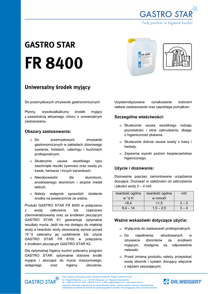 GASTRO STAR FR 8400 Uniwersalny środek myjący Do przemysłowych zmywarek gastronomicznych Płynny, wysokoalkaliczny środek myjący z zawartością aktywnego chloru o uniwersalnym zastosowaniu Obszary zastosowania: przemysłowych zmywarek • Do gastronomicznych w zakładach zbiorowego żywienia, hotelach, cateringu i kuchniach profesjonalnych. usuwa wszelkiego typu • Skutecznie zaschnięte resztki żywności oraz osady po kawie, herbacie i innych barwnikach. dla aluminium, • Nieodpowiedni anodowanego aluminium i stopów metali lekkich. • Należy wstępnie sprawdzić działanie środka na powierzchnie ze srebra. Produkt GASTRO STAR FR 8400 w połączeniu z wodą całkowicie lub częściowo zdemineralizowaną oraz ze środkiem płuczącym GASTRO STAR K1 gwarantuje optymalne rezultaty mycia. Jeśli nie ma dostępu do miękkiej wody a twardość wody stosowanej wynosi ponad 10 °d zalecamy jej uzdatnienie lub użycie GASTRO STAR FR 8700 w połączeniu z środkiem płuczącym GASTRO STAR K2. Dla optymalnej higieny kuchni polecamy program GASTRO STAR: optymalnie dobrane środki myjące i płuczące do mycia maszynowego, wstępnego oraz higieny otoczenia. Usystematyzowane oznakowanie kolorami ułatwia zastosowanie oraz zapobiega pomyłkom. Szczególne właściwości: • Skutecznie usuwa wszelkiego rodzaju pozostałości i silne zabrudzenia, dbając o higieniczność płukania. • Skutecznie dobrze usuwa osady z kawy i herbaty. • Zapewnia wysoki poziom bezpieczeństwa higienicznego. Użycie i dozowanie: Dozowanie poprzez zamontowane urządzenia dozujące. Dozować w zależności od zabrudzenia i jakości wody 2 – 4 ml/l. twardość ogólna w °d H <8,4 8,4 – 14 twardość ogólna w mmol/l <1,5 1,5 – 2,5 ml/l 2–3 3–4 Ważne wskazówki dotyczące użycia: • Wyłącznie do zastosowań profesjonalnych. napełniania, wbudowanych w • Do zmywarce zbiorników ze środkiem myjącym, dostępne są odpowiednie nalewaki. • Przed zmianą produktu należy przepłukać wodą zbiornik i system dozujący włącznie z wężami zasysającymi. Znak towarowy zastrzeżony przez Chemische Fabrik Dr. Weigert GmbH & Co.KG Dr. Weigert Polska Sp. z o.o. • 01-531 Warszawa • ul. Wybrzeże Gdyńskie 6A tel.: +4822 616 02 23 • faks: +4822 617 81 21 • [email protected] • www.gastro-star.pl Powyższa informacja, odpowiednia do naszej aktualnej wiedzy, opisuje produkt w zakresie bezpieczeństwa. Odstępstwa od zaleceń stosowania nie gwarantują jakości produktu i nie pociągają za sobą roszczeń prawnych. • W celu uzyskania optymalnych efektów mycia polecamy przestrzeganie aktualnych zaleceń DIN (od 10510 do 10512 i 10522). Rodzaje zagrożeń i środki ostrożności: • Roztwory robocze GASTRO STAR FR 8400 należy całkowicie spłukać wodą. Jeżeli produkt używany jest zgodnie z zaleceniami, nie stanowi on zagrożenia w rozumieniu dyrektywy dot. przetwórstwa spożywczego. • W przypadku wystąpienia kamienia w maszynie należy zastosować odkamieniacz GASTRO STAR EK. W celu uniknięcia powstania kamienia zaleca się zainstalowanie odpowiedniej stacji uzdatniania wody lub użycie GASTRO STAR FR 8700 w połączeniu ze środkiem płuczącym GASTRO STAR K2. • Nie mieszać z innymi produktami. Zamknięte opakowania należy usuwać jako odpady tylko po całkowitym opróżnieniu. Usuwanie resztek produktu według zaleceń zamieszczonych w karcie charakterystyki. Informacje dotyczące bezpieczeństwa i ochrony środowiska znajdują się w karcie charakterystyki dostępnej na stronie www.gastro-star.pl • Nie przelewać do innych pojemników, butelek itp.! Dane techniczne: wartość pH przewodność gęstość lepkość współczynnik miareczkowania ok. 11,6 – 12,4 (2 – 4 ml/l) 4,3 mS/cm (4 ml/l w wodzie zdemineralizowanej, 22°C) 3 1,3 g/cm ok. 4 mPas (20°C) 0,72 Skład: Zawartość składników według Rozporządzenia WE 648/2004 w sprawie detergentów: < 5% związki wybielające na bazie chloru, 15 – 30% fosforany Magazynowanie: Przechowywać w chłodnym i ciemnym miejscu w temperaturach od -15 do max. 25°C. Chronić przed temperaturami poniżej -15°C. Czas magazynowania jest ograniczony zmniejszaniem się zawartości aktywnego chloru w produkcie. W trakcie magazynowania produktu może wystąpić zmiana koloru nie mająca wpływu na jego właściwości użytkowe. MB 3133/3-1_08/2014 Znak towarowy zastrzeżony przez Chemische Fabrik Dr. Weigert GmbH & Co.KG Dr. Weigert Polska Sp. z o.o. • 01-531 Warszawa • ul. Wybrzeże Gdyńskie 6A tel.: +4822 616 02 23 • faks: +4822 617 81 21 • [email protected] • www.gastro-star.pl Powyższa informacja, odpowiednia do naszej aktualnej wiedzy, opisuje produkt w zakresie bezpieczeństwa. Odstępstwa od zaleceń stosowania nie gwarantują jakości produktu i nie pociągają za sobą roszczeń prawnych. PL 3.0 / 07.2015