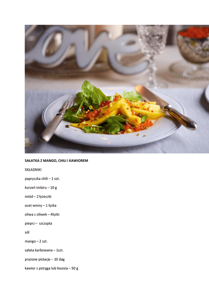 SAŁATKA Z MANGO, CHILI I KAWIOREM SAŁATKA Z SZYNKĄ SZWARCWALDZKĄ Słodka sałatka z kurczakiem curry i chrupiącym słonecznikiem Składniki 450g fileta z kurczaka 2 łyżeczki mieszanki przypraw curry 1 puszka kukurydzy konserwowej 1 puszka brzoskwiń 300g pekińskiej kapusty 2 marchewki 100g rodzynek 80g łuskanego słonecznika sól pieprz masło klarowane Sos: 3 łyżki majonezu 4 łyżki jogurtu naturalnego 4 łyżki pikantnego ketchupu sól pieprz Sposób przygotowania 1.Filet z kurczaka pokroić w grubszą kostkę, oprószyć solą, pieprzem, curry i odstawić na 20minut. Po tym czasie usmażyć na rozgrzanym maśle klarowanym. 2.Poszatkowaną kapustę pekińską wymieszać z marchewką startą na tarce o małych oczkach, lekko posolić. 3.Kukurydzę i brzoskwinie odsączyć z zalewy. Brzoskwinie pokroić w kostkę, a rodzynki namoczyć w soku z brzoskwiń. Słonecznik uprażyć na suchej patelni. 4.Sos: Majonez, jogurt i ketchup wymieszać, doprawić solą, pieprzem i całość ponownie dokładnie wymieszać. 5.Sałatkę układać warstwami: połowa kapusty z marchewką, połowa kukurydzy, 1/2 sosu, rodzynki, kurczak, pozostała ilość kukurydzy, pozostała ilość sosu, pozostała kapusta z marchewką, brzoskwinie i prażony słonecznik. Sałatka z kaszą kuskus i suszonymi pomidorami Składniki Pół szklanki kaszy kuskus 8 pomidorów suszonych Garść posiekanego koperku 5 łyżek kukurydzy z puszki Średnia marchew Sól i pieprz do smaku Sposób przygotowania 1.Przygotowujemy kaszę kuskus zgodnie z przepisem na opakowaniu. 2.Marchewkę obieramy i tarkujemy na tarce. 3.Do kaszy i marchewki dodajemy kukurydzę, posiekane pomidory suszone i koperek. Doprawiamy solą i pieprzem i dodajemy oliwkę z suszonych pomidorów. Sałatka z fetą i chrupiącym boczkiem Składniki 1 opakowanie mieszanki sałat 2 ogórki (gruntowy i konserwowy) Kilka oliwek 1/2 opakowania fety 10 plastrów wędzonego boczku 2 pomidory 2 jajka Ząbek czosnku 3 łyżki oliwy z oliwek Przyprawy (bazylia, oregano, pieprz) Sposób przygotowania Jajko gotujemy na twardo. Boczek podsmażamy, przekładamy na ręcznik papierowy aby odsączyć z nadmiaru tłuszczu. Ogórki, fetę, pomidor, ugotowane jajka, boczek kroimy. Sałatę rwiemy. Ząbek czosnku przeciskamy przez praskę, łączymy z oliwą i przyprawami. Wszystkie składniki łączymy i polewamy oliwą. Sałata z łososiem i granatem Składniki op.mieszanki sałat 200 g wędzonego łososia w plastrach 10 pomidorków koktajlowych 4 jajka 1 granat sos: 1 cebulka biała 1 łyżeczka musztardy 1 łyżka płynnego miodu 5 łyżek oliwy 2 łyżki soku z cytryny sól Sposób przygotowania 1.Sałaty i pomidorki umyj i osusz. Jajka ugotuj na twardo, przestudz, obierz i pokrój w ćwiartki. 2.Przygotuj sos: cebulę obierz i drobno posiekaj, wymieszaj dokładnie z miodem i musztardą, sokiem z cytryny i oliwą. 3. Na talerzach rozłóż sałaty, pomidorki i jajka. Przypraw solą. Dodaj wędzonego łososia pokrojonego w mniejsze porcje i polej sosem. Na koniec udekoruj pestkami granatu.