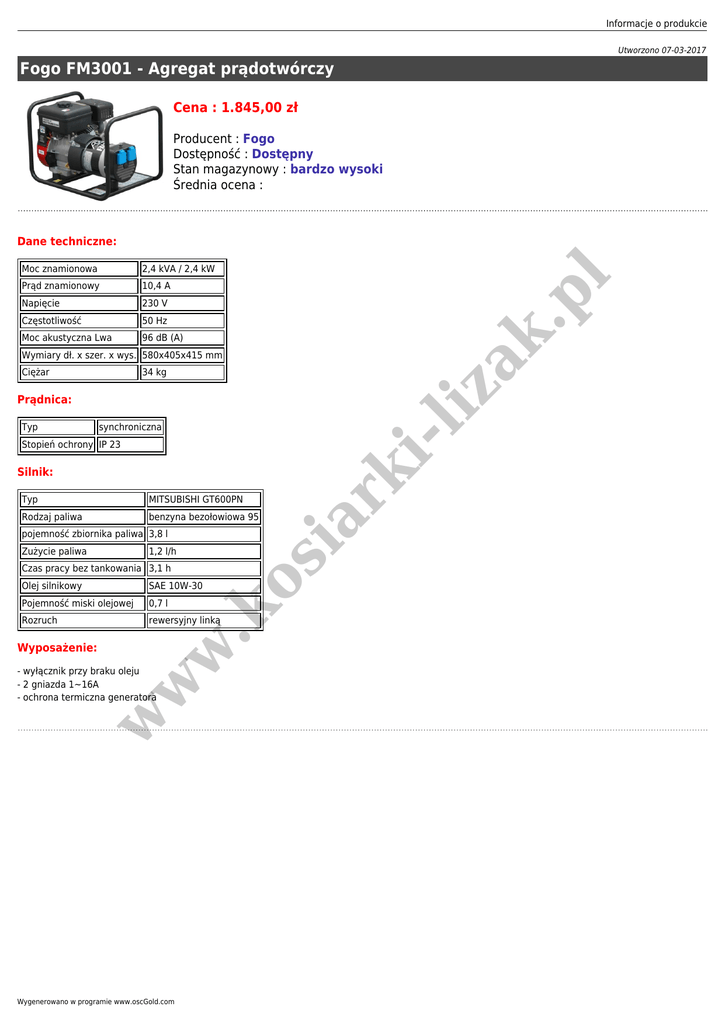 Informacje o produkcie Utworzono 07-03-2017 Fogo FM3001 - Agregat prądotwórczy Cena : 1.845,00 zł Producent : Fogo Dostępność : Dostępny Stan magazynowy : bardzo wysoki Średnia ocena : Dane techniczne: 2,4 kVA / 2,4 kW Prąd znamionowy 10,4 A Napięcie 230 V Częstotliwość 50 Hz Moc akustyczna Lwa 96 dB (A) iz ak .p l Moc znamionowa Wymiary dł. x szer. x wys. 580x405x415 mm Ciężar 34 kg Prądnica: synchroniczna -l Typ Typ MITSUBISHI GT600PN Rodzaj paliwa benzyna bezołowiowa 95 pojemność zbiornika paliwa 3,8 l 1,2 l/h Czas pracy bez tankowania 3,1 h SAE 10W-30 Pojemność miski olejowej 0,7 l Rozruch rewersyjny linką w Wyposażenie: .k Olej silnikowy w w - wyłącznik przy braku oleju - 2 gniazda 1~16A - ochrona termiczna generatora Wygenerowano w programie www.oscGold.com os Zużycie paliwa ia Silnik: rk i Stopień ochrony IP 23