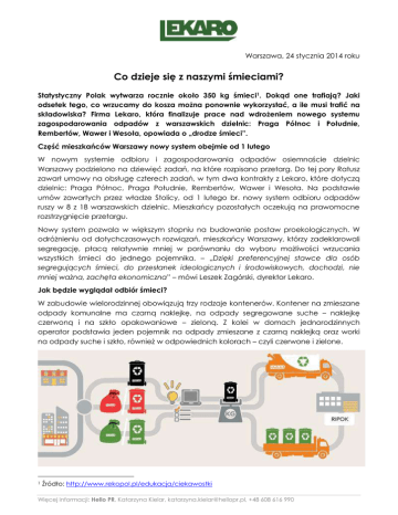 Warszawa, 24 stycznia 2014 roku Co dzieje się z naszymi śmieciami? Statystyczny Polak wytwarza rocznie około 350 kg śmieci1. Dokąd one trafiają? Jaki odsetek tego, co wrzucamy do kosza można ponownie wykorzystać, a ile musi trafić na składowiska? Firma Lekaro, która finalizuje prace nad wdrożeniem nowego systemu zagospodarowania odpadów z warszawskich dzielnic: Praga Północ i Południe, Rembertów, Wawer i Wesoła, opowiada o „drodze śmieci”. Część mieszkańców Warszawy nowy system obejmie od 1 lutego W nowym systemie odbioru i zagospodarowania odpadów osiemnaście dzielnic Warszawy podzielono na dziewięć zadań, na które rozpisano przetarg. Do tej pory Ratusz zawarł umowy na obsługę czterech zadań, w tym dwa kontrakty z Lekaro, które dotyczą dzielnic: Praga Północ, Praga Południe, Rembertów, Wawer i Wesoła. Na podstawie umów zawartych przez władze Stolicy, od 1 lutego br. nowy system odbioru odpadów ruszy w 8 z 18 warszawskich dzielnic. Mieszkańcy pozostałych oczekują na prawomocne rozstrzygnięcie przetargu. Nowy system pozwala w większym stopniu na budowanie postaw proekologicznych. W odróżnieniu od dotychczasowych rozwiązań, mieszkańcy Warszawy, którzy zadeklarowali segregację, płacą relatywnie mniej w porównaniu do wyboru możliwości wrzucania wszystkich śmieci do jednego pojemnika. – „Dzięki preferencyjnej stawce dla osób segregujących śmieci, do przesłanek ideologicznych i środowiskowych, dochodzi, nie mniej ważna, zachęta ekonomiczna” – mówi Leszek Zagórski, dyrektor Lekaro. Jak będzie wyglądał odbiór śmieci? W zabudowie wielorodzinnej obowiązują trzy rodzaje kontenerów. Kontener na zmieszane odpady komunalne ma czarną naklejkę, na odpady segregowane suche – naklejkę czerwoną i na szkło opakowaniowe – zieloną. Z kolei w domach jednorodzinnych operator podstawia jeden pojemnik na odpady zmieszane z czarną naklejką oraz worki na odpady suche i szkło, również w odpowiednich kolorach – czyli czerwone i zielone. 1 Źródło: http://www.rekopol.pl/edukacja/ciekawostki Więcej informacji: Hello PR, Katarzyna Kielar, [email protected], +48 608 616 990 Transport odpadów Poszczególne frakcje śmieci będą odbierane osobnymi pojazdami zgodnie z harmonogramem dla danej nieruchomości. W przypadku domów jednorodzinnych istotne jest wystawienie pojemników i worków przed posesję do godziny 6.00 rano w dniu wywozu. Z kolei w zabudowie wielorodzinnej ważne jest udostępnienie altanek lub pomieszczeń w dniu wywozu, czyli pozostawienie ich otwartych. Odpady zmieszane zawsze muszą być odbierane samochodami bezpylnymi. Śmieciarki te gwarantują, że żadne płyny czy zapachy nie wydostają się z pojemników podczas ich opróżniania. W ten sam sposób Lekaro będzie odbierać odpady segregowane suche. Szkło opakowaniowe – to kolejny transport, który w zależności od potrzeb, będzie realizowany za pomocą śmieciarki lub samochodu skrzyniowego. – „Wszystkie pojazdy przeznaczone do odbioru odpadów z Warszawy w nowym systemie – bez względu na rodzaj przewożonych odpadów – będą wyposażone w lokalizację GPS, wagi dynamiczne oraz system identyfikacji pojemników. Przewidujemy również organizację okresowych zbiórek takich odpadów, jak wielkogabarytowe lub zielone” – wyjaśnia dyrektor Lekaro. Dokąd zabierane są nasze śmieci? Wszystkie odpady z terenu Warszawy są transportowane do specjalistycznego zakładu mechaniczno-biologicznego przetwarzania odpadów zmieszanych (MBP), mającego status RIPOK, czyli regionalnej instalacji przetwarzania odpadów komunalnych i tam kierowane są do dalszego przetwarzania. – „Zakład Lekaro o przepustowości 300 000 ton odpadów na rok, do którego trafiać będą odpady z Pragi Północ i Południe, Rembertowa, Wawra i Wesołej, zlokalizowany jest w Woli Duckiej” – dodaje Leszek Zagórski. Jak wygląda utylizacja śmieci? Wszystkie odpady trafiające do RIPOKu Lekaro – bez względu na ich rodzaj – podlegają ponownej segregacji. Ten pierwszy rodzaj selekcji odpadów wykonywany jest za pomocą zaawansowanych technologii, wspomagających automatyczne i ręczne sortowanie. Wybrane frakcje odpadów podlegają odzyskowi materiałowemu, w ramach którego Więcej informacji: Hello PR, Katarzyna Kielar, [email protected], +48 608 616 990 wydzielane są takie frakcje, jak: metal, aluminium, gazeta, karton, szkło, butelki PET i folie oraz opakowania tetra-pak (czyli np. kartony po sokach). Wszystkie te materiały są odpowiednio segregowane i prasowane, by następnie trafić do recyklerów. W toku segregacji w RIPOKu wydzielana jest również tzw. frakcja palna, z której w drodze odzysku energetycznego otrzymywane jest paliwo alternatywne RDF w postaci charakterystycznych płatków. Materiał ten jest z kolei sprzedawany do spalania w cementowniach. Pozostałe śmieci, pochodzące przeważnie ze zmieszanych odpadów komunalnych, czyli tzw. frakcja biodegradowalna, przeznaczone są do dalszej biostabilizacji i biosuszenia w kompostowniach. Po przeprowadzeniu tych procesów frakcja odpadów trafia na wysypisko – część jest bezpośrednio składowana, a część wykorzystywana jako odzysk do rekultywacji składowisk. Poziomy recyklingu Nowy system odbioru i zagospodarowania odpadów został wprowadzony przede wszystkim w celu spełnienia standardów unijnych, dotyczących m.in. poziomu recyklingu. Zgodnie z tzw. „ustawą śmieciową”, za spełnienie norm odzysku odpowiedzialna jest gmina. Z kolei z rozporządzenia Ministra Środowiska wynika, że poziom recyklingu w bieżącym roku powinien wynieść 14%, ale w 2020 roku już połowę odpadów komunalnych odebranych od mieszkańców danej gminy. Wymagane poziomy recyklingu w kolajnych latach Papier, metal, tworzywa sztuczne, szkło 2014 14% 2015 16% 2016 18% 2017 20% 2018 30% 2019 40% 2020 50% Źródło: Rozporządzenie Ministra Środowiska z 29 maja 2012 r. w sprawie 