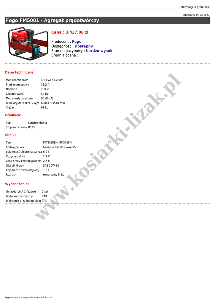 Informacje o produkcie Utworzono 07-03-2017 Fogo FM5001 - Agregat prądotwórczy Cena : 3.437,00 zł Producent : Fogo Dostępność : Dostępny Stan magazynowy : bardzo wysoki Średnia ocena : Dane techniczne: 4,2 kVA / 4,2 kW Prąd znamionowy 18,2 A Napięcie 230 V Częstotliwość 50 Hz Moc akustyczna Lwa 96 dB (A) iz ak .p l Moc znamionowa Wymiary dł. x szer. x wys. 650x470x510 mm Ciężar 61 kg Prądnica: synchroniczna -l Typ Silnik: Typ MITSUBISHI GM301PN Rodzaj paliwa benzyna bezołowiowa 95 Zużycie paliwa ia pojemność zbiornika paliwa 6,0 l 2,2 l/h 1,2 l Rozruch rewersyjny linką Wyposażenie: 2 szt Wyłącznik termiczny TAK w Gniazdo 16 A 1-fazowe .k SAE 10W-30 Pojemność miski olejowej w w Wyłącznik przy braku oleju TAK Wygenerowano w programie www.oscGold.com os Czas pracy bez tankowania 2,7 h Olej silnikowy rk i Stopień ochrony IP 23