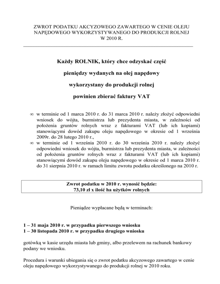 ZWROT PODATKU AKCYZOWEGO ZAWARTEGO W CENIE OLEJU NAPĘDOWEGO WYKORZYSTYWANEGO DO PRODUKCJI ROLNEJ W 2010 R. __________________________________________________________________ KaŜdy ROLNIK, który chce odzyskać część pieniędzy wydanych na olej napędowy wykorzystany do produkcji rolnej powinien zbierać faktury VAT • w terminie od 1 marca 2010 r. do 31 marca 2010 r. naleŜy złoŜyć odpowiedni wniosek do wójta, burmistrza lub prezydenta miasta, w zaleŜności od połoŜenia gruntów rolnych wraz z fakturami VAT (lub ich kopiami) stanowiącymi dowód zakupu oleju napędowego w okresie od 1 września 2009r. do 28 lutego 2010 r., • w terminie od 1 września 2010 r. do 30 września 2010 r. naleŜy złoŜyć odpowiedni wniosek do wójta, burmistrza lub prezydenta miasta, w zaleŜności od połoŜenia gruntów rolnych wraz z fakturami VAT (lub ich kopiami) stanowiącymi dowód zakupu oleju napędowego w okresie od 1 marca 2010 r. do 31 sierpnia 2010 r. w ramach limitu zwrotu podatku określonego na 2010 r. Zwrot podatku w 2010 r. wynosić będzie: 73,10 zł x ilość ha uŜytków rolnych Pieniądze wypłacane będą w terminach: 1 – 31 maja 2010 r. w przypadku pierwszego wniosku 1 – 30 listopada 2010 r. w przypadku drugiego wniosku gotówką w kasie urzędu miasta lub gminy, albo przelewem na rachunek bankowy podany we wniosku. Procedura i warunki ubiegania się o zwrot podatku akcyzowego zawartego w cenie oleju napędowego wykorzystywanego do produkcji rolnej w 2010 roku. 1. W 2010 r. producent rolny moŜe składać do wójta, burmistrza (prezydenta miasta) właściwego ze względu na miejsce połoŜenia gruntów będących w posiadaniu lub współposiadaniu tego producenta rolnego (w tym dzierŜawcy) wnioski o zwrot podatku akcyzowego zawartego w cenie oleju napędowego wykorzystywanego do produkcji rolnej do wysokości limitu zwrotu określonego na 2010 r. w dwóch terminach, tj: • od 1 marca 2010 r. do 31 marca 2010 r. producent składa wniosek o zwrot podatku akcyzowego wraz z fakturami VAT potwierdzającymi zakup oleju napędowego do produkcji rolnej w okresie od 1 września 2009r. do 28 lutego 2010 r., • od 1 września 2010 r. do 30 września 2010 r. producent składa wniosek o zwrot podatku akcyzowego wraz z fakturami VAT potwierdzającymi zakup oleju napędowego do produkcji rolnej w okresie od 1 marca 2010 r. do 31 sierpnia 2010 r., 2. Za producenta rolnego uznaje się osobę fizyczną, osobę prawną lub jednostkę organizacyjną nie posiadającą osobowości prawnej, będącą posiadaczem gospodarstwa rolnego w rozumieniu przepisów o podatku rolnym. 3. Za gospodarstwo rolne w rozumieniu przepisów ustawy o podatku rolnym uwaŜa się obszar gruntów sklasyfikowanych w ewidencji gruntów i budynków jako uŜytki rolne lub jako grunty zakrzewione lub zadrzewione na uŜytkach rolnych, z wyjątkiem gruntów zajętych na prowadzenie działalności gospodarczej innej niŜ działalność rolnicza). 4. W przypadku, gdy grunty gospodarstwa rolnego stanowią przedmiot współposiadania, zwrot podatku akcyzowego przysługuje temu współposiadaczowi, co do którego pozostali współposiadacze wyrazili pisemną zgodę (zgoda będzie wyraŜana we wniosku i nie dotyczy współmałŜonków). 5. W przypadku, gdy producent rolny podlega wpisowi do Krajowego Rejestru Sądowego do wniosku, o którym mowa w pkt. 1 załącza się odpis z tego rejestru. 6. Wzór wniosku o zwrot podatku akcyzowego zawartego w cenie oleju napędowego wykorzystywanego do produkcji rolnej jest dostępny na stronie internetowej Ministerstwa Rolnictwa i Rozwoju Wsi (www.minrol.gov.pl), Urzędu Miejskiego w Bytowie (www.bip.bytow.com.pl) a takŜe do pobrania w budynku Urzędu Stanu Cywilnego (I piętro-pokój nr 5). 7. Faktura powinna spełniać wymogi określone w rozporządzeniu Ministra Finansów z dnia 25 maja 2005r. w sprawie zwrotu podatku niektórym podatnikom, zaliczkowego zwrotu podatku, wystawiania faktur, sposobu ich przechowywania oraz listy towarów i usług, do których nie mają zastosowania zwolnienia od podatku od towarów i usług (DZ. U. Nr 95, poz. 798). MoŜliwe jest dołączenie do wniosku kopii faktur, jednakŜe muszą one zostać potwierdzone za zgodność z oryginałem przez upowaŜnionego pracownika urzędu gminy lub miasta. Kwotę zwrotu podatku akcyzowego ustala się jako iloczyn ilości oleju napędowego zakupionego do produkcji rolnej, wynikającej z faktur VAT oraz stawki zwrotu do 1 litra określonej w drodze rozporządzenia przez Radę Ministrów na 2010 r. z tym, Ŝe kwota zwrotu podatku nie moŜe być wyŜsza niŜ kwota stanowiąca iloczyn stawki zwrotu na 1 litr oleju napędowego, liczby 86 oraz powierzchni uŜytków rolnych będących w posiadaniu lub współposiadaniu producenta rolnego, określonej w ewidencji gruntów i budynków, według stanu na dzień 1 kwietnia danego roku. Przy ustalaniu ww. limitu nie uwzględnia się gruntów gospodarstw rolnych na których zaprzestano produkcji rolnej oraz gruntów zajętych na prowadzenie działalności gospodarczej innej niŜ działalność rolnicza w rozumieniu przepisów o podatku rolnym. 8. Wydanie decyzji przez wójta, burmistrza (lub prezydenta miasta) ustalającej wysokość zwrotu podatku akcyzowego i wypłata kwoty zwrotu producentom rolnym nastąpi w terminie od 1 maja 2010 r. do 31 maja 2010 r. na wnioski złoŜone w pierwszym terminie i od 1 listopada 2010 r. do 30 listopada 2010 r. na wnioski złoŜone w drugim terminie – gotówką w kasie urzędu miasta lub gminy albo przelewem na rachunek bankowy producenta rolnego podany we wniosku.