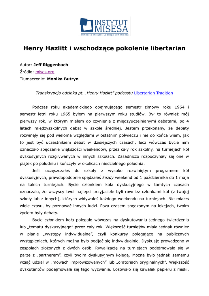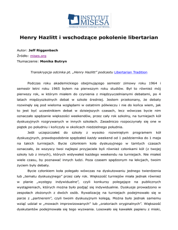 Henry Hazlitt i wschodzące pokolenie libertarian Autor: Jeff Riggenbach Źródło: mises.org Tłumaczenie: Monika Butryn Transkrypcja odcinka pt. „Henry Hazlitt” podcastu Libertarian Tradition Podczas roku akademickiego obejmującego semestr zimowy roku 1964 i semestr letni roku 1965 byłem na pierwszym roku studiów. Był to również mój pierwszy rok, w którym miałem do czynienia z międzyuczelnianymi debatami, po 4 latach międzyszkolnych debat w szkole średniej. Jestem przekonany, że debaty rozwinęły się pod wieloma względami w ostatnim półwieczu i nie do końca wiem, jak to jest być uczestnikiem debat w dzisiejszych czasach, lecz wówczas bycie nim oznaczało spędzanie większości weekendów, przez cały rok szkolny, na turniejach kół dyskusyjnych rozgrywanych w innych szkołach. Zasadniczo rozpoczynały się one w piątek po południu i kończyły w okolicach niedzielnego południa. Jeśli uczęszczałeś do szkoły z wysoko rozwiniętym programem kół dyskusyjnych, prawdopodobnie spędzałeś każdy weekend od 1 października do 1 maja na takich turniejach. Bycie członkiem koła dyskusyjnego w tamtych czasach oznaczało, że wszyscy twoi najlepsi przyjaciele byli również członkami kół (z twojej szkoły lub z innych), których widywałeś każdego weekendu na turniejach. Nie miałeś wiele czasu, by poznawać innych ludzi. Poza czasem spędzonym na lekcjach, twoim życiem były debaty. Bycie członkiem koła polegało wówczas na dyskutowaniu jednego twierdzenia lub „tematu dyskusyjnego” przez cały rok. Większość turniejów miała jednak również w planie „występy indywidualne”, czyli konkursy polegające na publicznych wystąpieniach, których można było podjąć się indywidualnie. Dyskusje prowadzono w zespołach złożonych z dwóch osób. Rywalizację na turniejach podejmowało się w parze z „partnerem”, czyli twoim dyskusyjnym kolegą. Można było jednak samemu wziąć udział w „mowach improwizowanych” lub „oratoriach oryginalnych”. Większość dyskutantów podejmowała się tego wyzwania. Losowało się kawałek papieru z miski, na którym widniał temat przemowy, dotyczący niedawnych wydarzeń na świecie i bieżących kontrowersji. Miało się 30 minut na ułożenie dziesięciominutowej mowy na wylosowany temat. By być przygotowanym na temat wylosowany z miski, trzeba było codziennie czytać gazety. Należało jednak również być na bieżąco z trzema tygodnikami: Time, Newsweekiem i U.S. News & Report, przez cały okres szkoły średniej i studiów oraz, wskutek wpojonego zwyczaju, przez wiele lat później. Ja w końcu odzwyczaiłem się od tego, lecz to już inna historia. Czytałem wówczas Time, Newsweek i U.S. News & Report co tydzień. Jednym z doświadczeń uzyskiwanych przez czytanie Newsweeka na początku lat 60. był dział o nazwie „Business Tides”. Tytuł sugerował, że jest to rubryka poświęcona wiadomościom biznesowym, ale tak naprawdę oferowała szeroki i wnikliwy komentarz na temat wszystkiego, co miało w jakikolwiek sposób do czynienia z ekonomią czy gospodarką. Prowadził ją mężczyzna o nazwisku Henry Hazlitt, który, jak się dowiedziałem, był również autorem krótkiej książki Ekonomia w jednej lekcji, opublikowanej pierwotnie w 1946 roku, kilka miesięcy przed moimi narodzinami. Przeczytałem tę książkę podczas roku akademickiego 1964/65 — mojego pierwszego roku studiów — gdy debatowaliśmy nad propozycją wprowadzenia przez rząd federalny narodowego programu prac publicznych dla bezrobotnych. Wówczas, jeśli pojawiłeś się na turnieju dyskusyjnym, musiałeś być przygotowanym zarówno na przedstawienie argumentów za kwestią poruszaną w danym roku — nazywało się to byciem po „pozytywnej” stronie debaty — albo zwalczaniem argumentów przedstawianych przez zespół przeciwników, którzy byli za kwestią – było po „negatywnej” stronie debaty. By przejść turniej, miałeś być po pozytywnej stronie w przynajmniej dwóch debatach i po negatywnej również minimum w dwóch. Większość dyskutantów, jak i większość ludzi, nie jest obdarzona zbytnią wyobraźnią. Na ogół są, jak nazwała ich Ayn Rand, „betonowcami” (concrete-bound): uwikłani w przyziemne szczegóły i niezdolni do dostrzeżenia większej, bardziej abstrakcyjnej perspektywy — posługując się banalnym powiedzeniem: niezdolni do ujrzenia lasu przez zbytnie poświęcanie uwagi pojedynczym drzewom. Dlatego większość drużyn dyskusyjnych w roku akademickim 1964/65 opowiadała się za federalnym programem prac publicznych dla bezrobotnych, opisując godne pożałowania położenie bezrobotnych rodaków; mówiąc o tym, jak to wolna gospodarka zawsze będzie miała mały odsetek bezrobotnych nie z własnej woli i twierdząc, że cudowne doświadczenie Works Projects Administration i powiązanych z nią programów w czasie Nowego Ładu ukazało, jak wielki sukces mogłyby odnieść projekty prac publicznych w łagodzeniu tego problemu. Nie chciałem podejmować tej kwestii w debacie w starciu z kompetentnym przeciwnikiem. Zbyt łatwo mógłby mnie pokonać. W gruncie rzeczy to była po prostu nieprawda. Wiedziałem, że bezrobotni Amerykanie w połowie lat 60. byli bodaj najbardziej dostatnimi biednymi ludźmi w dotychczasowej historii ludzkości. Wiedziałem, z lektury Ekonomii w jednej lekcji Henry'ego Hazlitta na początku semestru zimowego, że nie ma dobrowolnego bezrobocia w wolnej gospodarce, chyba że jest ono spowodowane przez rząd. Wiedziałem, że programy prac publicznych w czasie Nowego Ładu były dalekie od skuteczności, niezależnie od kryteriów oceny. Co więc ja i mój dyskusyjny kolega zrobilibyśmy, gdyby przyszło nam zająć pozytywną stronę w tej kwestii? Postanowiłem, że uciekniemy się do strategii zaskoczenia. Nie będziemy przekonywać, że panuje wysokie bezrobocie, lub że „bezrobocie strukturalne” jest nieuchronne w gos