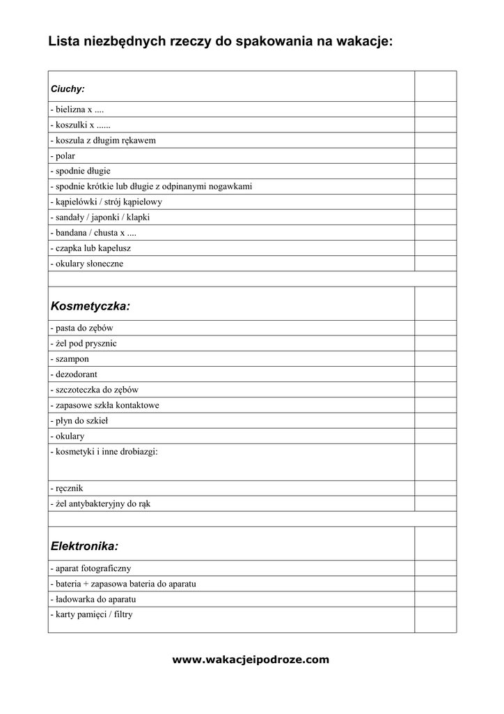 Lista niezbędnych rzeczy do spakowania na wakacje: Ciuchy: - bielizna x .... - koszulki x ...... - koszula z długim rękawem - polar - spodnie długie - spodnie krótkie lub długie z odpinanymi nogawkami - kąpielówki / strój kąpielowy - sandały / japonki / klapki - bandana / chusta x .... - czapka lub kapelusz - okulary słoneczne Kosmetyczka: - pasta do zębów - żel pod prysznic - szampon - dezodorant - szczoteczka do zębów - zapasowe szkła kontaktowe - płyn do szkieł - okulary - kosmetyki i inne drobiazgi: - ręcznik - żel antybakteryjny do rąk Elektronika: - aparat fotograficzny - bateria + zapasowa bateria do aparatu - ładowarka do aparatu - karty pamięci / filtry www.wakacjeipodroze.com - tablet + ładowarka - laptop + ładowarka - telefon - ładowarka do telefonu Apteczka: - bandaż elastyczny - zestaw plastrów - tabletki przeciwbólowe - tabletki na problemy żołądkowe np stoperan Inne: - okulary do pływania - polisa ubezpieczeniowa - potwierdzenia rezerwacji: - paszport - pieniądze - karty kredytowe - kopia paszportów - telefony do Ambasady, awaryjne telefony do banku, blokada kart kredytowych - statyw fotograficzny Inne wg uznania: Wydrukuj listę i po spakowaniu rzeczy zaznacz to w odpowiedniej rubryczce. www.wakacjeipodroze.com