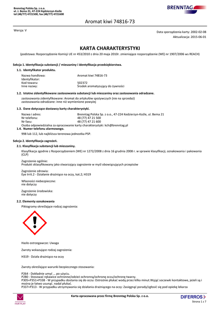Brenntag Polska Sp. z o.o. ul. J. Bema 21, 47-224 Kędzierzyn-Koźle tel (48/77) 4721500, fax (48/77) 4721600 Aromat kiwi 74816-73 Wersja: V Data sporządzenia karty: 2002-02-08 Aktualizacja: 2015-06-01 KARTA CHARAKTERYSTYKI (podstawa: Rozporządzenie Komisji UE nr 453/2010 z dnia 20 maja 2010r. zmieniające rozporządzenie (WE) nr 1907/2006 ws REACH) Sekcja 1. Identyfikacja substancji / mieszaniny i identyfikacja przedsiębiorstwa. 1.1. Identyfikator produktu. Nazwa handlowa: Identyfikator: Kod towaru: Inne nazwy: Aromat kiwi 74816-73 502372 Środek aromatyzujący do żywności 1.2. Istotne zidentyfikowane zastosowania substancji lub mieszaniny oraz zastosowania odradzane. zastosowania zidentyfikowane: Aromat do artykułów spożywczych (nie na sprzedaż) zastosowania odradzane: inne niż wymienione powyżej 1.3. Dane dotyczące dostawcy karty charakterystyki. Nazwa i adres: Brenntag Polska Sp. z o.o., 47-224 Kedzierzyn-Koźle, ul. Bema 21 Nr telefonu: 48 (77) 47 21 500 Nr faxu: 48 (77) 47 21 600 Osoba odpowiedzialna za opracowanie karty charakterystyki: [email protected] 1.4. Numer telefonu alarmowego. 998 lub 112, lub najbliższa terenowa jednostka PSP. Sekcja 2. Identyfikacja zagrożeń. 2.1. Klasyfikacja substancji lub mieszaniny. Klasyfikacja zgodnie z Rozporządzeniem (WE) nr 1272/2008 z dnia 16 grudnia 2008 r. w sprawie klasyfikacji, oznakowania i pakowania (CLP) Zagrożenie ogólnie: Produkt sklasyfikowany jako stwarzający zagrożenie w myśl obowiązujących przepisów Zagrożenie zdrowia: Eye Irrit.2 - Działanie drażniące na oczy, kat.2; H319 Własności niebezpieczne: nie dotyczy Zagrożenie środowiska: nie dotyczy 2.2. Elementy oznakowania Piktogramy określające rodzaj zagrożenia: Hasło ostrzegawcze: Uwaga Zwroty wskazujące rodzaj zagrożenia: H319 - Działa drażniąco na oczy Zwroty określające warunki bezpiecznego stosowania: P264 - Dokładnie umyć … po użyciu. P280 - Stosować rękawice ochronne/odzież ochronną/ochronę oczu/ochronę twarzy. P305+P351+P338 - W przypadku dostania się do oczu: Ostrożnie płukać wodą przez kilka minut.Wyjąć soczewki kontaktowe, jeżeli są i można je łatwo usunąć. nadal płukać. P337+P313 - W przypadku utrzymywania się działania drażniącego na oczy: Zasięgnąć porady/zgłosić się pod opiekę lekarza Karta opracowana przez firmę Brenntag Polska Sp. z o.o. Strona 1 z 7 Brenntag Polska Sp. z o.o. ul. J. Bema 21, 47-224 Kędzierzyn-Koźle tel (48/77) 4721500, fax (48/77) 4721600 Aromat kiwi 74816-73 2.3. Inne zagrożenia. brak dostępnych danych Sekcja 3. Skład / informacja o składnikach. Skład wg Rozporządzenia 1272/2008. >=20 - <25% malonian dietylu (Eye Irrit. 2; H319, CAS: 105-53-3; WE: 203-305-9) >=1 - <5% octan etylu (Flam. Liq. 2; H225, Eye Irrit. 2; H319, STOT SE 3; H336, CAS: 141-78-6; WE: 205-500-4; nr indeksowy: 607-022-00-5) >=1 - <5% kwas octowy (Flam. Liq. 3; H226, Skin Corr. 1A; H314, CAS: 64-19-7, WE: 200-580-7; nr indeksowy: 607-002-00-6) >=1 - <5% Kwas propionowy (Skin Corr. 1B; H314, CAS: 79-09-4; WE: 201-176-3; nr indeksowy: 607-089-00-0) >=0,1 - <% Octan heksylu (Flam. Liq. 3; H226, Aquatic Chronic 2; H411, CAS: 142-92-7, WE: 205-572-7) >=0,1 - <1% Undekan-4-olid (CAS: 104-67-6; WE: 203-225-4) O ile wymienione są składniki niebezpieczne, znaczenie zwrotów H podane jest w p. 16 karty charakterystyki. Sekcja 4. Środki pierwszej pomocy. 4.1. Opis środków pierwszej pomocy. Wdychanie: W razie narażenia inhalacyjnego wyprowadzic poszkodowanego z miejsca narażenia. W przypadku złego samopoczucia skontaktować się z lekarzem. Kontakt ze skórą: brak dostępnych danych Kontakt z oczami: W razie kontaktu z oczami natychmiast płukać wodą, przytrzymując odchylone powieki. Usunąć soczewki kontaktowe. Chronić nieuszkodzone oko. W przypadku objawów podrażnienia skontaktować się z lekarzem. Spożycie: W razie połknięcia zachowac drożność dróg oddechowych. Nie podawać mleka ani napojów alkoholowych. Nigdy nie podawać niczego do ust osobie nieprzytomnej. W przypadku złego samopoczucia wezwać lekarza. 4.2. Najważniejsze ostre i opóźnione objawy oraz skutki narażenia. brak dostępnych danych 4.3. Wskazania dotyczące wszelkiej natychmiastowej pomocy lekarskiej i szczególnego postępowania z poszkodowanym. brak dostępnych danych Sekcja 5. Postępowanie w przypadku pożaru. 5.1. Środki gaśnicze. proszki gaśnicze, piany odporne na działanie alkoholu, dwutlenek węgla, rozpylona woda 5.2. Szczególne zagrożenia związane z substancją lub mieszaniną. brak dostepnych danych 5.3. Informacje dla straży pożarnej. Stosować niezależny aparat oddechowy Sekcja 6. Postępowanie w przypadku niezamierzonego uwolnienia do środowiska. 6.1. Indywidualne środki ostrożności, wyposażenie ochronne i procedury w sytuacjach awaryjnych. Stosować środki ochrony osobistej. 6.2. Środki ostrożności w zakresie ochrony środowiska. Zapobiec przedostaniu się produktu do kanalizacji. Zapobiegać dalszemu wyciekowi lub rozlaniu jezeli to bezpieczne.W przypadku skażenia produktem rzek, jezior lub scieków powiadomić odpowiednie władze. 6.3. Metody i materiały zapobiegające rozprzestrzenianiu się skażenia i służące do usuwania skażenia. Rozlewy przysypać nieplanym materiałem chłonnym (piasek, ziemia, ziemia okrzemkowa), zebrać do zamykanego pojemnika i przekazać do zniszczenia. 6.4. Odniesienia do innych sekcji. Informacje dotyczące odpowiedniego sprzętu ochrony osobistej podano w sekcji 8. Usuwać zgodnie z zaleceniami przedstawionymi w sekcji 13 Sekcja 7. Postępowanie z substancjami i mieszaninami oraz ich magazynowanie. 7.1. Środki ostrożności dotyczące bezpiecznego postępowania. Nie wdychać oparów/pyłów. Unikać kontaktu ze skóra i oczami. . Palenie, jedzenie i picie powinno być zabronione w miejscu stosowaniu produktu. Karta opracowana przez firmę Brenntag Polska Sp. z o.o. Strona 2 z 7 Brenntag Polska Sp. z o.o. ul. J. Bema 21, 47-224 Kędzie