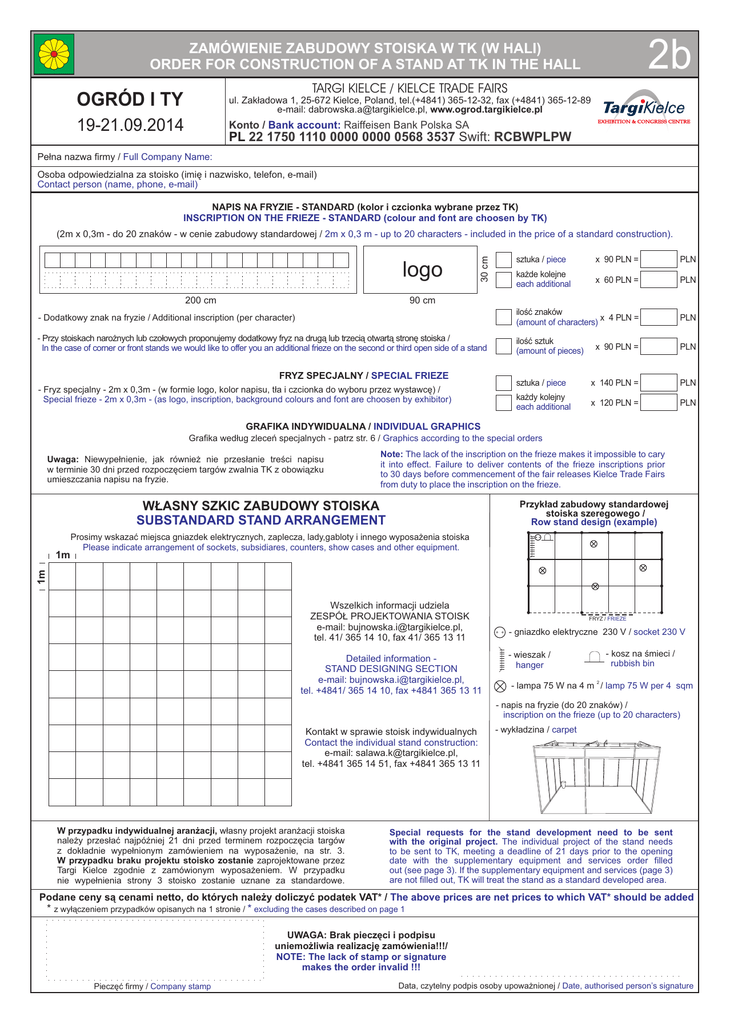2b ZAMÓWIENIE ZABUDOWY STOISKA W TK (W HALI) ORDER FOR CONSTRUCTION OF A STAND AT TK IN THE HALL TARGI KIELCE / KIELCE TRADE FAIRS OGRÓD I TY ul. Zak³adowa 1, 25-672 Kielce, Poland, tel.(+4841) 365-12-32, fax (+4841) 365-12-89 e-mail: [email protected], www.ogrod.targikielce.pl 19-21.09.2014 Konto / Bank account: Raiffeisen Bank Polska SA PL 22 1750 1110 0000 0000 0568 3537 Swift: RCBWPLPW Pe³na nazwa firmy / Full Company Name: Osoba odpowiedzialna za stoisko (imiê i nazwisko, telefon, e-mail) Contact person (name, phone, e-mail) NAPIS NA FRYZIE - STANDARD (kolor i czcionka wybrane przez TK) INSCRIPTION ON THE FRIEZE - STANDARD (colour and font are choosen by TK) (2m x 0,3m - do 20 znaków - w cenie zabudowy standardowej / 2m x 0,3 m - up to 20 characters - included in the price of a standard construction). x 90 PLN = PLN ka¿de kolejne each additional x 60 PLN = PLN - Dodatkowy znak na fryzie / Additional inscription (per character) iloœæ znaków (amount of characters) x 4 PLN = PLN - Przy stoiskach naro¿nych lub czo³owych proponujemy dodatkowy fryz na drug¹ lub trzeci¹ otwart¹ stronê stoiska / In the case of corner or front stands we would like to offer you an additional frieze on the second or third open side of a stand iloœæ sztuk (amount of pieces) x 90 PLN = PLN sztuka / piece x 140 PLN = PLN ka¿dy kolejny each additional x 120 PLN = PLN 200 cm 30 cm sztuka / piece logo 90 cm FRYZ SPECJALNY / SPECIAL FRIEZE - Fryz specjalny - 2m x 0,3m - (w formie logo, kolor napisu, t³a i czcionka do wyboru przez wystawcê) / Special frieze - 2m x 0,3m - (as logo, inscription, background colours and font are choosen by exhibitor) GRAFIKA INDYWIDUALNA / INDIVIDUAL GRAPHICS Grafika wed³ug zleceñ specjalnych - patrz str. 6 / Graphics according to the special orders Uwaga: Niewype³nienie, jak równie¿ nie przes³anie treœci napisu w terminie 30 dni przed rozpoczêciem targów zwalnia TK z obowi¹zku umieszczania napisu na fryzie. Note: The lack of the inscription on the frieze makes it impossible to cary it into effect. Failure to deliver contents of the frieze inscriptions prior to 30 days before commencement of the fair releases Kielce Trade Fairs from duty to place the inscription on the frieze. Przyk³ad zabudowy standardowej stoiska szeregowego / Row stand design (example) W£ASNY SZKIC ZABUDOWY STOISKA SUBSTANDARD STAND ARRANGEMENT 1m 1m Prosimy wskazaæ miejsca gniazdek elektrycznych, zaplecza, lady,gabloty i innego wyposa¿enia stoiska Please indicate arrangement of sockets, subsidiares, counters, show cases and other equipment. Wszelkich informacji udziela ZESPÓ£ PROJEKTOWANIA STOISK e-mail: [email protected], tel. 41/ 365 14 10, fax 41/ 365 13 11 Detailed information STAND DESIGNING SECTION e-mail: [email protected], tel. +4841/ 365 14 10, fax +4841 365 13 11 FRYZ / FRIEZE - gniazdko elektryczne 230 V / socket 230 V - kosz na œmieci / rubbish bin - wieszak / hanger 2 - lampa 75 W na 4 m / lamp 75 W per 4 sqm - napis na fryzie (do 20 znaków) / inscription on the frieze (up to 20 characters) Kontakt w sprawie stoisk indywidualnych Contact the individual stand construction: e-mail: [email protected], tel. +4841 365 14 51, fax +4841 365 13 11 W przypadku indywidualnej aran¿acji, w³asny projekt aran¿acji stoiska nale¿y przes³aæ najpóŸniej 21 dni przed terminem rozpoczêcia targów z dok³adnie wype³nionym zamówieniem na wyposa¿enie, na str. 3. W przypadku braku projektu stoisko zostanie zaprojektowane przez Targi Kielce zgodnie z zamówionym wyposa¿eniem. W przypadku nie wype³nienia strony 3 stoisko zostanie uznane za standardowe. - wyk³adzina / carpet Special requests for the stand development need to be sent with the original project. The individual project of the stand needs to be sent to TK, meeting a deadline of 21 days prior to the opening date with the supplementary equipment and services order filled out (see page 3). If the supplementary equipment and services (page 3) are not filled out, TK will treat the stand as a standard developed area. Podane ceny s¹ cenami netto, do których nale¿y doliczyæ podatek VAT* / The above prices are net prices to which VAT* should be added * z wy³¹czeniem przypadków opisanych na 1 stronie / * excluding the cases described on page 1 UWAGA: Brak pieczêci i podpisu uniemo¿liwia realizacjê zamówienia!!!/ NOTE: The lack of stamp or signature makes the order invalid !!! Pieczêæ firmy / Company stamp Data, czytelny podpis osoby upowa¿nionej / Date, authorised person’s signature