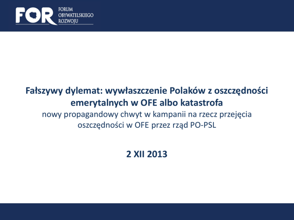 Fałszywy dylemat: wywłaszczenie Polaków z oszczędności emerytalnych w OFE albo katastrofa nowy propagandowy chwyt w kampanii na rzecz przejęcia oszczędności w OFE przez rząd PO-PSL 2 XII 2013 Rok temu rząd PO-PSL uspokajał, dzisiaj straszy: od oficjalnego optymizmu do katastrofizmu IV 2012 – minister Rostowski apeluje o wyłączenie licznika długu, przekonując, że sytuacja finansów publicznych jest dobra; rząd ignoruje apele o głęboką reformę finansów publicznych „ (…) Z rokiem 2011 skończył się w Polsce cykl wzrostu długu w relacji do PKB i zaczął się okres, kiedy dług w relacji do PKB zaczyna spadać. (…) Już w 2012 r. relacja państwowego długu publicznego do PKB powinna być niższa o całe 3 punkty procentowe i przy sprzyjających okolicznościach może spaść nawet poniżej 50% PKB. (…)” List otwarty ministra Rostowskiego IV 2012 X 2013 Ministerstwo Finansów twierdzi, że problem finansów publicznych ma charakter strukturalny „(…)Nierównowaga finansów publicznych w Polsce ma charakter trwały i w konsekwencji nawet w latach wysokiego wzrostu gospodarczego wynik sektora instytucji rządowych i samorządowych był ujemny. (…)” Uzasadnienie projektu ustawy o zmianie ustawy o finansach publicznych oraz niektórych innych ustaw z 2 X 2013, wprowadzającego regułę wydatkową Od połowy 2013 – koalicja PSL-PO sugeruje, że stoimy przed drastyczną alternatywą: albo wywłaszczenie Polaków z oszczędności emerytalnych, albo jakiś katastrofalny scenariusz „ (…) W warunkach roku 2014 r. podobny do uzyskanego efekt (tj. 20 mld zł) [podobny do nacjonalizacji] dałoby pozyskanie kwoty dodatkowych dochodów sektora finansów publicznych poprzez np. podniesienie stawek VAT (podstawowa 23% i obniżona 8%), które musiałyby wzrosnąć o ok. 4 punkty procentowe każda lub poprzez podniesienie obu stawek PIT o nieco ponad 3 punkty procentowe lub stawki podstawowej (18%) o blisko 3,5 punkty procentowe (…)” Uzasadnienie ustawy o zmianie niektórych ustaw w związku z określeniem zasad wypłaty emerytur ze środków zgromadzonych w otwartych funduszach emerytalnych, nacjonalizującej oszczędności emerytalne Polaków Wbrew sugestiom rządowym nikt z obrońców oszczędności emerytalnych Polaków zgromadzonych w OFE nie proponował podniesienia podatków o 20 mld zł. Deficyt można ograniczać bardziej stopniowo, działaniami które jednocześnie będą wspierały wzrost gospodarczy. 2 XII 2013 Rok temu rząd PO-PSL uspokajał, dzisiaj straszy: Zastanawiające zmiany oficjalnych prognoz (I) • Jeszcze w kwietniu 2013 rząd przewidywał, że bez wywłaszczenia oszczędności emerytalnych Polaków zgromadzonych w OFE, do 2014 roku deficyt zostanie ograniczony do poziomu zbliżonego do 3% PKB. Źródło: Aktualizacje Programu Konwergencji z IV 2012 i IV 2013 2 XII 2013 Rok temu rząd PO-PSL uspokajał, dzisiaj straszy: Zastanawiające zmiany oficjalnych prognoz (II) • Jeszcze w IV 2013 oficjalne prognozy sugerowały, że dług publiczny powinien się stabilizować, a nawet maleć. • W IX 2013 przedstawiono znacznie bardziej pesymistyczne prognozy długu na lata 2014-2015, bez wyjaśnienia przyczyn pogorszenia tych prognoz. Źródło: Rządowy projekt zmian w systemie emerytalnym, Strategie zarządzania długiem publicznym na lata 20132016 oraz na lata 2014-2017, Wieloletni plan finansowy państwa na lata 2012-2015 oraz na lata 2013-2016 2 XII 2013 Rok temu rząd PO-PSL uspokajał, dzisiaj straszy: Konsekwencje przekroczenia progów ostrożnościowych Z punktu widzenia ryzyka przekroczenia progów ostrożnościowych kluczowa jest krajowa definicja długu publicznego, czyli Państwowy Dług Publiczny. Przede wszystkim, w przeciwieństwie do metodologii unijnej (ESA 95) nie obejmuje ona m.in. zadłużenia Krajowego Funduszu Drogowego. Państwowy Dług Publiczny (% PKB), rządowe prognozy z IX 2013 ze skokiem na OFE bez skoku na OFE 2013 54.8% 54.8% 2014 47.1% 55.5% 2015 47.8% 56.9% 2016 47.1% 56.9% • Bez skoku na OFE, Państwowy Dług Publiczny tylko nieznacznie przekroczy próg 55% w 2014 roku • Do uniknięcia tego wystarczą oszczędności oraz prywatyzacja o łącznej wartości 8-10 mld zł w 2014 roku • Gdyby Państwowy Dług Publiczny przekroczył poziom 55,5% w 2014 roku, to zgodnie z proponowaną nową stabilizacyjną regułą wydatkową, będzie to zobowiązywało rząd do obniżenia tempa wzrostu większości wydatków GG w 2016 roku o 2 pkt. proc. wobec tempa wyznaczonego przez tę regułę. Przyjmując obecne rządowe prognozy tempa wzrostu PKB i inflacji w latach 2014-2017, oznaczałoby to obniżenie tempa wzrostu wydatków publicznych po wyłączeniu wydatków JST, NFZ i środków z UE z ok. 5,6% do 3,6%. W praktyce zmuszałoby to do redukcji wydatków w 2016 r. o ok. 0,7- 0,8% PKB, tj. ok. 12 mld zł w warunkach cen z 2013 r. Dług publiczny według ESA95 (% PKB), rządowe prognozy z IX 2013 ze skokiem na OFE bez skoku na OFE 2013 58.0% 54.8% 2014 49.9% 60.9% 2015 51.1% 61.2% 2016 50.8% 61.1% • Bez skoku na OFE dług publiczny w 2014 roku przekroczy poziom 60% • Nie ma bezpośrednich sankcji za przekroczenie progu ze strony Unii Europejskiej. Zarówno nieuchronność przekroczenia progów, jak i związane z nimi sankcje, są wyolbrzymiane przez rząd PO-PSL, w celu uzasadnienia wywłaszczenia Polaków z oszczędności emerytalnych zgromadzonych w OFE. Źródło: opracowanie własne na podstawie na podstawie rządowego projektu zmian w systemie emerytalnym oraz Strategii zarządzania długiem publicznym na lata 2013-2016 oraz na lata 2014-2017 2 XII 2013 Wywłaszczenie Polaków z oszczędności emerytalnych pozwoli rządowi PO-PSL na wyższe wydatki przed wyborami Założenia dotyczące tempa wzrostu PKB 2013 2014 2015 2016 Strategia z 2012 r. 2.2% 2.5% 3.5% 4.0% Strategia z 2013 r. 1.5% 2.5% 3.8% 4.3% Prognozowane zmiany długu publicznego (met. unijna) 3% 2,4% 1,1% 1,8% 1,2% 0,3% 0% 2013 -1,0% -3% -6% -9%
