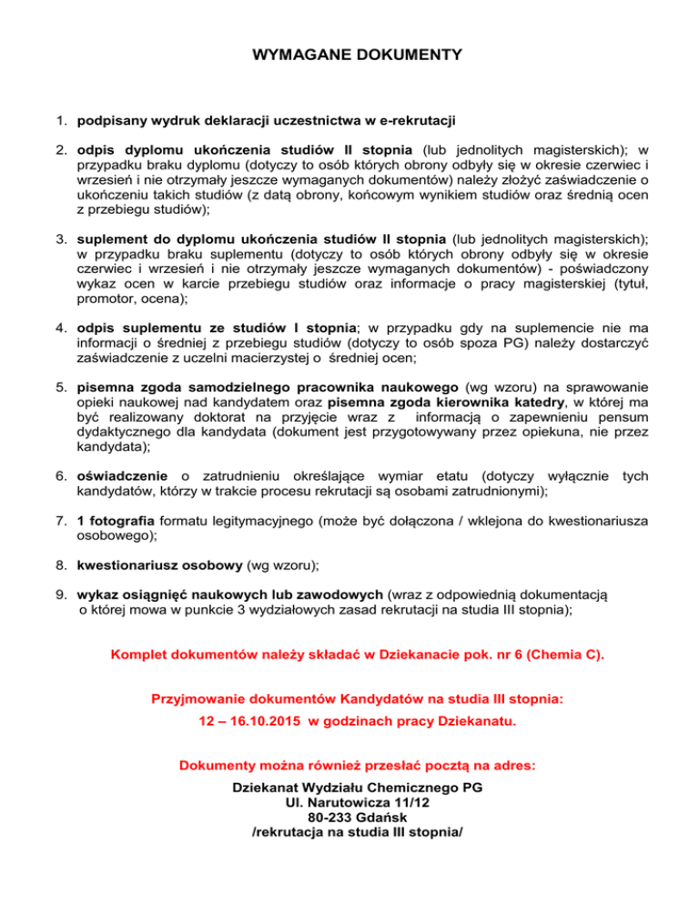 WYMAGANE DOKUMENTY 1. podpisany wydruk deklaracji uczestnictwa w e-rekrutacji 2. odpis dyplomu ukończenia studiów II stopnia (lub jednolitych magisterskich); w przypadku braku dyplomu (dotyczy to osób których obrony odbyły się w okresie czerwiec i wrzesień i nie otrzymały jeszcze wymaganych dokumentów) należy złożyć zaświadczenie o ukończeniu takich studiów (z datą obrony, końcowym wynikiem studiów oraz średnią ocen z przebiegu studiów); 3. suplement do dyplomu ukończenia studiów II stopnia (lub jednolitych magisterskich); w przypadku braku suplementu (dotyczy to osób których obrony odbyły się w okresie czerwiec i wrzesień i nie otrzymały jeszcze wymaganych dokumentów) - poświadczony wykaz ocen w karcie przebiegu studiów oraz informacje o pracy magisterskiej (tytuł, promotor, ocena); 4. odpis suplementu ze studiów I stopnia; w przypadku gdy na suplemencie nie ma informacji o średniej z przebiegu studiów (dotyczy to osób spoza PG) należy dostarczyć zaświadczenie z uczelni macierzystej o średniej ocen; 5. pisemna zgoda samodzielnego pracownika naukowego (wg wzoru) na sprawowanie opieki naukowej nad kandydatem oraz pisemna zgoda kierownika katedry, w której ma być realizowany doktorat na przyjęcie wraz z informacją o zapewnieniu pensum dydaktycznego dla kandydata (dokument jest przygotowywany przez opiekuna, nie przez kandydata); 6. oświadczenie o zatrudnieniu określające wymiar etatu (dotyczy wyłącznie tych kandydatów, którzy w trakcie procesu rekrutacji są osobami zatrudnionymi); 7. 1 fotografia formatu legitymacyjnego (może być dołączona / wklejona do kwestionariusza osobowego); 8. kwestionariusz osobowy (wg wzoru); 9. wykaz osiągnięć naukowych lub zawodowych (wraz z odpowiednią dokumentacją o której mowa w punkcie 3 wydziałowych zasad rekrutacji na studia III stopnia); Komplet dokumentów należy składać w Dziekanacie pok. nr 6 (Chemia C). Przyjmowanie dokumentów Kandydatów na studia III stopnia: 12 – 16.10.2015 w godzinach pracy Dziekanatu. Dokumenty można również przesłać pocztą na adres: Dziekanat Wydziału Chemicznego PG Ul. Narutowicza 11/12 80-233 Gdańsk /rekrutacja na studia III stopnia/
