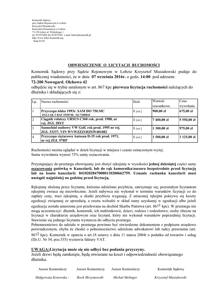 obwieszczenie - Komornik Sądowy Krzysztof Musiałowski