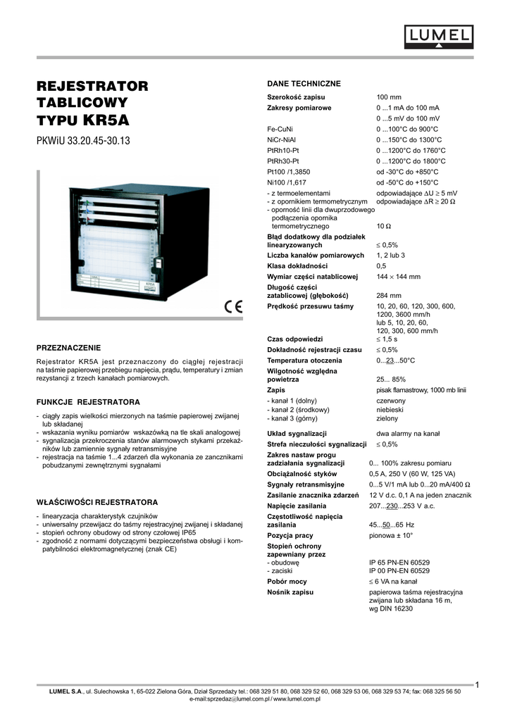 REJESTRATOR TABLICOWY TYPU KR5A DANE TECHNICZNE Fe-CuNi 0 ...100°C do 900°C PKWiU 33.20.45-30.13 NiCr-NiAl 0 ...150°C do 1300°C PtRh10-Pt 0 ...1200°C do 1760°C PtRh30-Pt 0 ...1200°C do 1800°C Pt100 /1,3850 od -30°C do +850°C Ni100 /1,617 od -50°C do +150°C Szerokoæ zapisu 100 mm Zakresy pomiarowe 0 ...1 mA do 100 mA 0 ...5 mV do 100 mV - z termoelementami odpowiadaj¹ce DU ³ 5 mV - z opornikiem termometrycznym odpowiadaj¹ce DR ³ 20 W - opornoæ linii dla dwuprzodowego pod³¹czenia opornika termometrycznego 10 W B³¹d dodatkowy dla podzia³ek linearyzowanych £ 0,5% Liczba kana³ów pomiarowych 1, 2 lub 3 Klasa dok³adnoci 0,5 Wymiar czêci natablicowej 144 ´ 144 mm D³ugoæ czêci zatablicowej (g³êbokoæ) 284 mm Prêdkoæ przesuwu tamy PRZEZNACZENIE Rejestrator KR5A jest przeznaczony do ci¹g³ej rejestracji na tamie papierowej przebiegu napiêcia, pr¹du, temperatury i zmian rezystancji z trzech kana³ach pomiarowych. FUNKCJE REJESTRATORA - ci¹g³y zapis wielkoci mierzonych na tamie papierowej zwijanej lub sk³adanej - wskazania wyniku pomiarów wskazówk¹ na tle skali analogowej - sygnalizacja przekroczenia stanów alarmowych stykami przekaników lub zamiennie sygna³y retransmisyjne - rejestracja na tamie 1...4 zdarzeñ dla wykonania ze zancznikami pobudzanymi zewnêtrznymi sygna³ami W£ACIWOCI REJESTRATORA - linearyzacja charakterystyk czujników uniwersalny przewijacz do tamy rejestracyjnej zwijanej i sk³adanej stopieñ ochrony obudowy od strony czo³owej IP65 zgodnoæ z normami dotycz¹cymi bezpieczeñstwa obs³ugi i kompatybilnoci elektromagnetycznej (znak CE) Czas odpowiedzi 10, 20, 60, 120, 300, 600, 1200, 3600 mm/h lub 5, 10, 20, 60, 120, 300, 600 mm/h £ 1,5 s Dok³adnoæ rejestracji czasu £ 0,5% Temperatura otoczenia 0...23...50°C Wilgotnoæ wzglêdna powietrza 25... 85% Zapis pisak flamastrowy, 1000 mb linii - kana³ 1 (dolny) - kana³ 2 (rodkowy) - kana³ 3 (górny) czerwony niebieski zielony Uk³ad sygnalizacji dwa alarmy na kana³ Strefa nieczu³oci sygnalizacji £ 0,5% Zakres nastaw progu zadzia³ania sygnalizacji 0... 100% zakresu pomiaru Obci¹¿alnoæ styków 0,5 A, 250 V (60 W, 125 VA) Sygna³y retransmisyjne 0...5 V/1 mA lub 0...20 mA/400 W Zasilanie znacznika zdarzeñ 12 V d.c. 0,1 A na jeden znacznik Napiêcie zasilania 207...230...253 V a.c. Czêstotliwoæ napiêcia zasilania 45...50...65 Hz Pozycja pracy pionowa ± 10° Stopieñ ochrony zapewniany przez - obudowê - zaciski IP 65 PN-EN 60529 IP 00 PN-EN 60529 Pobór mocy £ 6 VA na kana³ Nonik zapisu papierowa tama rejestracyjna zwijana lub sk³adana 16 m, wg DIN 16230 LUMEL S.A., ul. Sulechowska 1, 65-022 Zielona Góra, Dzia³ Sprzeda¿y tel.: 068 329 51 80, 068 329 52 60, 068 329 53 06, 068 329 53 74; fax: 068 325 56 50 e-mail:[email protected] / www.lumel.com.pl 1 Bezpieczeñstwo obs³ugi - kategoria instalacji - stopieñ zanieczyszczenia wg PN-EN 61010-1 II 2 SPOSÓB POD£¥CZENIA REJESTRATORA KOMPATYBILNOÆ ELEKTROMAGNETYCZNA emisja elektromagnetyczna wg PN-EN 61000-6-4 odpornoæ na zak³ócenia elektromagnetyczne wg PN-EN 61000-6-2 b³¹d dodatkowy od nara¿eñ elektromagnetycznych £ 1% WYMIARY ZEWNÊTRZNE I MONTA¯OWE 2 LUMEL S.A., ul. Sulechowska 1, 65-022 Zielona Góra, Dzia³ Sprzeda¿y tel.: 068 329 51 80, 068 329 52 60, 068 329 53 06, 068 329 53 74; fax: 068 325 56 50 e-mail:[email protected] / www.lumel.com.pl RODZAJE WYKONAÑ I SPOSÓB KODOWANIA Tabela 1 REJESTRATOR KOMPENSACYJNY TYPU KR5A Nr zakresu I kana³u (pisak dolny)1) Zakres pomiarowy (w miejsce XX wpisaæ dwucyfrowy zakres wg tabeli 2) ......................... XX Zakres niekatalogowy ............................................................................................................ 99 Znacznik zdarzeñ .................................................................................................................. 00 Nr zakresu II kana³u (pisak rodkowy) Zakres pomiarowy (w miejsce XX wpisaæ dwucyfrowy zakres wg tabeli 2) .................................. XX Zakres niekatalogowy ..................................................................................................................... 99 Bez kana³ów pomiarowych ............................................................................................................. 00 Nr zakresu III kana³u (pisak górny) Zakres pomiarowy (w miejsce XX wpisaæ dwucyfrowy zakres wg tabeli 2) ........................................... XX Zakres niekatalogowy .............................................................................................................................. 99 Bez kana³ów pomiarowych ...................................................................................................................... 00 Alarmy (po 2 na kana³) Wykonanie bez alarmów .................................................................................................................................... 0 Wykonanie z alarmami - styki zwierne ............................................................................................................... 1 Wykonanie z alarmami - styki rozwierne ........................................................................................................... 2 Sygna³y nadawcze (retransmisyjne) Bez sygna³u retransmisyjnego .................................................................................................................................. 0 Z sygna³em retransmisyjnym 0...20 mA2) ................................................................................................................. 1 Z sygna³em retransmisyjnym 0...5 V2) ...................................................................................................................... 2 Znacznik zdarzeñ Wykonanie bez znacznika ................................................................................................................................................. 0 Wykonanie z dwoma znacznikami 3) .........................