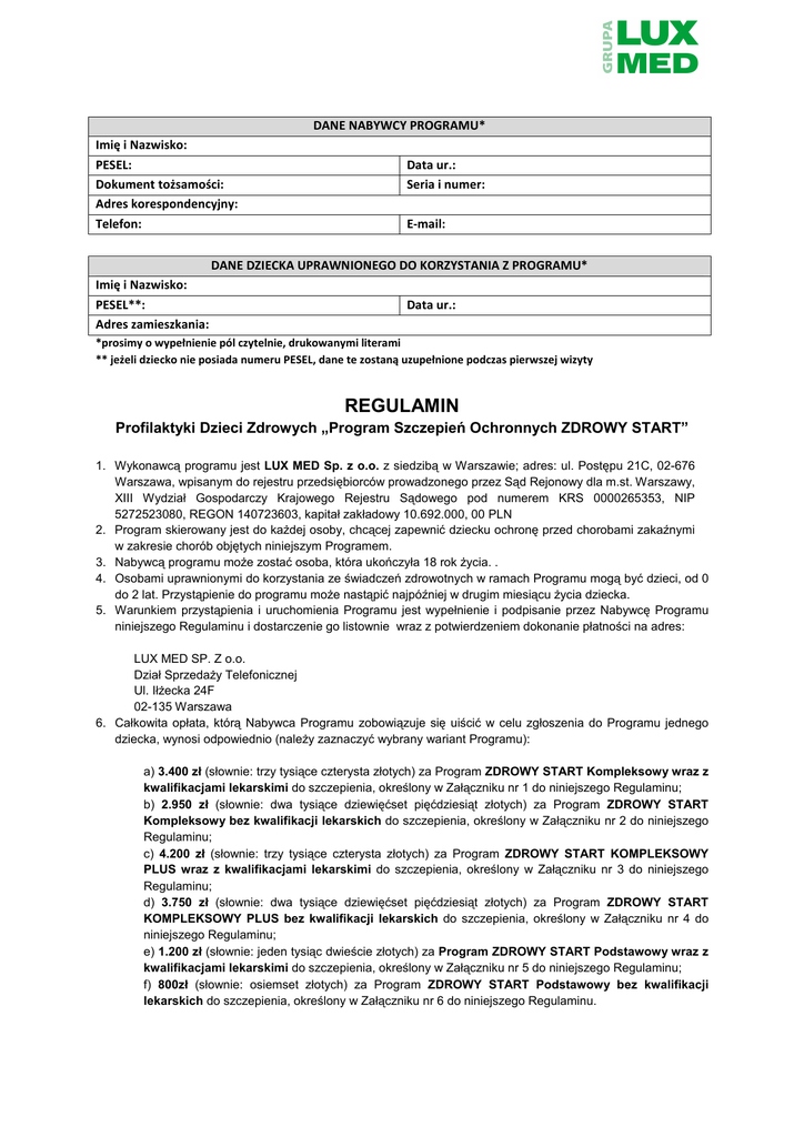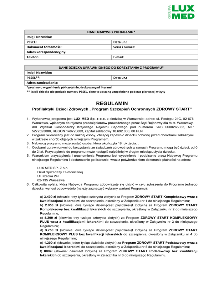 DANE NABYWCY PROGRAMU* Imię i Nazwisko: PESEL: Dokument tożsamości: Adres korespondencyjny: Telefon: Data ur.: Seria i numer: E-mail: DANE DZIECKA UPRAWNIONEGO DO KORZYSTANIA Z PROGRAMU* Imię i Nazwisko: PESEL**: Adres zamieszkania: Data ur.: *prosimy o wypełnienie pól czytelnie, drukowanymi literami ** jeżeli dziecko nie posiada numeru PESEL, dane te zostaną uzupełnione podczas pierwszej wizyty REGULAMIN Profilaktyki Dzieci Zdrowych „Program Szczepień Ochronnych ZDROWY START” 1. Wykonawcą programu jest LUX MED Sp. z o.o. z siedzibą w Warszawie; adres: ul. Postępu 21C, 02-676 Warszawa, wpisanym do rejestru przedsiębiorców prowadzonego przez Sąd Rejonowy dla m.st. Warszawy, XIII Wydział Gospodarczy Krajowego Rejestru Sądowego pod numerem KRS 0000265353, NIP 5272523080, REGON 140723603, kapitał zakładowy 10.692.000, 00 PLN 2. Program skierowany jest do każdej osoby, chcącej zapewnić dziecku ochronę przed chorobami zakaźnymi w zakresie chorób objętych niniejszym Programem. 3. Nabywcą programu może zostać osoba, która ukończyła 18 rok życia. . 4. Osobami uprawnionymi do korzystania ze świadczeń zdrowotnych w ramach Programu mogą być dzieci, od 0 do 2 lat. Przystąpienie do programu może nastąpić najpóźniej w drugim miesiącu życia dziecka. 5. Warunkiem przystąpienia i uruchomienia Programu jest wypełnienie i podpisanie przez Nabywcę Programu niniejszego Regulaminu i dostarczenie go listownie wraz z potwierdzeniem dokonanie płatności na adres: LUX MED SP. Z o.o. Dział Sprzedaży Telefonicznej Ul. Iłżecka 24F 02-135 Warszawa 6. Całkowita opłata, którą Nabywca Programu zobowiązuje się uiścić w celu zgłoszenia do Programu jednego dziecka, wynosi odpowiednio (należy zaznaczyć wybrany wariant Programu): a) 3.400 zł (słownie: trzy tysiące czterysta złotych) za Program ZDROWY START Kompleksowy wraz z kwalifikacjami lekarskimi do szczepienia, określony w Załączniku nr 1 do niniejszego Regulaminu; b) 2.950 zł (słownie: dwa tysiące dziewięćset pięćdziesiąt złotych) za Program ZDROWY START Kompleksowy bez kwalifikacji lekarskich do szczepienia, określony w Załączniku nr 2 do niniejszego Regulaminu; c) 4.200 zł (słownie: trzy tysiące czterysta złotych) za Program ZDROWY START KOMPLEKSOWY PLUS wraz z kwalifikacjami lekarskimi do szczepienia, określony w Załączniku nr 3 do niniejszego Regulaminu; d) 3.750 zł (słownie: dwa tysiące dziewięćset pięćdziesiąt złotych) za Program ZDROWY START KOMPLEKSOWY PLUS bez kwalifikacji lekarskich do szczepienia, określony w Załączniku nr 4 do niniejszego Regulaminu; e) 1.200 zł (słownie: jeden tysiąc dwieście złotych) za Program ZDROWY START Podstawowy wraz z kwalifikacjami lekarskimi do szczepienia, określony w Załączniku nr 5 do niniejszego Regulaminu; f) 800zł (słownie: osiemset złotych) za Program ZDROWY START Podstawowy bez kwalifikacji lekarskich do szczepienia, określony w Załączniku nr 6 do niniejszego Regulaminu. 7. Całkowita opłata za Program dokonywana jest z góry przelewem na indywidualny rachunek bankowy: LUX MED Sp. z o.o. ul. Postępu 21c, 02-676 Warszawa Numer rachunku: Tytuł przelewu: ZDROWY START IMIĘ I NAZWISKO PŁATNIKA 8. W momencie przystąpienia do Programu LUX MED sp. z o.o. gwarantuje dostępność do wszystkich szczepionek objętych Programem. W przypadku rezygnacji z Programu lub niewykonania wszystkich szczepień objętych Programem nie ma możliwości zwrócenia Państwu jakichkolwiek kosztów niewykorzystanych świadczeń, z wyłączeniem ważnych przyczyn, takich jak: zgon dziecka lub wydanie przez lekarza LUX MED orzeczenia lekarskiego o braku możliwości kontynuowania szczepień. W przypadku rezygnacji z Programu z ww. ważnych przyczyn zwrot kosztów dokonany będzie w wysokości: a. 95% całkowitej ceny Programu, gdy rezygnacja nastąpi przed rozpoczęciem korzystania ze świadczeń zdrowotnych w ramach Programu, z zastrzeżeniem odpowiednio lit. b lub c lub d poniżej; b. 25% całkowitej ceny Programu, gdy rezygnacja nastąpi w przeciągu pierwszych 6 miesięcy począwszy od przystąpienia do Programu, c. 15% całkowitej ceny Programu, gdy rezygnacja nastąpi między 7 a 12 miesiącem począwszy od przystąpienia do Programu, d. 10% całkowitej ceny Programu, gdy rezygnacja nastąpi po upływie 12 miesięcy począwszy od przystąpienia do Programu; 9. Rezygnacja z Programu może nastąpić na pisemny wniosek Nabywcy Programu. Rezygnację należy wysłać mailowo na adres: [email protected] lub pisemnie na adres: LUX MED SP. Z o.o. Dział Sprzedaży Telefonicznej Ul. Iłżecka 24F 02-135 Warszawa 10. Uprawnienia do świadczeń w ramach niniejszego produktu zostaną aktywowane w terminie 3 dni roboczych od otrzymania przez Lux Med Sp. Z o.o. podpisanego kompletnego Regulaminu wraz z dowodem dokonania wpłaty. 11. Obsługa w ramach Programu odbywa się w ogólnodostępnych placówkach własnych Lux Med, CM LIM, Medycyna Rodzinna, Promedis wymienionych w załączniku nr 5. 12. Program realizowany jest przez okres począwszy od dnia nadania uprawnień do osiągnięcia przez dziecko 2 lat. Wizyty związane ze szczepieniami powinny odbyć się w 2, 4, 6, 13 i 16 miesiącu życia dziecka. Ostateczny termin zakończenia programu upływa po 2 latach od dnia zakupu Programu, 13. Warunkiem udzielenia świadczenia w ramach Programu jest uprzednie uzgodnienie jego terminu. Termin udzielenia świadczenia w Centrach Medycznych uzgodnić należy z personelem recepcji odpowiedniej przychodni osobiście lub telefonicznie pod numerem ogólnopolskiej rezerwacji wizyt i badań (22) 333 22 888. 14. W celu realizacji usługi, pacjent powinien przybyć do Centrum Medycznego wraz z przedstawicielem ustawowym lub osobą upoważnioną pisemnie przez przedstawiciela ustawowego. Przedstawiciel ustawowy lub osoba przez niego upoważniona musi wylegitymować się dokumentem tożsamości. 15. Nie ma możliwości cesji na inną osobę niewykorzyst