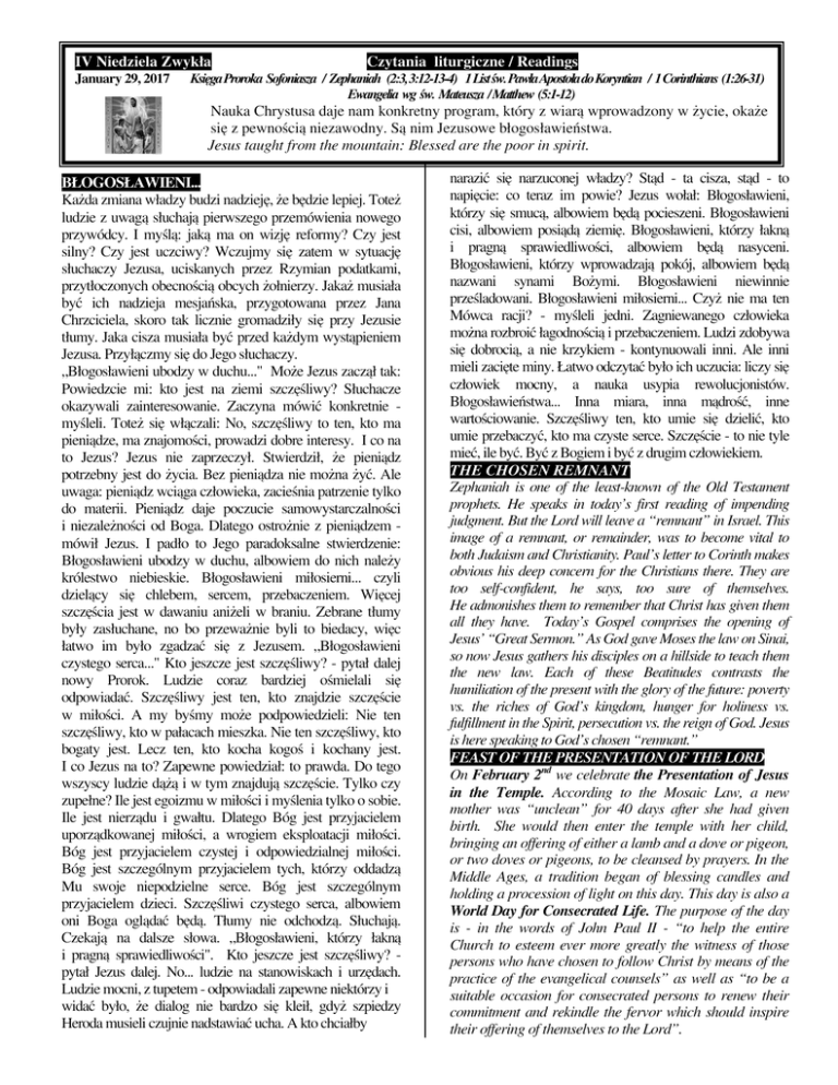 IV Niedziela Zwykła January 29, 2017 Czytania liturgiczne / Readings Księga Proroka Sofoniasza / Zephaniah (2:3, 3:12-13-4) 1 List św. Pawła Apostoła do Koryntian / 1 Corinthians (1:26-31) Ewangelia wg św. Mateusza / Matthew (5:1-12) Nauka Chrystusa daje nam konkretny program, który z wiarą wprowadzony w życie, okaże się z pewnością niezawodny. Są nim Jezusowe błogosławieństwa. Jesus taught from the mountain: Blessed are the poor in spirit. BŁOGOSŁAWIENI... Każda zmiana władzy budzi nadzieję, że będzie lepiej. Toteż ludzie z uwagą słuchają pierwszego przemówienia nowego przywódcy. I myślą: jaką ma on wizję reformy? Czy jest silny? Czy jest uczciwy? Wczujmy się zatem w sytuację słuchaczy Jezusa, uciskanych przez Rzymian podatkami, przytłoczonych obecnością obcych żołnierzy. Jakaż musiała być ich nadzieja mesjańska, przygotowana przez Jana Chrzciciela, skoro tak licznie gromadziły się przy Jezusie tłumy. Jaka cisza musiała być przed każdym wystąpieniem Jezusa. Przyłączmy się do Jego słuchaczy. „Błogosławieni ubodzy w duchu..." Może Jezus zaczął tak: Powiedzcie mi: kto jest na ziemi szczęśliwy? Słuchacze okazywali zainteresowanie. Zaczyna mówić konkretnie myśleli. Toteż się włączali: No, szczęśliwy to ten, kto ma pieniądze, ma znajomości, prowadzi dobre interesy. I co na to Jezus? Jezus nie zaprzeczył. Stwierdził, że pieniądz potrzebny jest do życia. Bez pieniądza nie można żyć. Ale uwaga: pieniądz wciąga człowieka, zacieśnia patrzenie tylko do materii. Pieniądz daje poczucie samowystarczalności i niezależności od Boga. Dlatego ostrożnie z pieniądzem mówił Jezus. I padło to Jego paradoksalne stwierdzenie: Błogosławieni ubodzy w duchu, albowiem do nich należy królestwo niebieskie. Błogosławieni miłosierni... czyli dzielący się chlebem, sercem, przebaczeniem. Więcej szczęścia jest w dawaniu aniżeli w braniu. Zebrane tłumy były zasłuchane, no bo przeważnie byli to biedacy, więc łatwo im było zgadzać się z Jezusem. „Błogosławieni czystego serca..." Kto jeszcze jest szczęśliwy? - pytał dalej nowy Prorok. Ludzie coraz bardziej ośmielali się odpowiadać. Szczęśliwy jest ten, kto znajdzie szczęście w miłości. A my byśmy może podpowiedzieli: Nie ten szczęśliwy, kto w pałacach mieszka. Nie ten szczęśliwy, kto bogaty jest. Lecz ten, kto kocha kogoś i kochany jest. I co Jezus na to? Zapewne powiedział: to prawda. Do tego wszyscy ludzie dążą i w tym znajdują szczęście. Tylko czy zupełne? Ile jest egoizmu w miłości i myślenia tylko o sobie. Ile jest nierządu i gwałtu. Dlatego Bóg jest przyjacielem uporządkowanej miłości, a wrogiem eksploatacji miłości. Bóg jest przyjacielem czystej i odpowiedzialnej miłości. Bóg jest szczególnym przyjacielem tych, którzy oddadzą Mu swoje niepodzielne serce. Bóg jest szczególnym przyjacielem dzieci. Szczęśliwi czystego serca, albowiem oni Boga oglądać będą. Tłumy nie odchodzą. Słuchają. Czekają na dalsze słowa. „Błogosławieni, którzy łakną i pragną sprawiedliwości". Kto jeszcze jest szczęśliwy? pytał Jezus dalej. No... ludzie na stanowiskach i urzędach. Ludzie mocni, z tupetem - odpowiadali zapewne niektórzy i widać było, że dialog nie bardzo się kleił, gdyż szpiedzy Heroda musieli czujnie nadstawiać ucha. A kto chciałby narazić się narzuconej władzy? Stąd - ta cisza, stąd - to napięcie: co teraz im powie? Jezus wołał: Błogosławieni, którzy się smucą, albowiem będą pocieszeni. Błogosławieni cisi, albowiem posiądą ziemię. Błogosławieni, którzy łakną i pragną sprawiedliwości, albowiem będą nasyceni. Błogosławieni, którzy wprowadzają pokój, albowiem będą nazwani synami Bożymi. Błogosławieni niewinnie prześladowani. Błogosławieni miłosierni... Czyż nie ma ten Mówca racji? - myśleli jedni. Zagniewanego człowieka można rozbroić łagodnością i przebaczeniem. Ludzi zdobywa się dobrocią, a nie krzykiem - kontynuowali inni. Ale inni mieli zacięte miny. Łatwo odczytać było ich uczucia: liczy się człowiek mocny, a nauka usypia rewolucjonistów. Błogosławieństwa... Inna miara, inna mądrość, inne wartościowanie. Szczęśliwy ten, kto umie się dzielić, kto umie przebaczyć, kto ma czyste serce. Szczęście - to nie tyle mieć, ile być. Być z Bogiem i być z drugim człowiekiem. THE CHOSEN REMNANT Zephaniah is one of the least-known of the Old Testament prophets. He speaks in today’s first reading of impending judgment. But the Lord will leave a “remnant” in Israel. This image of a remnant, or remainder, was to become vital to both Judaism and Christianity. Paul’s letter to Corinth makes obvious his deep concern for the Christians there. They are too self-confident, he says, too sure of themselves. He admonishes them to remember that Christ has given them all they have. Today’s Gospel comprises the opening of Jesus’ “Great Sermon.” As God gave Moses the law on Sinai, so now Jesus gathers his disciples on a hillside to teach them the new law. Each of these Beatitudes contrasts the humiliation of the present with the glory of the future: poverty vs. the riches of God’s kingdom, hunger for holiness vs. fulfillment in the Spirit, persecution vs. the reign of God. Jesus is here speaking to God’s chosen “remnant.” FEAST OF THE PRESENTATION OF THE LORD On February 2nd we celebrate the Presentation of Jesus in the Temple. According to the Mosaic Law, a new mother was “unclean” for 40 days after she had given birth. She would then enter the temple with her child, bringing an offering of either a lamb and a dove or pigeon, or two doves or pigeons, to be cleansed by prayers. In the Middle Ages, a tradition began of blessing candles and holding a procession of light on this day. This day is also a World Day for Consecrated Life. The purpose of the day is - in the words of John Paul II - “to help th
