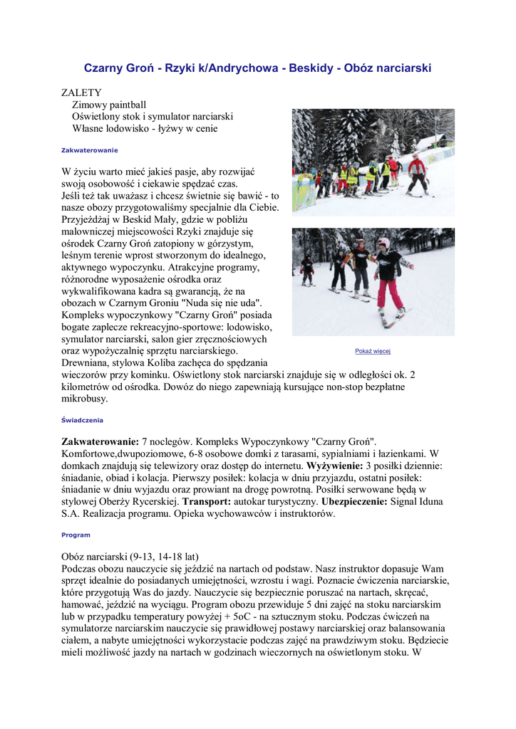Czarny Groń - Rzyki k/Andrychowa - Beskidy - Obóz narciarski ZALETY Zimowy paintball Oświetlony stok i symulator narciarski Własne lodowisko - łyżwy w cenie Zakwaterowanie W życiu warto mieć jakieś pasje, aby rozwijać swoją osobowość i ciekawie spędzać czas. Jeśli też tak uważasz i chcesz świetnie się bawić - to nasze obozy przygotowaliśmy specjalnie dla Ciebie. Przyjeżdżaj w Beskid Mały, gdzie w pobliżu malowniczej miejscowości Rzyki znajduje się ośrodek Czarny Groń zatopiony w górzystym, leśnym terenie wprost stworzonym do idealnego, aktywnego wypoczynku. Atrakcyjne programy, różnorodne wyposażenie ośrodka oraz wykwalifikowana kadra są gwarancją, że na obozach w Czarnym Groniu "Nuda się nie uda". Kompleks wypoczynkowy "Czarny Groń" posiada bogate zaplecze rekreacyjno-sportowe: lodowisko, symulator narciarski, salon gier zręcznościowych Pokaż więcej oraz wypożyczalnię sprzętu narciarskiego. Drewniana, stylowa Koliba zachęca do spędzania wieczorów przy kominku. Oświetlony stok narciarski znajduje się w odległości ok. 2 kilometrów od ośrodka. Dowóz do niego zapewniają kursujące non-stop bezpłatne mikrobusy. Świadczenia Zakwaterowanie: 7 noclegów. Kompleks Wypoczynkowy "Czarny Groń". Komfortowe,dwupoziomowe, 6-8 osobowe domki z tarasami, sypialniami i łazienkami. W domkach znajdują się telewizory oraz dostęp do internetu. Wyżywienie: 3 posiłki dziennie: śniadanie, obiad i kolacja. Pierwszy posiłek: kolacja w dniu przyjazdu, ostatni posiłek: śniadanie w dniu wyjazdu oraz prowiant na drogę powrotną. Posiłki serwowane będą w stylowej Oberży Rycerskiej. Transport: autokar turystyczny. Ubezpieczenie: Signal Iduna S.A. Realizacja programu. Opieka wychowawców i instruktorów. Program Obóz narciarski (9-13, 14-18 lat) Podczas obozu nauczycie się jeździć na nartach od podstaw. Nasz instruktor dopasuje Wam sprzęt idealnie do posiadanych umiejętności, wzrostu i wagi. Poznacie ćwiczenia narciarskie, które przygotują Was do jazdy. Nauczycie się bezpiecznie poruszać na nartach, skręcać, hamować, jeździć na wyciągu. Program obozu przewiduje 5 dni zajęć na stoku narciarskim lub w przypadku temperatury powyżej + 5oC - na sztucznym stoku. Podczas ćwiczeń na symulatorze narciarskim nauczycie się prawidłowej postawy narciarskiej oraz balansowania ciałem, a nabyte umiejętności wykorzystacie podczas zajęć na prawdziwym stoku. Będziecie mieli możliwość jazdy na nartach w godzinach wieczornych na oświetlonym stoku. W programie także video lekcje - aby zwiększyć rezultaty szkolenia narciarskiego, nagramy Wasze przejazdy na kamerze i wspólnie będziemy je analizować. Na podstawie zebranego materiału instruktorzy będą mogli udzielić Wam wskazówek na dalsze lekcje. Na zakończenie obozu podsumujemy nabyte umiejętności i wręczymy Wam certyfikaty. Nasz ośrodek zapewni Wam obiad na stoku podczas całodziennych zajęć. Dodatkowo będziecie mogli przejechać się na ski trikke - pojeździe na trzech płozach, który pozwala wykonywać ciekawe ewolucje i swobodnie poruszać się po stoku. Poznacie różne gry i zabawy integracyjne na śniegu. Niezapomnianych wrażeń dostarczy również przejażdżka ratrakiem. Podczas obozu będzie mieli możliwość dwukrotnego skorzystania z lodowiska (wypożyczenie łyżew w cenie). Program fakultatywny Poza zajęciami specjalistycznymi, związanymi z wybranym typem aktywności, czekają na Was zajęcia wspólne dla wszystkich obozów: ski orienteering - terenoznawstwo w zimowych warunkach, śnieżny patrol - zabawa, podczas której uczestnicy, podzieleni na zespoły, będą pokonywać trasę bogatą w wiele niespodzianek i zadań, nauka wiązania węzłów, których zastosowanie przyda się w życiu, pierwsza pomoc - jak wezwać pomoc w górach, udzielić pomocy osobie poszkodowanej itd. Kulig z pochodniami po beskidzkich bezdrożach, ogniska, zabawy i gry integracyjne uatrakcyjnią pobyt na naszych obozach. - paintball na małych markerach lub markerach M4 - 30 PLN (w tym wypożyczenie sprzętu + 100 kul); - dodatkowe kulki paintballowe: 15 sztuk na małe markery - 5 PLN; 50 sztuk na duże markery - 10 PLN; - przejażdżka ratrakiem - 25 PLN. Uwagi Zajęcia prowadzone są przez wykwalifikowanych instruktorów i wychowawców z zastosowaniem wszelkich niezbędnych elementów zapewniających bezpieczeństwo (uprzęże asekuracyjne, kaski, kamizelki, ochraniacze). Wszystkie zajęcia będą dopasowane do warunków atmosferycznych oraz stanu psychofizycznego uczestników. Uczestnicy kursu narciarskiego powinni zabrać ze sobą sprzęt narciarski z obowiązkowym kaskiem oraz mile widziane (nieobowiązkowo) łyżwy, nakolanniki, nałokietniki, kask hokejowy, kij hokejowy. Zachęcamy także uczestników obozu RPG do zabrania wszelkich strojów larpowych, rekwizytów, gier planszowych czy karcianych i kostek do gry. Cena nie obejmuje dopłaty za transport z miast wyszczególnionych w planie podróży. Informacje praktyczne Cena karnetu: ok. 150-170 PLN (dotyczy uczestników obozu narciarskiego). Wypożyczenia sprzętu narciarskiego: (buty, narty, kijki, kask) - koszt ok. 30 PLN /dzień. Warunki uczestnictwa Warunki promocji Informacje dodatkowe OWU Signal Iduna Travel ISIC-sprawdź Terminy i ceny Nr Data Obóz narciarski Cena Cena (skrót: KPZAON) grupy ISIC KPZA01 17.01 - 24.01 1099 zł 999 zł Promocja Plan podróży 949 zł KPZA02 24.01 - 31.01 1099 zł 999 zł Promocja Plan podróży 949 zł KPZA03 31.01 - 07.02 1099 zł 999 zł Promocja Plan podróży 949 zł KPZA04 07.02 - 14.02 1099 zł 999 zł Promocja Plan podróży 949 zł KPZA05 14.02 - 21.02 1099 zł Plan podróży 1049 zł Rezerwuj kalkulator Rezerwuj kalkulator Rezerwuj kalkulator Rezerwuj kalkulator Rezerwuj kalkulator 8 dni 8 dni 8 dni 8 dni 8 dni
