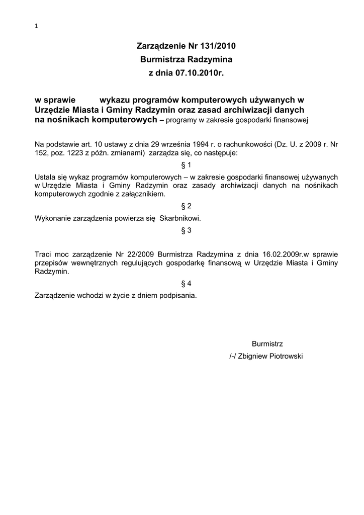 Zarządzenie Nr 131/2010 Burmistrza Radzymina w sprawie wykazu