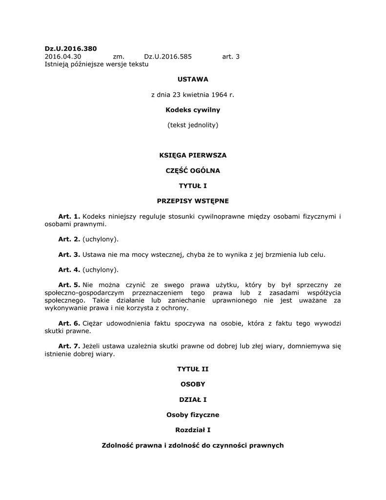 Dz.U.2016.380 2016.04.30 zm. Dz.U.2016.585 Istnieją późniejsze wersje tekstu art. 3 USTAWA z dnia 23 kwietnia 1964 r. Kodeks cywilny (tekst jednolity) KSIĘGA PIERWSZA CZĘŚĆ OGÓLNA TYTUŁ I PRZEPISY WSTĘPNE Art. 1. Kodeks niniejszy reguluje stosunki cywilnoprawne między osobami fizycznymi i osobami prawnymi. Art. 2. (uchylony). Art. 3. Ustawa nie ma mocy wstecznej, chyba że to wynika z jej brzmienia lub celu. Art. 4. (uchylony). Art. 5. Nie można czynić ze swego prawa użytku, który by był sprzeczny ze społeczno-gospodarczym przeznaczeniem tego prawa lub z zasadami współżycia społecznego. Takie działanie lub zaniechanie uprawnionego nie jest uważane za wykonywanie prawa i nie korzysta z ochrony. Art. 6. Ciężar udowodnienia faktu spoczywa na osobie, która z faktu tego wywodzi skutki prawne. Art. 7. Jeżeli ustawa uzależnia skutki prawne od dobrej lub złej wiary, domniemywa się istnienie dobrej wiary. TYTUŁ II OSOBY DZIAŁ I Osoby fizyczne Rozdział I Zdolność prawna i zdolność do czynności prawnych Art. 8. § 1. Każdy człowiek od chwili urodzenia ma zdolność prawną. § 2. (uchylony). Art. 9. W razie urodzenia się dziecka domniemywa się, że przyszło ono na świat żywe. Art. 10. § 1. Pełnoletnim jest, kto ukończył lat osiemnaście. § 2. Przez zawarcie małżeństwa małoletni uzyskuje pełnoletność. Nie traci jej w razie unieważnienia małżeństwa. Art. 11. Pełną zdolność do czynności prawnych nabywa się z chwilą uzyskania pełnoletności. Art. 12. Nie mają zdolności do czynności prawnych osoby, które nie ukończyły lat trzynastu, oraz osoby ubezwłasnowolnione całkowicie. Art. 13. § 1. Osoba, która ukończyła lat trzynaście, może być ubezwłasnowolniona całkowicie, jeżeli wskutek choroby psychicznej, niedorozwoju umysłowego albo innego rodzaju zaburzeń psychicznych, w szczególności pijaństwa lub narkomanii, nie jest w stanie kierować swym postępowaniem. § 2. Dla ubezwłasnowolnionego całkowicie ustanawia się opiekę, chyba że pozostaje on jeszcze pod władzą rodzicielską. Art. 14. § 1. Czynność prawna dokonana przez osobę, która nie ma zdolności do czynności prawnych, jest nieważna. § 2. Jednakże gdy osoba niezdolna do czynności prawnych zawarła umowę należącą do umów powszechnie zawieranych w drobnych bieżących sprawach życia codziennego, umowa taka staje się ważna z chwilą jej wykonania, chyba że pociąga za sobą rażące pokrzywdzenie osoby niezdolnej do czynności prawnych. Art. 15. Ograniczoną zdolność do czynności prawnych mają małoletni, którzy ukończyli lat trzynaście, oraz osoby ubezwłasnowolnione częściowo. Art. 16. § 1. Osoba pełnoletnia może być ubezwłasnowolniona częściowo z powodu choroby psychicznej, niedorozwoju umysłowego albo innego rodzaju zaburzeń psychicznych, w szczególności pijaństwa lub narkomanii, jeżeli stan tej osoby nie uzasadnia ubezwłasnowolnienia całkowitego, lecz potrzebna jest pomoc do prowadzenia jej spraw. § 2. Dla osoby ubezwłasnowolnionej częściowo ustanawia się kuratelę. Art. 17. Z zastrzeżeniem wyjątków w ustawie przewidzianych, do ważności czynności prawnej, przez którą osoba ograniczona w zdolności do czynności prawnych zaciąga zobowiązanie lub rozporządza swoim prawem, potrzebna jest zgoda jej przedstawiciela ustawowego. Art. 18. § 1. Ważność umowy, która została zawarta przez osobę ograniczoną w zdolności do czynności prawnych bez wymaganej zgody przedstawiciela ustawowego, zależy od potwierdzenia umowy przez tego przedstawiciela. § 2. Osoba ograniczona w zdolności do czynności prawnych może sama potwierdzić umowę po uzyskaniu pełnej zdolności do czynności prawnych. § 3. Strona, która zawarła umowę z osobą ograniczoną w zdolności do czynności prawnych, nie może powoływać się na brak zgody jej przedstawiciela ustawowego. Może jednak wyznaczyć temu przedstawicielowi odpowiedni termin do potwierdzenia umowy; staje się wolna po bezskutecznym upływie wyznaczonego terminu. Art. 19. Jeżeli osoba ograniczona w zdolności do czynności prawnych dokonała sama jednostronnej czynności prawnej, do której ustawa wymaga zgody przedstawiciela ustawowego, czynność jest nieważna. Art. 20. Osoba ograniczona w zdolności do czynności prawnych może bez zgody przedstawiciela ustawowego zawierać umowy należące do umów powszechnie zawieranych w drobnych bieżących sprawach życia codziennego. Art. 21. Osoba ograniczona w zdolności do czynności prawnych może bez zgody przedstawiciela ustawowego rozporządzać swoim zarobkiem, chyba że sąd opiekuńczy z ważnych powodów inaczej postanowi. Art. 22. Jeżeli przedstawiciel ustawowy osoby ograniczonej w zdolności do czynności prawnych oddał jej określone przedmioty majątkowe do swobodnego użytku, osoba ta uzyskuje pełną zdolność w zakresie czynności prawnych, które tych przedmiotów dotyczą. Wyjątek stanowią czynności prawne, do których dokonania nie wystarcza według ustawy zgoda przedstawiciela ustawowego. Art. 221. Za konsumenta uważa się osobę fizyczną dokonującą z przedsiębiorcą czynności prawnej niezwiązanej bezpośrednio z jej działalnością gospodarczą lub zawodową. Art. 23. Dobra osobiste człowieka, jak w szczególności zdrowie, wolność, cześć, swoboda sumienia, nazwisko lub pseudonim, wizerunek, tajemnica korespondencji, nietykalność mieszkania, twórczość naukowa, artystyczna, wynalazcza i racjonalizatorska, pozostają pod ochroną prawa cywilnego niezależnie od ochrony przewidzianej w innych przepisach. Art. 24. § 1. Ten, czyje dobro osobiste zostaje zagrożone cudzym działaniem, może żądać zaniechania tego działania, chyba że nie jest ono bezprawne. W razie dokonanego naruszenia może on także żądać, ażeby osoba, która dopuściła się naruszenia, dopełniła czynności potrzebnych do usunięcia jego skutków, w szczególności ażeby złożyła ośw
