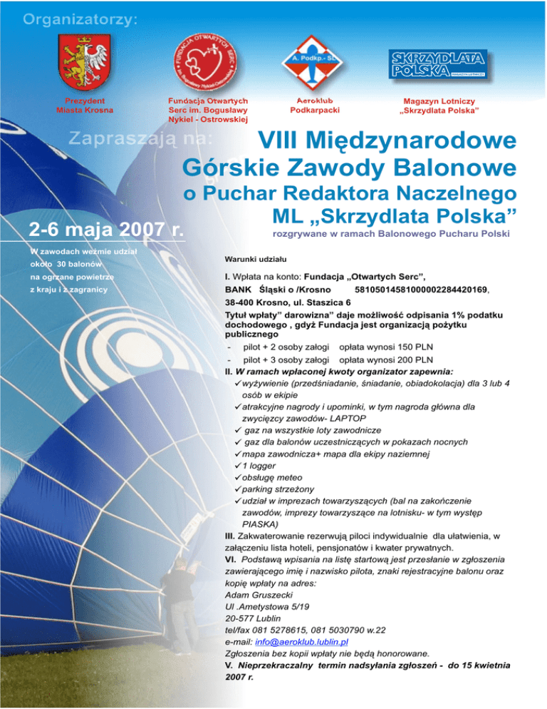 Prezydent Miasta Krosna Fundacja Otwartych Serc im. Bogusławy Nykiel - Ostrowskiej Aeroklub Podkarpacki Magazyn Lotniczy „Skrzydlata Polska” VIII Międzynarodowe Górskie Zawody Balonowe o Puchar Redaktora Naczelnego ML „Skrzydlata Polska” 2-6 maja 2007 r. rozgrywane w ramach Balonowego Pucharu Polski W zawodach weźmie udział około 30 balonów Warunki udziału na ogrzane powietrze I. Wpłata na konto: Fundacja „Otwartych Serc”, z kraju i z zagranicy BANK Śląski o /Krosno 58105014581000002284420169, 38-400 Krosno, ul. Staszica 6 Tytuł wpłaty” darowizna” daje możliwość odpisania 1% podatku dochodowego , gdyż Fundacja jest organizacją pożytku publicznego - pilot + 2 osoby załogi opłata wynosi 150 PLN - pilot + 3 osoby załogi opłata wynosi 200 PLN II. W ramach wpłaconej kwoty organizator zapewnia: üwyżywienie (przedśniadanie, śniadanie, obiadokolacja) dla 3 lub 4 osób w ekipie üatrakcyjne nagrody i upominki, w tym nagroda główna dla zwycięzcy zawodów- LAPTOP ü gaz na wszystkie loty zawodnicze ü gaz dla balonów uczestniczących w pokazach nocnych ümapa zawodnicza+ mapa dla ekipy naziemnej ü1 logger üobsługę meteo üparking strzeżony üudział w imprezach towarzyszących (bal na zakończenie zawodów, imprezy towarzyszące na lotnisku- w tym występ PIASKA) III. Zakwaterowanie rezerwują piloci indywidualnie dla ułatwienia, w załączeniu lista hoteli, pensjonatów i kwater prywatnych. VI. Podstawą wpisania na listę startową jest przesłanie w zgłoszenia zawierającego imię i nazwisko pilota, znaki rejestracyjne balonu oraz kopię wpłaty na adres: Adam Gruszecki Ul .Ametystowa 5/19 20-577 Lublin tel/fax 081 5278615, 081 5030790 w.22 e-mail: [email protected] Zgłoszenia bez kopii wpłaty nie będą honorowane. V. Nieprzekraczalny termin nadsyłania zgłoszeń - do 15 kwietnia 2007 r. Prezydent Miasta Krosna Fundacja Otwartych Serc im. Bogusławy Nykiel - Ostrowskiej Aeroklub Podkarpacki Magazyn Lotniczy „Skrzydlata Polska” VIII Międzynarodowe Górskie Zawody Balonowe o Puchar Redaktora Naczelnego ML „Skrzydlata Polska” 2-6 maja 2007 r. rozgrywane w ramach Balonowego Pucharu Polski VI. Organizatorzy zastrzegają sobie prawo umieszczenia do 2 reklam na koszach balonów. VII. Kaucja za wypożyczenie loggera, map i numerów startowych 600 zł. VII. Standardowe warunki uczestnictwa : ü ważna licencja pilota balonu wolnego, ü bardzo ważna licencja sportowa Aeroklubu Polskiego ü nalot dowódczy- min. 50 godz., ü 2 loty treningowe na 2 tyg. przed zawodami. ü aktualne ubezpieczenie balonu, VIII. Wstępny program zawodów: 02 maja (środa) ú od godz. 11.00 do 19.00 - rejestracja zawodników (biuro zawodów w Hali Sportowej, ul Bursaki - Krosno ú godz. 18.00-19.00 - obiadokolacja ú godz. 19.30. odprawa główna ú godz. 20.00. oficjalne otwarcie zawodów ú godz. 20.30 konferencja prasowa 03 maja ( czwartek) i 04 maj (piątek) ú godz. 6.00. - przedśniadanie ú godz. 6.15. odprawa ú godz. 7.00. rozgrywanie konkurencji ú godz. 10.00 -12.00 śniadanie ú godz. 16.00 21.00 obiadokolacja ú godz. 17.00 odprawa przed konkurencją ú godz. 18.00. rozgrywanie konkurencji ú godz. 21.00. pokaz nocny 04 maja (piątek) jak 3 maja termin rezerwowy dla pokazu nocnego 05 maja (sobota) godz. 6.00. - przedśniadanie ú ú godz. 6.15. odprawa ú godz. 7.00. rozgrywanie konkurencji ú godz. 10.00 -12.00 śniadanie ú godz. 16.00 21.00 obiadokolacja ú godz. 17.00 odprawa przed konkurencją ú godz. 18.00. rozgrywanie konkurencji ú godz. 21.00. ogłoszenie wyników , oficjalne zakończenie zawodów, bankiet 06 maj (niedziela) ú do godz. 10.00. - śniadanie, rozjazd ekip Zapraszamy!
