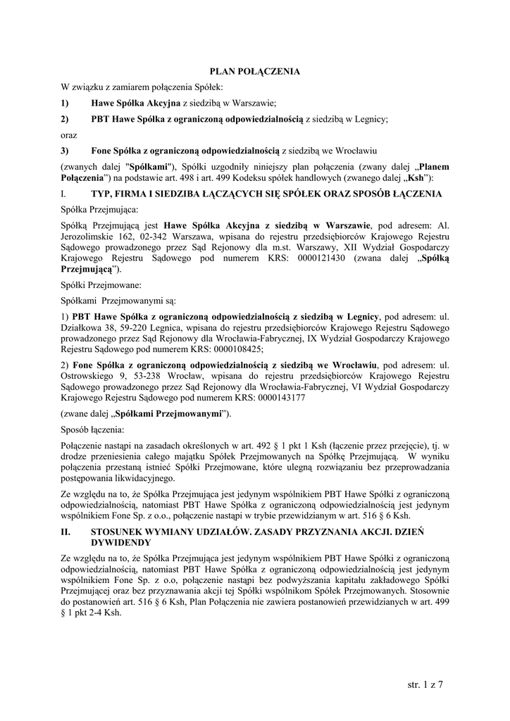 PLAN POŁĄCZENIA W związku z zamiarem połączenia Spółek: 1) Hawe Spółka Akcyjna z siedzibą w Warszawie; 2) PBT Hawe Spółka z ograniczoną odpowiedzialnością z siedzibą w Legnicy; oraz 3) Fone Spółka z ograniczoną odpowiedzialnością z siedzibą we Wrocławiu (zwanych dalej "Spółkami"), Spółki uzgodniły niniejszy plan połączenia (zwany dalej „Planem Połączenia”) na podstawie art. 498 i art. 499 Kodeksu spółek handlowych (zwanego dalej „Ksh”): I. TYP, FIRMA I SIEDZIBA ŁĄCZĄCYCH SIĘ SPÓŁEK ORAZ SPOSÓB ŁĄCZENIA Spółka Przejmująca: Spółką Przejmującą jest Hawe Spółka Akcyjna z siedzibą w Warszawie, pod adresem: Al. Jerozolimskie 162, 02-342 Warszawa, wpisana do rejestru przedsiębiorców Krajowego Rejestru Sądowego prowadzonego przez Sąd Rejonowy dla m.st. Warszawy, XII Wydział Gospodarczy Krajowego Rejestru Sądowego pod numerem KRS: 0000121430 (zwana dalej „Spółką Przejmującą”). Spółki Przejmowane: Spółkami Przejmowanymi są: 1) PBT Hawe Spółka z ograniczoną odpowiedzialnością z siedzibą w Legnicy, pod adresem: ul. Działkowa 38, 59-220 Legnica, wpisana do rejestru przedsiębiorców Krajowego Rejestru Sądowego prowadzonego przez Sąd Rejonowy dla Wrocławia-Fabrycznej, IX Wydział Gospodarczy Krajowego Rejestru Sądowego pod numerem KRS: 0000108425; 2) Fone Spółka z ograniczoną odpowiedzialnością z siedzibą we Wrocławiu, pod adresem: ul. Ostrowskiego 9, 53-238 Wrocław, wpisana do rejestru przedsiębiorców Krajowego Rejestru Sądowego prowadzonego przez Sąd Rejonowy dla Wrocławia-Fabrycznej, VI Wydział Gospodarczy Krajowego Rejestru Sądowego pod numerem KRS: 0000143177 (zwane dalej „Spółkami Przejmowanymi”). Sposób łączenia: Połączenie nastąpi na zasadach określonych w art. 492 § 1 pkt 1 Ksh (łączenie przez przejęcie), tj. w drodze przeniesienia całego majątku Spółek Przejmowanych na Spółkę Przejmującą. W wyniku połączenia przestaną istnieć Spółki Przejmowane, które ulegną rozwiązaniu bez przeprowadzania postępowania likwidacyjnego. Ze względu na to, Ŝe Spółka Przejmująca jest jedynym wspólnikiem PBT Hawe Spółki z ograniczoną odpowiedzialnością, natomiast PBT Hawe Spółka z ograniczoną odpowiedzialnością jest jedynym wspólnikiem Fone Sp. z o.o., połączenie nastąpi w trybie przewidzianym w art. 516 § 6 Ksh. II. STOSUNEK WYMIANY UDZIAŁÓW. ZASADY PRZYZNANIA AKCJI. DZIEŃ DYWIDENDY Ze względu na to, Ŝe Spółka Przejmująca jest jedynym wspólnikiem PBT Hawe Spółki z ograniczoną odpowiedzialnością, natomiast PBT Hawe Spółka z ograniczoną odpowiedzialnością jest jedynym wspólnikiem Fone Sp. z o.o, połączenie nastąpi bez podwyŜszania kapitału zakładowego Spółki Przejmującej oraz bez przyznawania akcji tej Spółki wspólnikom Spółek Przejmowanych. Stosownie do postanowień art. 516 § 6 Ksh, Plan Połączenia nie zawiera postanowień przewidzianych w art. 499 § 1 pkt 2-4 Ksh. str. 1 z 7 III. PRAWA PRZYZNANE PRZEZ SPÓŁKĘ PRZEJMUJĄCĄ Połączenie zostanie dokonane bez przyznawania przez Spółkę Przejmującą jakichkolwiek praw wspólnikom Spółek Przejmowanych lub innym osobom szczególnie uprawnionym w Spółkach Przejmowanych. IV. SZCZEGÓLNE KORZYŚCI DLA CZŁONKÓW ORGANÓW ORAZ INNYCH OSÓB UCZESTNICZĄCYCH W POŁĄCZENIU Połączenie zostanie dokonane bez przyznawania szczególnych korzyści dla członków organów Spółek Przejmowanych lub innych osób uczestniczących w połączeniu. V. ZAŁĄCZNIKI Zgodnie z art. 499 § 2 Ksh do Planu Połączenia zostały załączone następujące dokumenty: 1. Projekt uchwały Walnego Zgromadzenia Hawe SA o połączeniu Spółek – Załącznik nr 1. 2. Projekt uchwały Zgromadzenia Wspólników PBT Hawe Sp. o.o. o połączeniu Spółek Załącznik nr 2. 3. Projekt uchwały Zgromadzenia Wspólników Fone Sp. z o.o. o połączeniu Spółek Załącznik nr 3. 4. Ustalenie wartości majątku PBT Hawe Sp. z o.o. na dzień 31 marca 2007r. – Załącznik nr 4. 5. Ustalenie wartości majątku Fone Sp. z o.o. na dzień 31 marca 2007r. - Załącznik nr 5. 6. Oświadczenie o stanie księgowym Hawe SA sporządzone dla celów połączenia na dzień 31 marca 2007r. - Załącznik nr 6. 7. Oświadczenie o stanie księgowym PBT Hawe Sp. z o.o. sporządzone dla celów połączenia na dzień 31 marca 2007r. - Załącznik nr 7. 8. Oświadczenie o stanie księgowym Fone Sp. z o.o. sporządzone dla celów połączenia na dzień 31 marca 2007r. - Załącznik nr 8. W związku z tym, iŜ połączenie realizowane jest bez podwyŜszenia kapitału zakładowego Spółki Przejmującej oraz bez innych zmian Statutu tej Spółki, nie jest sporządzany załącznik do Planu Połączenia, o którym mowa w art. 499 § 2 pkt 2 Ksh (projekt zmian Statutu Spółki Przejmującej). Na dowód uzgodnienia niniejszego Planu Połączenia pomiędzy Spółką Przejmującą i Spółkami Przejmowanymi, został on podpisany dnia 13 kwietnia 2007 r. W imieniu HAWE SA: _____________________ Marek Rudziński Prezes Zarządu W imieniu PBT Hawe Sp. z o.o.: _____________________ Członek Zarządu _____________________ Członek Zarządu str. 2 z 7 W imieniu Fone Sp. z o.o.: _____________________ Mariusz Ładysz Prezes Zarządu _____________________ Krzysztof Surgut Wiceprezes Zarządu Załącznik nr 1 do Planu Połączenia Projekt uchwały Zwyczajnego Walnego Zgromadzenia Hawe SA UCHWAŁA NR ...../2007 Zwyczajnego Walnego Zgromadzenia Hawe SA w sprawie: połączenia Spółki ze spółkami PBT Hawe Sp. z o.o. oraz Fone Sp. z o.o. § 1. 1. Na podstawie art. 492 § 1 pkt 1 i art. 506 kodeksu spółek handlowych, Walne Zgromadzenie postanawia dokonać połączenia spółki HAWE SA oraz spółek PBT Hawe Sp. z o.o. i Fone Sp. z o.o. Połączenie zostanie dokonane w drodze przejęcia majątku spółek PBT Hawe Sp. o.o. i Fone Sp. o. o. przez spółkę Hawe SA. 2. Zgodnie z art. 506 § 4 kodeksu spółek handlowych, Walne Zgromadzenie 