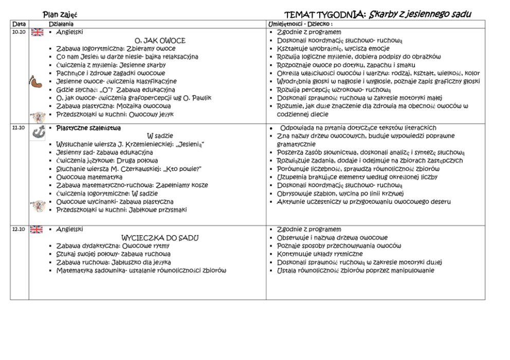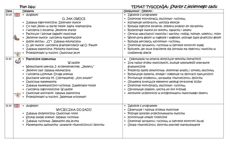 TEMAT TYGODNIA: Plan zajęć Data 10.10 Działania Umiejętności - Dziecko : Angielski 11.10 Plastyczne szaleństwa 12.10 O, JAK OWOCE Zabawa logorytmiczna: Zbieramy owoce Co nam Jesień w darze niesie- bajka relaksacyjna Ćwiczenia z myślenia: Jesienne skarby Pachnące i zdrowe zagadki owocowe Jesienne owoce- ćwiczenia klasyfikacyjne Gdzie słychać: „O”? Zabawa edukacyjna O, jak owoce- ćwiczenia grafopercepcji wg O. Pawlik Zabawa plastyczna: Mozaika owocowa Przedszkolaki w kuchni: Owocowy jeżyk W sadzie Wysłuchanie wiersza J. Krzemienieckiej: „Jesienią” Jesienny sad- zabawa edukacyjna Ćwiczenia językowe: Druga połowa Słuchanie wiersza M. Czerkawskiej: „Kto powie?” Owocowa matematyka Zabawa matematyczno-ruchowa: Zapełniamy kosze Ćwiczenia logorytmiczne: W sadzie Owocowe wycinanki- zabawa plastyczna Przedszkolaki w kuchni: Jabłkowe przysmaki Angielski WYCIECZKA DO SADU Zabawa dydaktyczna: Owocowe rytmy Szukaj swojej połowy- zabawa ruchowa Zabawa ruchowa: Jabłuszko dla jeżyka Matematyka sadownika- ustalanie równoliczności zbiorów Skarby z jesiennego sadu Zgodnie z programem Doskonali koordynację słuchowo- ruchową Kształtuje wyobraźnię, wycisza emocje Rozwija logiczne myślenie, dobiera podpisy do obrazków Rozpoznaje owoce po dotyku, zapachu i smaku Określa właściwości owoców i warzyw: rodzaj, kształt, wielkość, kolor Wyodrębnia głoski w nagłosie i wygłosie, poznaje zapis graficzny głoski Rozwija percepcję wzrokowo- ruchową Doskonali sprawność ruchowa w zakresie motoryki małej Rozumie, jak duże znaczenie dla zdrowia ma obecność owoców w codziennej diecie Odpowiada na pytania dotyczące tekstów literackich Zna nazwy drzew owocowych, buduje wypowiedzi poprawne gramatycznie Poszerza zasób słownictwa, doskonali analizę i syntezę słuchową Rozwiązuje zadania, dodaje i odejmuje na zbiorach zastępczych Porównuje liczebność, sprawdza równoliczność zbiorów Uzupełnia brakujące elementy według określonej liczby Doskonali koordynację słuchowo- ruchową Obrysowuje szablon, wycina po linii krzywej Aktywnie uczestniczy w przygotowaniu owocowego deseru Zgodnie z programem Obserwuje i nazywa drzewa owocowe Poznaje sposoby przechowywania owoców Kontynuuje układy rytmiczne Doskonali sprawność ruchową w zakresie motoryki dużej Ustala równoliczność zbiorów poprzez manipulowanie 13.10 Rytmika 14.10 ŚLIWKOWA NIESPODZIANKA Czapka niewidka- zabawa rozwijająca zmysły Słuchanie opowiadania: „Świat witamin” Owoce na wiele sposobów- zabawa dydaktyczna Ćwiczenie uwagi słuchowej: Prawda to czy plotka? Przetwory owocowe- zagadki wg M. Przewożnika Zabawa ruchowa przy piosence: „Polka prawdziwa” Owocowe zabawy badawcze Przedszkolaki w kuchni: Śliwkowa niespodzianka Wizyta logopedy Basen- zajęcia fakultatywne TAJEMNICE SPIŻARNI Wysłuchanie wiersza M. Kownackiej: „W spiżarni” Tajemnice spiżarni- burza mózgów Jesienny zestaw ćwiczeń gimnastycznych Ćwiczenia językowe: Robimy zapasy na zimowe czasy W sadzie- gra dydaktyczna Zabawa sprawnościowa: Mali kucharze Jabłuszko i gruszka- zabawa plastyczna Ćwiczy spostrzegawczość i pamięć wzrokową Rozumie konieczność spożywania owoców i warzyw dla zachowania zdrowia Rozwija mowę i myślenie Ocenia wartość logiczną zdania, koncentruje uwagę słuchową Poznaje sposoby przetwarzania owoców Porusza się rytmicznie przy muzyce Wyodrębnia i nazywa części owocu Uczestniczy w przygotowaniu posiłku, przestrzega zasad higieny i bezpieczeństwa Uważnie słucha i odpowiada na pytania Wie, co można przygotować z poszczególnych produktów Doskonali sprawność ruchową w zakresie motoryki dużej Kończy zdania, wyszukuje rymy Przestrzega reguł gry Ćwiczy zręczność i koordynację ruchową Doskonali sprawność manualną