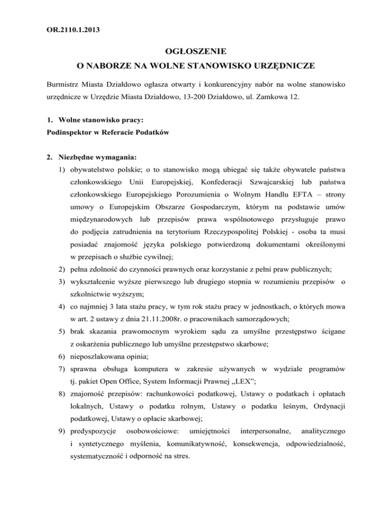 OR.2110.1.2013 OGŁOSZENIE O NABORZE NA WOLNE STANOWISKO URZĘDNICZE Burmistrz Miasta Działdowo ogłasza otwarty i konkurencyjny nabór na wolne stanowisko urzędnicze w Urzędzie Miasta Działdowo, 13-200 Działdowo, ul. Zamkowa 12. 1. Wolne stanowisko pracy: Podinspektor w Referacie Podatków 2. Niezbędne wymagania: 1) obywatelstwo polskie; o to stanowisko mogą ubiegać się także obywatele państwa członkowskiego Unii Europejskiej, Konfederacji Szwajcarskiej lub państwa członkowskiego Europejskiego Porozumienia o Wolnym Handlu EFTA – strony umowy o Europejskim Obszarze Gospodarczym, którym na podstawie umów międzynarodowych lub przepisów prawa wspólnotowego przysługuje prawo do podjęcia zatrudnienia na terytorium Rzeczypospolitej Polskiej - osoba ta musi posiadać znajomość języka polskiego potwierdzoną dokumentami określonymi w przepisach o służbie cywilnej; 2) pełna zdolność do czynności prawnych oraz korzystanie z pełni praw publicznych; 3) wykształcenie wyższe pierwszego lub drugiego stopnia w rozumieniu przepisów o szkolnictwie wyższym; 4) co najmniej 3 lata stażu pracy, w tym rok stażu pracy w jednostkach, o których mowa w art. 2 ustawy z dnia 21.11.2008r. o pracownikach samorządowych; 5) brak skazania prawomocnym wyrokiem sądu za umyślne przestępstwo ścigane z oskarżenia publicznego lub umyślne przestępstwo skarbowe; 6) nieposzlakowana opinia; 7) sprawna obsługa komputera w zakresie używanych w wydziale programów tj. pakiet Open Office, System Informacji Prawnej „LEX”; 8) znajomość przepisów: rachunkowości podatkowej, Ustawy o podatkach i opłatach lokalnych, Ustawy o podatku rolnym, Ustawy o podatku leśnym, Ordynacji podatkowej, Ustawy o opłacie skarbowej; 9) predyspozycje osobowościowe: umiejętności interpersonalne, analitycznego i syntetycznego myślenia, komunikatywność, konsekwencja, odpowiedzialność, systematyczność i odporność na stres. 3. Zadania wykonywane na stanowisku: Do głównych zadań pracownika ubiegającego się o stanowisko w niniejszym naborze należy: 1) Wymiar podatku od nieruchomości oraz korekty na skutek zmian stanu majątku prowadzone dla osób fizycznych i prawnych. 2) Wymiar podatku rolnego i leśnego oraz korekty na skutek zmian stanu majątku prowadzone dla osób fizycznych i prawnych. 3) Przygotowywanie projektów uchwał dotyczących podatku od nieruchomości, rolnego, leśnego. 4) Planowanie i analiza dochodów dla podatku od nieruchomości, rolnego i leśnego. 5) Księgowość i egzekucja podatku od nieruchomości, rolnego i leśnego dla osób prawnych. 6) Sporządzanie sprawozdań z podatku od nieruchomości, rolnego i leśnego dla osób prawnych (w tym: obroty, zaległości, odsetki, skutki udzielonych ulg na podstawie Ordynacji podatkowej – umorzenia, odroczenia, rozłożenia na raty oraz skutki obniżenia górnych stawek podatkowych, skutki wprowadzenia ulg na podstawie uchwały i ustawy dla osób prawnych i fizycznych). 7) Rozpatrywanie podań w sprawach ulg dotyczących podatków i opłat lokalnych, niepodatkowych należności budżetowych oraz podatków stanowiących dochody budżetu gminy, administrowanych przez Urząd Skarbowy. 8) Sporządzanie wykazów osób prawnych i fizycznych oraz jednostek organizacyjnych, którym w zakresie podatków lub opłat udzielono ulg, odroczeń, umorzeń lub rozłożono spłatę na raty a także tych, którym udzielono pomocy publicznej. 9) Sprawozdawczość w zakresie udzielonej przedsiębiorcom pomocy publicznej zgodnie z przepisami ustawy o pomocy publicznej. 10) Wydawanie zaświadczeń o stanie majątkowym, o powierzchni użytków rolnych oraz o dochodowości z gospodarstwa rolnego (osoby fizyczne i prawne), zaświadczeń o nie zaleganiu w podatku od nieruchomości, rolnym i leśnym dla osób prawnych. 11) Prowadzenie postępowania i dokumentacji dotyczącej kontroli podatkowej. 12) Gromadzenie i przestrzeganie aktualnych przepisów regulujących sprawy będące w zakresie obowiązków, w tym przepisów wewnętrznych. 13) Inne, zlecone przez Kierownika Referatu Podatków. 4. Warunki pracy na stanowisku: 1) Warunki dotyczące charakteru pracy i sposobu wykonywania zadań: a) praca w środowisku administracyjno-biurowym, doraźnie praca w terenie, b) praca przy komputerze powyżej połowy dobowego wymiaru czasu pracy. 2) Miejsce i otoczenie organizacyjno-techniczne stanowiska pracy: a) dojazd do budynku Urzędu Miasta Działdowo ul. Zamkowa 12 o nawierzchni asfaltowej i podjazdem o nawierzchni z kostki brukowej, szerokość 4,5 m zakończony placem manewrowym z wyznaczonymi miejscami parkingowymi dla osób niepełnosprawnych, b) możliwość wjazdu na teren Urzędu Miasta osób z dysfunkcją układu ruchu na wózkach inwalidzkich pomimo 10% spadku na drogach i dojazdach osób niepełnosprawnych poprzez użycie transportera na gąsienicach, c) schody: szerokość średnia stopnia 1,2 m, zabezpieczone balustradą metalową z wypełnieniem ze szkła bezpiecznego, d) podłogi i posadzki: wykładziny podłogowe, terakota, e) temperatura pomieszczenia stałej pracy 20-23 oC, wilgotność 40-60 %, f) wysiłek: praca lekka, g) przejścia, dojścia: szerokość 0,9 m - 1,5 m, h) zachowane minimum 2 m2 wolnej powierzchni i 13 m3 wolnej objętości, i) możliwość użycia dźwigu osobowego o wymiarach kabiny 1,1 x 1,4 x 2,1 m, j) pomieszczenie pracy znajduje się na II piętrze budynku Urzędu Miasta Działdowo z możliwością wjazdu na to piętro windą, k) zagrożenia wynikające z oceny ryzyka zawodowego na stanowisku pracy: zagrożenie uderzeniem o krawędzie wyposażenia pomieszczeń, poślizgnięcie, potknięcie, przeciążenia układu mięśniowo - szkieletowego, przeciążenia zmysłu wzroku itp. 5. Wskaźnik zatrudnienia osób niepełnosprawnych w Urzędzie: Wskaźnik zatrudnienia w rozumieniu osób niepełnosprawnych w Urzędzie Miasta Działdowo, przepisów o rehabilitacji zawodowej i społecznej oraz zatrudnianiu osób niepełnosp