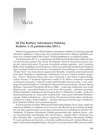 VVaria III Dni Kultury Adwokatury Polskiej, Kraków, 1–12 października 2013 r. Kraków był gospodarzem III Dni Kultury Adwokatury Polskiej. Do miasta przyjechali adwokaci i aplikanci z całego kraju, aby wysłuchać koncertów, obejrzeć spektakl i wernisaż oraz zwiedzić krakowskie muzea. Poniżej publikujemy szczegółową relację. 10 października 2013 r. w wypełnionej sali Filharmonii Krakowskiej odbył się koncert poświęcony pamięci abp. Józefa Życińskiego. Koncert stanowił przeżycie artystyczne najwyższej miary. To przede wszystkim zasługa organisty – prof. Andrzeja Białki, który do głębi poruszył słuchaczy, zwłaszcza wspaniałą interpretacją Preludium fugi i wariacji h-moll Cesara Francka, wariacjami M. Surzyńskiego na temat suplikacji „Święty Boże” oraz koncertami organowymi Haendla, wspaniale poprowadzonymi przez prof. Stanisława Gałońskiego i Sinfoniettę Cracovia. Ostatnie punkty programu: „Orawa” Wojciecha Kilara oraz walc z Serenady C-dur Piotra Czajkowskiego, a także Toccata z V Symfonii Organowej c-moll Ch. M. Widora, stanowiły wspaniałe zwieńczenie koncertu, w którym wzięli udział Karolina Kaczorowska – żona ostatniego Prezydenta Polski na Uchodźstwie Ryszarda Kaczorowskiego, minister Maciej Rybiński z kancelarii Prezydenta RP, Jerzy Miller – wojewoda małopolski, prof. Jacek Majchrowski – prezydent Krakowa, prof. Jerzy Wyrozumski – sekretarz generalny Polskiej Akademii Umiejętności, bp Grzegorz Ryś, ks. Władysław Gasidło – proboszcz akademickiej parafii św. Anny, prof. Andrzej Zoll – były prezes Trybunału Konstytucyjnego, Tadeusz Jakubowicz – prezes Gminy Wyznaniowej Żydowskiej w Krakowie, poetka Ewa Lipska, Zofia Gołubiew – dyrektor Muzeum Narodowego w Krakowie, prof. Stanisław Waltoś i inni znamienici goście. Przed koncertem dyrektor Filharmonii Krakowskiej Bogdan Tosza, który oddał Adwokaturze Polskiej we władanie na ten wieczór salę filharmonii, powiedział, jak bliska jest mu idea organizowania uroczystości poświęconych arcybiskupowi Józefowi Życińskiemu. W imieniu Adwokatury Polskiej przemawiali adw. Andrzej Zwara – prezes Naczelnej Rady Adwokackiej, adw. Paweł Gieras – dziekan ORA w Krakowie oraz adw. Stanisław Kłys – pomysłodawca i organizator Dni Kultury Adwokatury Polskiej. W czasie spotkania po koncercie z artystami i publicznością prof. Andrzej Mania, prorektor Uniwersytetu Jagiellońskiego, odczytał i wręczył prezesowi NRA uroczysty adres 301 Varia PALESTRA od rektora UJ Wojciecha Nowaka, który wystosował w związku z koncertem i Dniami Kultury Adwokatury. 11 października obejrzeliśmy w Teatrze Bagatela zabawną sztukę (komedię kryminalną) Stefana Vogela Carmen. Bella Donna, natomiast 12 października w Klubie Adwokackim im. Janiny Ruth Buczyńskiej odbył się wernisaż młodej malarki Katarzyny Karpowicz, przygotowany przez adw. Lidię Piwowarczyk. Dzięki uprzejmości Zofii Gołubiew, dyrektor Muzeum Narodowego w Krakowie, oraz prof. Krzysztofa Stopki, dyrektora Collegium Maius UJ, uczestnicy Dni Kultury Adwokatury Polskiej mieli okazję zwiedzić nowo otwarte Muzeum im. Emeryka Huten-Czapskiego, zawierające bezcenne zbiory numizmatyczne, Muzeum Młodej Polski w kamienicy przy placu Szczepańskim w Krakowie oraz Muzeum Collegium Maius UJ, po którym osobiście oprowadzał adwokatów jego dyrektor, pokazując to, co najpiękniejsze i bezcenne. Jak co roku, dla Adwokatury wystąpił też słynny krakowski kabaret „Piwnica pod Baranami”, przy czym, jak twierdził konferansjer i zarazem piwniczny bard Leszek Wójtowicz, zarzekając się, że jest to prawdą, spektakl miał wyreżyserować adw. Stanisław Kłys. „Piwnica” dała z siebie wszystko co najlepsze, spektakl trwał ponad trzy godziny, a widzowie bawili się do łez. „Piwnica pod Baranami” jest chyba jedynym miejscem na świecie, które potrafi tak głęboko poruszyć najtajniejsze „struny” ludzkiej duszy, a jej humor nie ma nic z bylejakości, z jaką stykamy się na co dzień. Podczas Dni Kultury Adwokatury Komisja Doskonalenia Zawodowego przy NRA zorganizowała cykl wykładów w auli Polskiej Akademii Umiejętności. Wygłosili je uczeni z Katedry i Zakładu Medycyny Sądowej Collegium Medicum UJ. Prawdziwą summą III Dni Kultury Adwokatury Polskiej była niedzielna msza św. w intencji abp. Józefa Życińskiego i Adwokatury Polskiej, odprawiona w kościele oo. Dominikanów przez ojca prof. Jana Andrzeja Kłoczowskiego OP w koncelebrze z ojcem prof. Wojciechem Życińskim SDB (bratem arcybiskupa) i honorowym duszpasterzem prawników archidiecezji krakowskiej ks. dr. Janem Pasierbkiem. W mszy św. uczestniczyło ponad dwa tysiące osób. Adwokaturę reprezentowali m.in. adwokaci: Czesław Jaworski, Zbigniew Dyka, dziekani ORA: w Lublinie – adw. Stanisław Estreich, w Olsztynie – adw. Andrzej Kozielski, w Siedlcach – Janusz Steć, w Krakowie – Paweł Gieras, a także wielu innych adwokatów uczestników III Dni Kultury Adwokatury z całej Polski. Kazanie wygłoszone przez o. Kłoczowskiego i słowa podziękowania dla Adwokatury skierowane przez niego i ks. Wojciecha Życińskiego przypomniały o tym, jak niezbywalna jest nasza rola w społeczeństwie i że na końcu każdy z nas chciałby mieć nie oskarżyciela, ale obrońcę, adwokata. Kazanie można znaleźć na stronie internetowej www.dwunastka.krakow.dominikanie.pl Tegoroczne wydarzenie promował plakat opracowany przez Olafa Ciruta, przedstawiający „Anioła ekumenicznego” autorstwa wybitnego artysty Adama Macedońskiego. Podsumowując tegoroczne Dni Kultury, najlepiej jest przytoczyć słowa artystów z kabaretu „Piwnica pod Baranami”: nie ma Adwokatury bez wysokiej kultury! Joanna Sędek 302 1–2/2014 Varia Modlitwa, która jest wierszem; wiersz, który jest zadumą filozoficzną Jesienią 2013 roku odbyły się kolejne, III Dni Kultury Adwokatury Polskiej w Krakowie. Były one wyśmienite. 