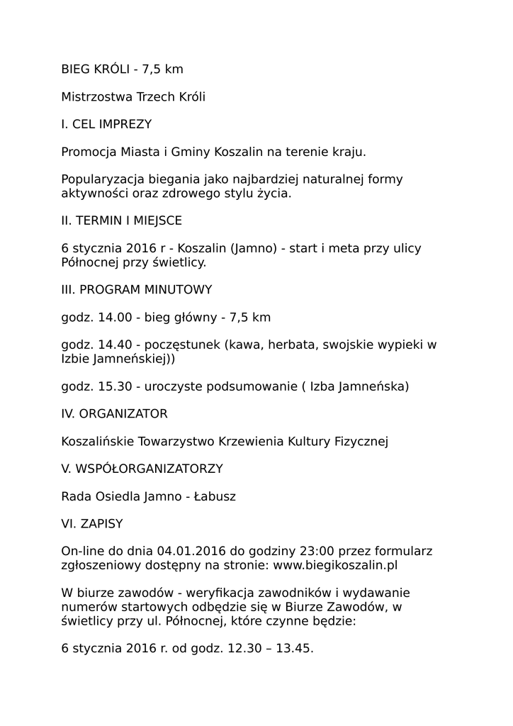 BIEG KRÓLI - 7,5 km Mistrzostwa Trzech Króli I. CEL IMPREZY Promocja Miasta i Gminy Koszalin na terenie kraju. Popularyzacja biegania jako najbardziej naturalnej formy aktywności oraz zdrowego stylu życia. II. TERMIN I MIEJSCE 6 stycznia 2016 r - Koszalin (Jamno) - start i meta przy ulicy Północnej przy świetlicy. III. PROGRAM MINUTOWY godz. 14.00 - bieg główny - 7,5 km godz. 14.40 - poczęstunek (kawa, herbata, swojskie wypieki w Izbie Jamneńskiej)) godz. 15.30 - uroczyste podsumowanie ( Izba Jamneńska) IV. ORGANIZATOR Koszalińskie Towarzystwo Krzewienia Kultury Fizycznej V. WSPÓŁORGANIZATORZY Rada Osiedla Jamno - Łabusz VI. ZAPISY On-line do dnia 04.01.2016 do godziny 23:00 przez formularz zgłoszeniowy dostępny na stronie: www.biegikoszalin.pl W biurze zawodów - weryfikacja zawodników i wydawanie numerów startowych odbędzie się w Biurze Zawodów, w świetlicy przy ul. Północnej, które czynne będzie: 6 stycznia 2016 r. od godz. 12.30 – 13.45. VII. OPŁATA STARTOWA Opłata startowa indywidualna: - 20 zł do dnia 04.01.2016 r. - 30 zł w dniu zawodów Wpłaty dokonywać na konto: Koszalińskie Towarzystwo Krzewienia Kultury Fizycznej ul. Jedności 4; 75-401 Koszalin Numer konta 05 1020 2791 0000 7802 0064 0508 z dopiskiem: „Opłata startowa - Bieg Króli” imię i nazwisko zawodnika, rok urodzenia W ramach opłaty startowej każdy zgłoszony otrzymuje: pamiątkowy odlewany medal, koronę. OPŁATA STARTOWA NIE PODLEGA ZWROTOWI, ANI PRZEKAZANIU NA INNE OSOBY. VIII. ZASADY UCZESTNICTWA 1. Podczas imprezy obowiązują przepisy Polskiego Związku Lekkiej Atletyki. 2. Pomiar czasu za pomocą chipów, ustalenia kolejności zawodników na mecie dokonują sędziowie. Wyniki zawodów na żywo na stronie organizatora www.biegikoszalin.pl 3. Zawodnicy sklasyfikowani zostaną w następujący sposób: W biegu głównym na dystansie 7,5 km będą prowadzone klasyfikacje w kategoriach wiekowych kobiet i mężczyzn: K/M-18 18-29 lat K/M-30 30-39 lat K/M-40 40-49 lat K/M-50 50-59 lat K/M-60 60-69 lat K/M-70 70 + UWAGA! O przynależności do danej kategorii wiekowej decyduje rok urodzenia. Kategoria dodatkowa: Mistrzostwa Trzech Króli (trzyosobowe zespoły, każdy musi biec w koronie) 4. Wszyscy zawodnicy startujący w biegu muszą zostać zweryfikowani (z dowodem tożsamości ze zdjęciem) w biurze. 5. Podpisując listę startową uczestnik bierze pełną odpowiedzialność za swoje uczestnictwo w biegu. X. WYRÓŻNIENIA INDYWIDUALNIE W klasyfikacji generalnej kobiet i mężczyzn: za miejsca I – III puchar W kategoriach wiekowych (nie dublują się z klasyfikacją generalną): za miejsca I – III dyplom W kategorii Trzech Króli: za miejsca I - VI upominki. WSZYSCY UCZESTNICY Na mecie otrzymają odlewany medal okolicznościowy. Losowanie upominków wśród wszystkich uczestników. XI. TRASA START i META Koszalin (osiedle Jamno), ul. Północna przy Orliku. Na trasie znajduje się punkt pomocy medycznej. W przypadku kontuzji, uczestnik powiadamia obsługę trasy, która przekazuje informacje do punktu pomocy medycznej. Plan trasy z zaznaczonym punktem pomocy medycznej oraz punktem odświeżania znajduje się w biurze zawodów. Trasa przebiega po nawierzchni twardej. XII. DEPOZYT Depozyt na pozostawienie rzeczy na okres biegu znajdować będzie się w wyznaczonym miejscu. Deponować wolno jedynie elementy ubioru, zaś pozostawianie w depozycie wszelkich dokumentów, cennych przedmiotów i pieniędzy jest niedozwolone. Depozyt można odebrać tylko na podstawie numeru startowego. W przypadku zgubienia przez zawodnika numeru startowego, Organizator jest zwolniony z odpowiedzialności za pobranie depozytu przez inną osobę. Za pozostawione bez opieki rzeczy organizator nie ponosi odpowiedzialności. XIII. UBEZPIECZENIE 1. Organizator posiada ubezpieczenie OC. 2. Organizator nie zapewnia uczestnikom ubezpieczenia od następstw nieszczęśliwych wypadków. XIV. POSTANOWIENIA KOŃCOWE Organizator zapewnia opiekę medyczną w Biurze Organizacyjnym oraz na trasie i mecie biegu. Podczas biegu wszyscy zawodnicy muszą posiadać numery startowe, przymocowane do koszulek sportowych na klatce piersiowej. Pod karą dyskwalifikacji niedopuszczalne jest zasłanianie numeru startowego (w części lub całości). Bieg odbędzie się bez względu na pogodę. Organizator nie zapewnia miejsc noclegowych. Interpretacja niniejszego regulaminu należy do organizatora biegu ulicznego. Organizator nie ponosi odpowiedzialności za wypadki mające miejsce na trasie biegu, wynikające z winy uczestników biegu. W sprawach nie ujętych w regulaminie ostateczną decyzje podejmuje organizator. Organizatorzy zalecają dodatkowe ubezpieczenie się od NNW. Przyjmuje się, że zgłoszenie się do zawodów (wpis na listę zawodników) jest równoznaczne z akceptacją niniejszego regulaminu. Każdy uczestnik, który zrezygnuje z udziału w biegu w trakcie jego trwania powinien bezzwłocznie zgłosić ten fakt obsłudze technicznej będącej na trasie biegu lub w biurze zawodów. Organizator nie ponosi odpowiedzialności materialnej za rzeczy zaginione w trakcie trwania imprezy sportowej. Organizator, wszystkie osoby z nim współpracujące, a także osoby związane z przeprowadzeniem i organizacją biegu nie ponoszą odpowiedzialności względem uczestników za wypadki, ewentualne kolizje, szkody osobowe, rzeczowe i majątkowe, które wystąpią przed, w trakcie lub po zawodach spowodowane przez uczestników imprezy. Uczestnicy ponoszą odpowiedzialność cywilną i prawną za wyrządzone szkody. Każdy zawodnik w biegu głównym otrzymuje numer startowy, który po biegu upoważnia do otrzymania posiłku i herbaty. Uczestnik wyraża zgodę na przetwarzanie danych osobowych przez Organizatora celem podania wyników zgodnie z ustawą z dnia 29 sierpnia 1997r. o ochronie danych osobowych (Dz.U.Nr 133, poz.883). Akceptując regulamin Uczestnik wyraża zgodę, aby zdjęcia, nagrania filmowe oraz wywiady z jego osob