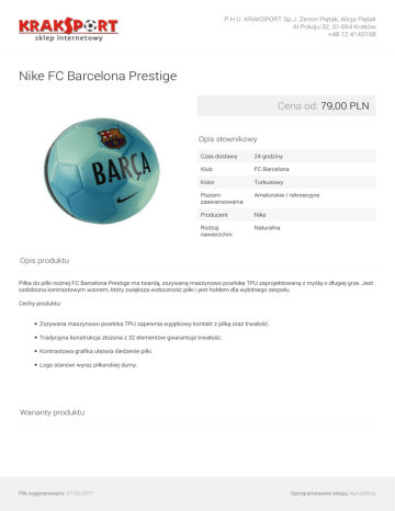P.H.U. KRAKSPORT Sp.J. Zenon Piętak, Alicja Piętak Al.Pokoju 32, 31-564 Kraków +48 12 4140108 Nike FC Barcelona Prestige Cena od: 79,00 PLN Opis słownikowy Czas dostawy 24 godziny Klub FC Barcelona Kolor Turkusowy Poziom zaawansowania Amatorskie / rekreacyjne Producent Nike Rodzaj nawierzchni Naturalna Opis produktu Piłka do piłki nożnej FC Barcelona Prestige ma twardą, zszywaną maszynowo powłokę TPU zaprojektowaną z myślą o długiej grze. Jest ozdobiona kontrastowym wzorem, który zwiększa widoczność piłki i jest hołdem dla wybitnego zespołu. Cechy produktu: Zszywana maszynowo powłoka TPU zapewnia wyjątkowy kontakt z piłką oraz trwałość. Tradycyjna konstrukcja złożona z 32 elementów gwarantuje trwałość. Kontrastowa grafika ułatwia śledzenie piłki. Logo stanowi wyraz piłkarskiej dumy. Warianty produktu Plik wygenerowano: 07-03-2017 Oprogramowanie sklepu: AptusShop P.H.U. KRAKSPORT Sp.J. Zenon Piętak, Alicja Piętak Al.Pokoju 32, 31-564 Kraków +48 12 4140108 4 79,00 PLN 5 79,00 PLN Galeria Plik wygenerowano: 07-03-2017 Powered by TCPDF (www.tcpdf.org) Oprogramowanie sklepu: AptusShop