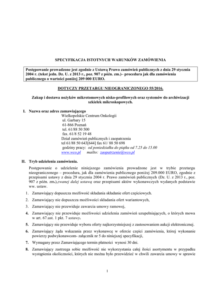 SPECYFIKACJA ISTOTNYCH WARUNKÓW ZAMÓWIENIA Postępowanie prowadzone jest zgodnie z Ustawą Prawo zamówień publicznych z dnia 29 stycznia 2004 r. (tekst jedn. Dz. U. z 2013 r., poz. 907 z późn. zm.)– procedura jak dla zamówienia publicznego o wartości poniżej 209 000 EURO. DOTYCZY PRZETARGU NIEOGRANICZONEGO 55/2016. Zakup i dostawa nożyków mikrotomowych nisko-profilowych oraz systemów do archiwizacji szkiełek mikroskopowych. I. Nazwa oraz adres zamawiającego Wielkopolskie Centrum Onkologii ul. Garbary 15 61-866 Poznań tel. 61/88 50 500 fax. 61/8 52 19 48 Dział zamówień publicznych i zaopatrzenia tel 61/88 50 643[644] fax 61/ 88 50 698 godziny pracy: od poniedziałku do piątku od 7.25 do 15.00 www.wco.pl mailto: [email protected] II. Tryb udzielenia zamówienia. Postępowanie o udzielenie niniejszego zamówienia prowadzone jest w trybie przetargu nieograniczonego – procedura, jak dla zamówienia publicznego poniżej 209.000 EURO, zgodnie z przepisami ustawy z dnia 29 stycznia 2004 r. Prawo zamówień publicznych (Dz. U. z 2013 r., poz. 907 z późn. zm.),zwanej dalej ustawą oraz przepisami aktów wykonawczych wydanych podstawie ww. ustaw. 1. Zamawiający dopuszcza możliwość składania składanie ofert częściowych. 2. Zamawiający nie dopuszcza możliwości składania ofert wariantowych, 3. Zamawiający nie przewiduje zawarcia umowy ramowej, 4. Zamawiający nie przewiduje możliwości udzielenia zamówień uzupełniających, o których mowa w art. 67.ust. 1 pkt. 7 ustawy. 5. Zamawiający nie przewiduje wyboru oferty najkorzystniejszej z zastosowaniem aukcji elektronicznej. 6. Zamawiający żąda wskazania przez wykonawcę w ofercie części zamówienia, której wykonanie powierzy podwykonawcom- załącznik nr 5 do niniejszej specyfikacji, 7. Wymagany przez Zamawiającego termin płatności wynosi 30 dni. 8. Zamawiający zastrzega sobie możliwość nie wykorzystania całej ilości asortymentu w przypadku wystąpienia okoliczności, których nie można było przewidzieć w chwili zawarcia umowy w sprawie 1 udzielenia zamówienia – art. 145 ustawy Prawo zamówień publicznych. Zamawiający dopuszcza możliwość przedłużenia okresu obowiązywania umowy, na okres nie dłuższy niż 2 lata z zachowaniem tych samych warunków, w przypadku nie wykorzystania całej ilości asortymentu będącego przedmiotem umowy. 9. W przypadku, gdy Wykonawca nie dostarczy w wymaganym terminie określonym w pkt. IV określonej partii przedmiotu zamówienia, zobowiązany jest pokryć Zamawiającemu różnicę w cenie zakupu u innego dostawcy. 10. Rabaty naturalne nie będą uwzględniane. III. Opis przedmiotu zamówienia Zakup i dostawa nożyków mikrotomowych nisko-profilowych 80mm oraz systemów do archiwizacji szkiełek mikroskopowych. 1. Nomenklatura wg Wspólnego Słownika Zamówień (CPV): 33793000-5 – laboratoryjne szkło szklane 39180000-7 - meble laboratoryjne 2. Ogólne założenia wyjściowe. Przedmiotem zamówienia Zakup i dostawa nożyków mikrotomowych nisko-profilowych oraz systemów do archiwizacji szkiełek mikroskopowych. Pakiet 1 – nożyki mikrotomowe nisko-profilowe 80mm w ilości 150 opakowań – 50 szt/opak. (7500 szt.) Pakiet 2 - systemy do archiwizacji szkiełek mikroskopowych - 5 systemów Szczegółowy opis przedmiotu zamówienia zawarty jest w załączniku do siwz. IV. Termin wykonania zamówienia pakiet 1: sukcesywnie max w ciągu 7 dni roboczych od złożenia zamówienia faxem lub telefonicznie, przez okres obowiązywania umowy 12 m-cy. pakiet 2: dostawa jednorazowa max 28 dni roboczych od daty podpisania umowy W ofercie należy przedstawić termin realizacji zamówienia. Dostawy w godzinach 8:00 do 14:00 do magazynu WCO V. Opis warunków udziału w postępowaniu oraz opis sposobu dokonywania oceny spełniania tych warunków; 1. W postępowaniu mogą wziąć udział Wykonawcy, którzy nie podlegają wykluczeniu na podstawie art. 24 ustawy Prawo zamówień publicznych (t. j. Dz. U. z 2013 r., poz. 907 z późn. zm.), spełniają warunki i wymagania określone w niniejszej Specyfikacji oraz w art. 22 ust. 1 ustawy Prawo zamówień publicznych (t. j. Dz. U. z 2013 r., poz. 907 z późn. zm.). 2. O udzielenie zamówienia mogą ubiegać się Wykonawcy, którzy spełniają następujące warunki: 2 Lp. Warunki oraz opis sposobu dokonywania oceny spełniania tych warunków 1 Uprawnienia do wykonywania określonej działalności lub czynności, jeżeli przepisy prawa nakładają obowiązek ich posiadania O udzielenie zamówienia mogą ubiegać się wykonawcy, którzy spełniają warunki, dotyczące posiadania uprawnień do wykonywania określonej działalności lub czynności, jeżeli przepisy prawa nakładają obowiązek ich posiadania. W celu wykazania spełnienia w/w warunku należy złożyć: Oświadczenie o spełnieniu warunku Ocena spełniania warunków udziału w postępowaniu będzie dokonana na zasadzie spełnia/nie spełnia. 2 Wiedza i doświadczenie O udzielenie zamówienia mogą ubiegać się wykonawcy, którzy spełniają warunki dotyczące posiadania wiedzy i doświadczenia. W celu wykazania spełnienia w/w warunku należy złożyć: Oświadczenie o spełnieniu warunku Ocena spełnienia warunku udziału w postępowaniu będzie dokonana na zasadzie spełnia/ nie spełnia. 3 Potencjał techniczny O udzielenie zamówienia mogą ubiegać się wykonawcy, którzy spełniają warunki, dotyczące dysponowania odpowiednim potencjałem technicznym. W celu wykazania spełnienia ww. warunku należy złożyć: Oświadczenie o spełnieniu warunków. Ocena spełniania warunku udziału w postępowaniu będzie dokonana na zasadzie spełnia/nie spełnia. 4 Osoby zdolne do wykonania zamówienia O udzielenie zamówienia mogą ubiegać się wykonawcy, którzy spełniają warunki, dotyczące dysponowania osobami zdolnymi do wykonania zamówienia. W celu wykazania spełnienia ww. warunku należy złożyć: Oświadczenie o spełnieniu warunków . Ocena spełniania wa