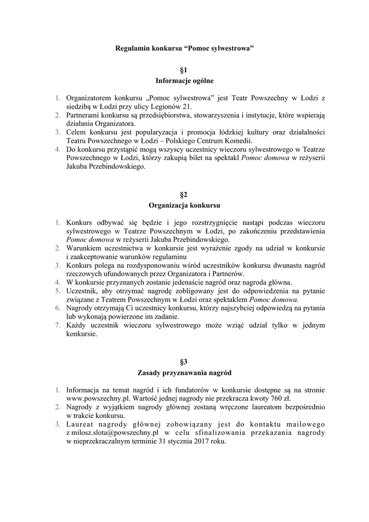 Regulamin konkursu “Pomoc sylwestrowa” §1 Informacje ogólne 1. Organizatorem konkursu „Pomoc sylwestrowa” jest Teatr Powszechny w Łodzi z siedzibą w Łodzi przy ulicy Legionów 21. 2. Partnerami konkursu są przedsiębiorstwa, stowarzyszenia i instytucje, które wspierają działania Organizatora. 3. Celem konkursu jest popularyzacja i promocja łódzkiej kultury oraz działalności Teatru Powszechnego w Łodzi – Polskiego Centrum Komedii. 4. Do konkursu przystąpić mogą wszyscy uczestnicy wieczoru sylwestrowego w Teatrze Powszechnego w Łodzi, którzy zakupią bilet na spektakl Pomoc domowa w reżyserii Jakuba Przebindowskiego. §2 Organizacja konkursu 1. Konkurs odbywać się będzie i jego rozstrzygnięcie nastąpi podczas wieczoru sylwestrowego w Teatrze Powszechnym w Łodzi, po zakończeniu przedstawienia Pomoc domowa w reżyserii Jakuba Przebindowskiego. 2. Warunkiem uczestnictwa w konkursie jest wyrażenie zgody na udział w konkursie i zaakceptowanie warunków regulaminu 3. Konkurs polega na rozdysponowaniu wśród uczestników konkursu dwunastu nagród rzeczowych ufundowanych przez Organizatora i Partnerów. 4. W konkursie przyznanych zostanie jedenaście nagród oraz nagroda główna. 5. Uczestnik, aby otrzymać nagrodę zobligowany jest do odpowiedzenia na pytanie związane z Teatrem Powszechnym w Łodzi oraz spektaklem Pomoc domowa. 6. Nagrody otrzymają Ci uczestnicy konkursu, którzy najszybciej odpowiedzą na pytania lub wykonają powierzone im zadanie. 7. Każdy uczestnik wieczoru sylwestrowego może wziąć udział tylko w jednym konkursie. §3 Zasady przyznawania nagród 1. Informacja na temat nagród i ich fundatorów w konkursie dostępne są na stronie www.powszechny.pl. Wartość jednej nagrody nie przekracza kwoty 760 zł. 2. Nagrody z wyjątkiem nagrody głównej zostaną wręczone laureatom bezpośrednio w trakcie konkursu. 3. Laureat nagrody głównej zobowiązany jest do kontaktu mailowego z [email protected] w celu sfinalizowania przekazania nagrody w nieprzekraczalnym terminie 31 stycznia 2017 roku. §4 Postanowienia końcowe 1. Regulamin konkursu dostępny jest na stroniewww.powszechny.pl. 2. Organizator konkursu zastrzega sobie prawo do zmiany niniejszego Regulaminu. 3. Organizator konkursu zastrzega sobie prawo do odwołania konkursu. W sprawach nieuregulowanych w niniejszym Regulaminie rozstrzyga Organizator.