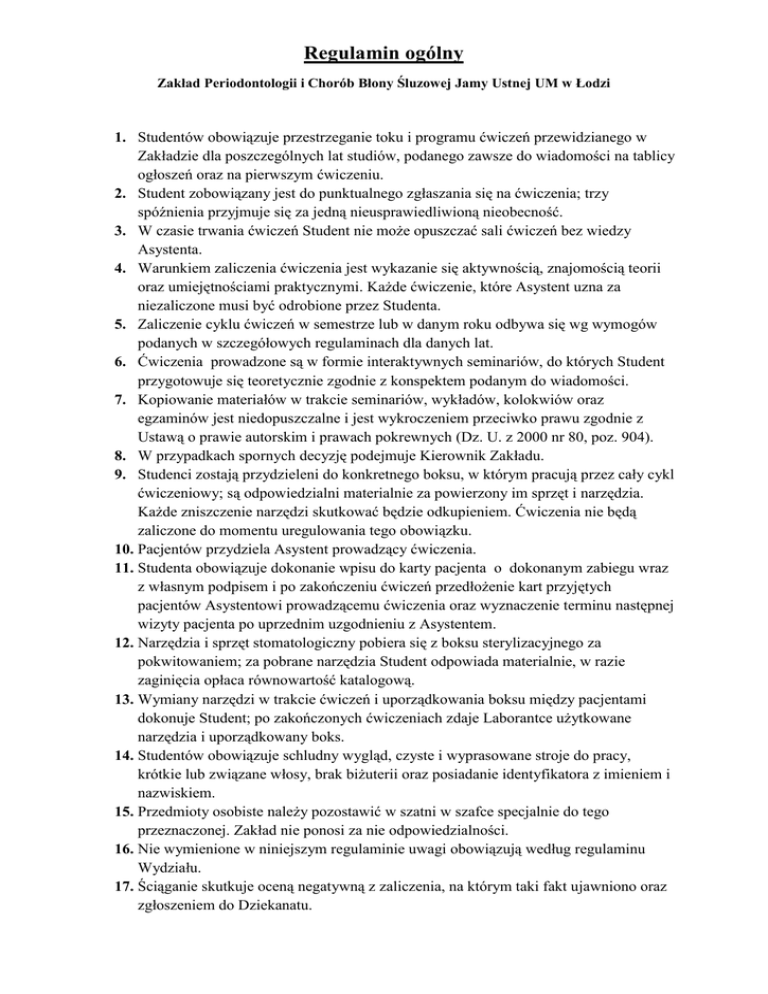 Regulamin ogólny Zakład Periodontologii i Chorób Błony Śluzowej Jamy Ustnej UM w Łodzi 1. Studentów obowiązuje przestrzeganie toku i programu ćwiczeń przewidzianego w Zakładzie dla poszczególnych lat studiów, podanego zawsze do wiadomości na tablicy ogłoszeń oraz na pierwszym ćwiczeniu. 2. Student zobowiązany jest do punktualnego zgłaszania się na ćwiczenia; trzy spóźnienia przyjmuje się za jedną nieusprawiedliwioną nieobecność. 3. W czasie trwania ćwiczeń Student nie może opuszczać sali ćwiczeń bez wiedzy Asystenta. 4. Warunkiem zaliczenia ćwiczenia jest wykazanie się aktywnością, znajomością teorii oraz umiejętnościami praktycznymi. Każde ćwiczenie, które Asystent uzna za niezaliczone musi być odrobione przez Studenta. 5. Zaliczenie cyklu ćwiczeń w semestrze lub w danym roku odbywa się wg wymogów podanych w szczegółowych regulaminach dla danych lat. 6. Ćwiczenia prowadzone są w formie interaktywnych seminariów, do których Student przygotowuje się teoretycznie zgodnie z konspektem podanym do wiadomości. 7. Kopiowanie materiałów w trakcie seminariów, wykładów, kolokwiów oraz egzaminów jest niedopuszczalne i jest wykroczeniem przeciwko prawu zgodnie z Ustawą o prawie autorskim i prawach pokrewnych (Dz. U. z 2000 nr 80, poz. 904). 8. W przypadkach spornych decyzję podejmuje Kierownik Zakładu. 9. Studenci zostają przydzieleni do konkretnego boksu, w którym pracują przez cały cykl ćwiczeniowy; są odpowiedzialni materialnie za powierzony im sprzęt i narzędzia. Każde zniszczenie narzędzi skutkować będzie odkupieniem. Ćwiczenia nie będą zaliczone do momentu uregulowania tego obowiązku. 10. Pacjentów przydziela Asystent prowadzący ćwiczenia. 11. Studenta obowiązuje dokonanie wpisu do karty pacjenta o dokonanym zabiegu wraz z własnym podpisem i po zakończeniu ćwiczeń przedłożenie kart przyjętych pacjentów Asystentowi prowadzącemu ćwiczenia oraz wyznaczenie terminu następnej wizyty pacjenta po uprzednim uzgodnieniu z Asystentem. 12. Narzędzia i sprzęt stomatologiczny pobiera się z boksu sterylizacyjnego za pokwitowaniem; za pobrane narzędzia Student odpowiada materialnie, w razie zaginięcia opłaca równowartość katalogową. 13. Wymiany narzędzi w trakcie ćwiczeń i uporządkowania boksu między pacjentami dokonuje Student; po zakończonych ćwiczeniach zdaje Laborantce użytkowane narzędzia i uporządkowany boks. 14. Studentów obowiązuje schludny wygląd, czyste i wyprasowane stroje do pracy, krótkie lub związane włosy, brak biżuterii oraz posiadanie identyfikatora z imieniem i nazwiskiem. 15. Przedmioty osobiste należy pozostawić w szatni w szafce specjalnie do tego przeznaczonej. Zakład nie ponosi za nie odpowiedzialności. 16. Nie wymienione w niniejszym regulaminie uwagi obowiązują według regulaminu Wydziału. 17. Ściąganie skutkuje oceną negatywną z zaliczenia, na którym taki fakt ujawniono oraz zgłoszeniem do Dziekanatu.