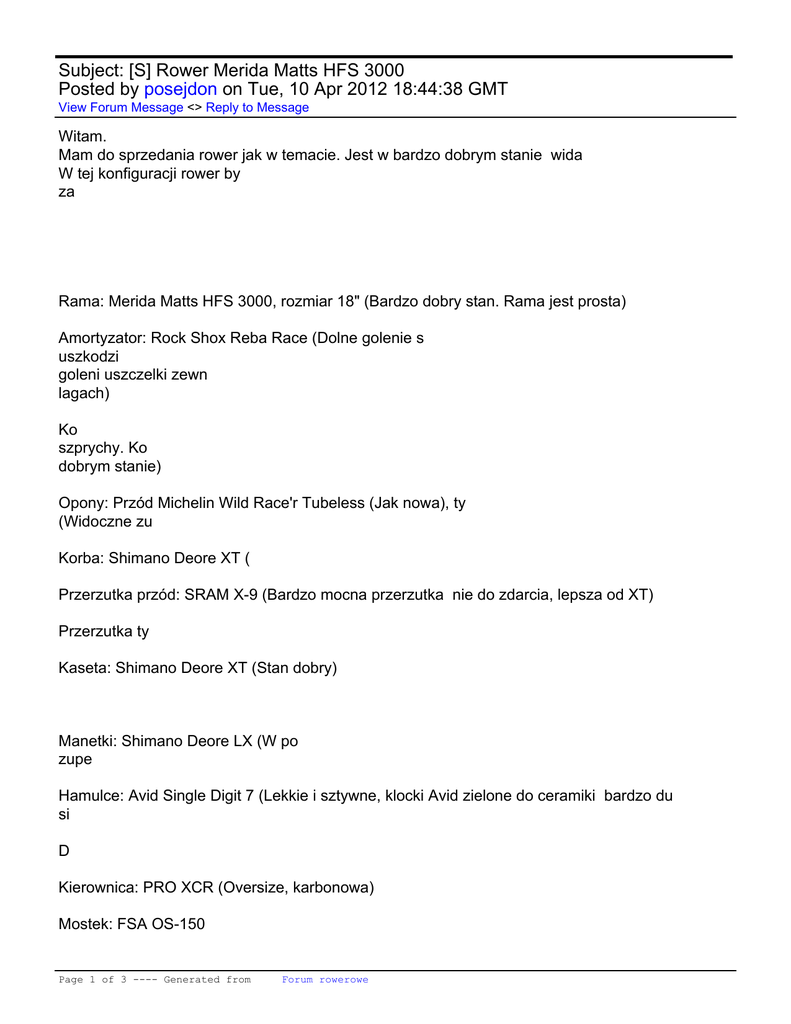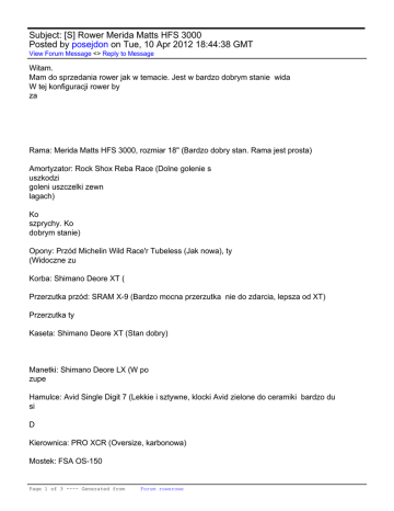 Subject: [S] Rower Merida Matts HFS 3000 Posted by posejdon on Tue, 10 Apr 2012 18:44:38 GMT View Forum Message <> Reply to Message Witam. Mam do sprzedania rower jak w temacie. Jest w bardzo dobrym stanie wida W tej konfiguracji rower by za Rama: Merida Matts HFS 3000, rozmiar 18" (Bardzo dobry stan. Rama jest prosta) Amortyzator: Rock Shox Reba Race (Dolne golenie s uszkodzi goleni uszczelki zewn lagach) Ko szprychy. Ko dobrym stanie) Opony: Przód Michelin Wild Race'r Tubeless (Jak nowa), ty (Widoczne zu Korba: Shimano Deore XT ( Przerzutka przód: SRAM X-9 (Bardzo mocna przerzutka nie do zdarcia, lepsza od XT) Przerzutka ty Kaseta: Shimano Deore XT (Stan dobry) Manetki: Shimano Deore LX (W po zupe Hamulce: Avid Single Digit 7 (Lekkie i sztywne, klocki Avid zielone do ceramiki bardzo du si D Kierownica: PRO XCR (Oversize, karbonowa) Mostek: FSA OS-150 Page 1 of 3 ---- Generated from Forum rowerowe Sztyca: KCNC SC Pro Lite (Scandium) Siod Peda Ponadto rower jest wyposa zacisk podsiod Cena: 3200 PLN (do negocjacji) Zainteresowanych prosz [email protected] Jest oczywi Subject: Odp: [S] Rower Merida Matts HFS 3000 Posted by posejdon on Fri, 20 Apr 2012 20:06:15 GMT View Forum Message <> Reply to Message Aktualizacja. Sprzedaj Rama: 600 PLN (w zestawie zacisk podsiod Amortyzator: 700 PLN Ko zestawu to 800 PLN) Korba: 300 PLN Przerzutka przód: 50 PLN Przerzutka ty Hamulce i klamki: 100 PLN Kierownica: 120 PLN Mostek: 40 PLN Sztyca: 60 PLN Siod Wszystkie cz Ceny oczywi przesy Subject: Odp: [S] Rower Merida Matts HFS 3000 Posted by posejdon on Mon, 23 Apr 2012 19:41:51 GMT View Forum Message <> Reply to Message Page 2 of 3 ---- Generated from Forum rowerowe Zosta Ko Amortyzator, Siod Zapraszam - ceny s Page 3 of 3 ---- Generated from Forum rowerowe