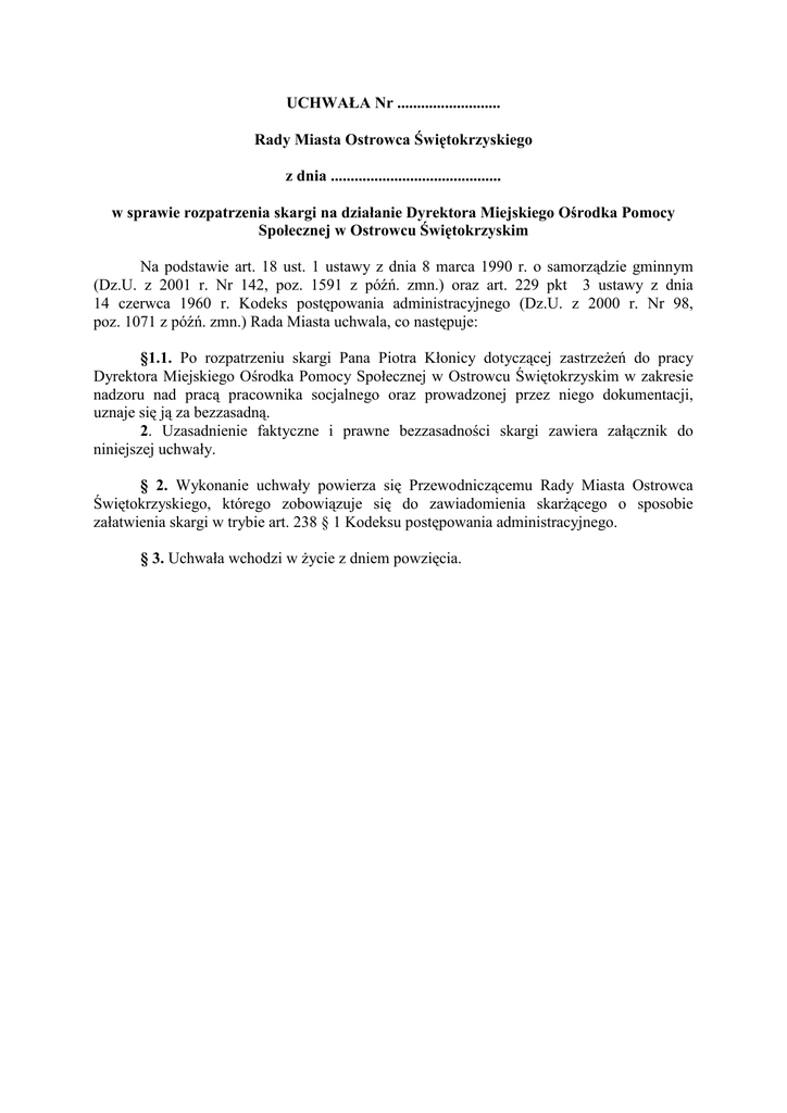 UCHWAŁA Nr .......................... Rady Miasta Ostrowca Świętokrzyskiego z dnia ........................................... w sprawie rozpatrzenia skargi na działanie Dyrektora Miejskiego Ośrodka Pomocy Społecznej w Ostrowcu Świętokrzyskim Na podstawie art. 18 ust. 1 ustawy z dnia 8 marca 1990 r. o samorządzie gminnym (Dz.U. z 2001 r. Nr 142, poz. 1591 z późń. zmn.) oraz art. 229 pkt 3 ustawy z dnia 14 czerwca 1960 r. Kodeks postępowania administracyjnego (Dz.U. z 2000 r. Nr 98, poz. 1071 z późń. zmn.) Rada Miasta uchwala, co następuje: §1.1. Po rozpatrzeniu skargi Pana Piotra Kłonicy dotyczącej zastrzeŜeń do pracy Dyrektora Miejskiego Ośrodka Pomocy Społecznej w Ostrowcu Świętokrzyskim w zakresie nadzoru nad pracą pracownika socjalnego oraz prowadzonej przez niego dokumentacji, uznaje się ją za bezzasadną. 2. Uzasadnienie faktyczne i prawne bezzasadności skargi zawiera załącznik do niniejszej uchwały. § 2. Wykonanie uchwały powierza się Przewodniczącemu Rady Miasta Ostrowca Świętokrzyskiego, którego zobowiązuje się do zawiadomienia skarŜącego o sposobie załatwienia skargi w trybie art. 238 § 1 Kodeksu postępowania administracyjnego. § 3. Uchwała wchodzi w Ŝycie z dniem powzięcia. Załącznik do Uchwały Nr ………………………… Rady Miasta Ostrowca Świętokrzyskiego z dnia ……………………………………………... Uzasadnienie faktyczne i prawne bezzasadności skargi Radzie Miasta Ostrowca Świętokrzyskiego pismem z dnia 9.05.2012 r. znak: PS-80/2035/945/2012 Wiceprezesa Samorządowego Kolegium Odwoławczego w Kielcach mgr Anny Radziejowskiej została przekazana skarga Pana Piotra Kłonicy dotycząca zastrzeŜeń do pracy Dyrektora MOPS w Ostrowcu Świętokrzyskim za niedopilnowanie pracy pracownika socjalnego Pani Krystyny Szwajda i niedopatrzenie w dokumentach dotyczących przyznania świadczeń dla jego byłej Ŝony Anny Chodakowskiej – Kłonica. W dniu 5 czerwca 2012 r. przedmiotowa skarga była rozpatrywana w celu jej zaopiniowania na posiedzeniu Komisji Rewizyjnej. Szczegółowe wyjaśnienia w sprawie będącej przedmiotem skargi Pana Piotra Kłonicy złoŜyła Zastępca Dyrektora MOPS Joanna Gałczyńska. Członkowie Komisji Rewizyjnej Rady Miasta stosunkiem głosów 6 - za, przy braku głosów przeciwnych i wstrzymujących się zaopiniowali, Ŝe skargę naleŜy uznać za bezzasadną. Nie potwierdziły się zarzuty zawarte w skardze, a dotyczące: 1) pobierania świadczeń z MOPS w okresie maj – lipiec 2011 r. i jednocześnie wykonywania pracy zarobkowej za granicą , gdyŜ Pani Anna Chodakowska – Kłonica otrzymała po raz pierwszy zasiłek celowy i pomoc w formie doŜywiania dziecka w szkole dopiero w miesiącu październiku 2011 r. 2) braku dostatecznej dbałości o dzieci i niewłaściwych dla nich warunków socjalno – bytowych w miejscu zamieszkania – wywiad środowiskowy przeprowadzony w mieszkaniu nie stwierdził Ŝadnych nieprawidłowości w opiece nad dziećmi ze strony matki, dom jest zadbany, czysty, wyposaŜony w podstawowy sprzęt gospodarstwa domowego. Dbałość o dzieci potwierdza równieŜ opinia pedagoga szkolnego, z której wynika iŜ matka interesuje się postępami dziecka w nauce. Dziecka jest czyste, ubrane stosownie do pory roku, ma ze sobą zawsze drugie śniadanie. 3) rzekomej znajomości Pani Anny Chodakowskiej – Kłonica z pracownikiem socjalnym i informowanie jej o terminach kontroli, gdyŜ nigdy osoby te nie łączyły i nie łączą Ŝadne prywatne relacje. Pracownik socjalny prowadzący sprawę, o której mowa powyŜej, przy wykonywaniu swoich obowiązków słuŜbowych działał właściwie i zgodnie ze procedurami. W prowadzonej przez niego dokumentacji nie dopatrzono się Ŝadnych uchybień. Dlatego teŜ niezasadnym jest stwierdzenie zawarte w skardze, Ŝe Dyrektor MOPS nie dopilnował pracy i czynności wykonywanych przez pracownika socjalnego oraz nie dopatrzył dokumentacji przez niego prowadzonej w sprawie Pani Anny Chodakowskiej – Kłonica. W świetle wyŜej przytoczonej argumentacji zgodnie z art. 229 pkt 3 k.p.a. Rada Miasta Ostrowca Świętokrzyskiego uznaje skargę za bezzasadną i w trybie art. 238 §1 k.p.a. zobowiązuje Przewodniczącego Rady Miasta Ostrowca Świętokrzyskiego do zawiadomienia skarŜącego o sposobie załatwienia skargi.