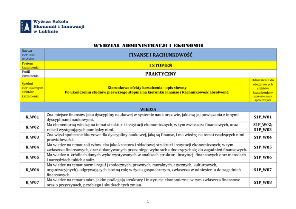 WYDZIAŁ ADMINISTRACJI I EKONOMII Nazwa kierunku studiów: Poziom kształcenia: Profil kształcenia: Symbol kierunkowych efektów kształcenia K_W01 K_W02 K_W03 K_W04 K_W05 K_W06 K_W07 FINANSE I RACHUNKOWOŚĆ I STOPIEŃ PRAKTYCZNY Kierunkowe efekty kształcenia - opis słowny Po ukończeniu studiów pierwszego stopnia na kierunku Finanse i Rachunkowość absolwent: WIEDZA Zna miejsce finansów jako dyscypliny naukowej w systemie nauk oraz wie, jakie są jej powiązania z innymi dyscyplinami naukowymi. Ma elementarną wiedzę na temat struktur i instytucji ekonomicznych, w tym zwłaszcza finansowych, oraz relacji występujących pomiędzy nimi. Zna więzi społeczne kluczowe dla dyscypliny naukowej, jaką są finanse, i ma wiedzę na temat rządzących nimi prawidłowości. Ma wiedzę na temat roli człowieka jako kreatora i składowej struktur i instytucji ekonomicznych, w tym zwłaszcza finansowych, oraz dokonywanych przez niego wyborach odnoszących się do zagadnień finansowych. Ma wiedzę o źródłach danych wykorzystywanych w analizach struktur i instytucji finansowych oraz metodach i narzędziach takich analiz. Ma wiedzę na temat norm i reguł (społecznych, prawnych, moralnych, etycznych, kulturowych, organizacyjnych), odgrywających istotną rolę w życiu gospodarczym, zwłaszcza w odniesieniu do zagadnień finansowych. Ma wiedzę na temat zmian, jakim podlegają struktury i instytucje ekonomiczne, w tym zwłaszcza finansowe oraz o przyczynach, przebiegu i skutkach tych zmian. 1 Odniesienia do obszarowych efektów kształcenia w zakresie nauk społecznych S1P_W01 S1P_W02; S1P_W03 S1P_W04 S1P_W05 S1P_W06 S1P_W07 S1P_W08 K_W08 K_W09 K_W10 K_W11 Zna najważniejsze poglądy na temat struktur i instytucji finansowych oraz więzi społecznych kluczowych dla dyscypliny, jaką są finanse, oraz ich historyczną ewolucję. Zna podstawowe pojęcia i zasady z zakresu ochrony własności przemysłowej i prawa autorskiego w odniesieniu do zagadnień finansowych. Zna zasady tworzenia podmiotów gospodarczych oraz zarządzania nimi i rozwijania ich odnoszące się do zagadnień finansowych. Zna podstawową terminologię używaną w ramach dyscypliny, jaką są finanse, także w studiowanym języku obcym. K_W12 Zna podstawowe zasady odnoszące się do zmiennych finansowych identyfikowanych w organizacjach, w tym zasady dotyczące ewidencjonowania operacji gospodarczych i zarządzania finansami. K_W13 Zna mechanizmy występujące w sferze międzynarodowych relacji pomiędzy strukturami i instytucjami ekonomicznymi, w tym zwłaszcza finansowymi. K_W14 K_W15 Posiada podstawową wiedzę z zakresu podstaw IT oraz pracy z komputerem. Zna zasady bezpieczeństwa i higieny pracy. S1P_W09 S1P_W10 S1P_W05; S1P_W11 S1P_W01; S1P_W02 S1P_W01; S1P_W02; S1P_W03 S1P_W01; S1P_W02; S1P_W03 S1P_W06 S1P_W07 UMIEJĘTNOŚCI K_U01 K_U02 K_U03 K_U04 K_U05 K_U06 K_U07 Umie dokonywać obserwacji oraz prawidłowej interpretacji podstawowych zjawisk ekonomicznych, w tym zwłaszcza ich finansowych aspektów. Bazując na podstawowej wiedzy teoretycznej potrafi w praktyczny sposób opisać i przeanalizować jednostkowe zjawiska i procesy finansowe. Umie objaśnić przyczyny i przebieg wybranych procesów i zjawisk finansowych. Potrafi przewidywać praktyczne skutki konkretnych procesów oraz zjawisk finansowych, posługując się standardowymi metodami i narzędziami typowymi dla dyscypliny, jaką są finanse. Umie rozwiązywać zadania z zakresu finansów posługując się wybranymi normami i regułami prawnymi i etycznymi. Umie wykorzystać zdobytą wiedzę w celu wykonywania podstawowych zadań finansowych w środowisku pracy. Potrafi formułować zalecenia odnośnie do charakteru i kierunku podstawowych decyzji finansowych podejmowanych w przedsiębiorstwie oraz umie wdrożyć te zalecenia. 2 S1P_U01 S1P_U02; S1P_U06 S1P_U03 S1P_U04 S1P_U05 S1P_U06 S1P_U07 K_U08 K_U09 K_U10 K_U11 K_U12 K_U13 K_U14 K_U15 K_U16 K_U17 K_U18 K_U19 K_U20 K_K01 Bazując na wiedzy teoretycznej potrafi dokonać analizy wybranych problemów odnoszących się do zagadnień finansowych. Posiada umiejętność przygotowania typowych prac pisemnych w języku polskim oraz w języku obcym (zgodnie z wymaganiami określonymi dla poziomu B2 Europejskiego Systemu Opisu Kształcenia Językowego) z zakresu finansów odnosząc się podstawowych ujęć teoretycznych oraz różnorodnych źródeł. Posiada umiejętność przygotowania wystąpień ustnych w języku polskim w języku obcym (zgodnie z wymaganiami określonymi dla poziomu B2 Europejskiego Systemu Opisu Kształcenia Językowego) z zakresu finansów odnosząc się do podstawowych ujęć teoretycznych oraz różnorodnych źródeł. Potrafi posługiwać się terminologią używaną w ramach dyscypliny, jaką są finanse. Potrafi posługiwać się podstawowymi zasadami odnoszącymi się do zmiennych finansowych identyfikowanych w organizacjach, w tym zasadami dotyczącymi ewidencjonowania operacji gospodarczych i zarządzania finansami. Umie analizować i oceniać mechanizmy występujące w sferze międzynarodowych relacji pomiędzy strukturami i instytucjami ekonomicznymi, w tym zwłaszcza finansowymi. Potrafi dotrzeć do właściwych źródeł posługujących się językiem rodzimym lub obcym i użyć zawartych w nich zasobów w realizacji zadań odnoszących się do zagadnień finansowych. Potrafi zastosować wybrane narzędzia IT, w tym zwłaszcza pracować wykorzystując komputer, w tym wybrane systemy operacyjne, programy użytkowe oraz aplikacje pozwalające na przeszukiwanie zasobów internetowych. Umie zastosować zasady bezpieczeństwa i higieny pracy. Potrafi w podstawowym zakresie dokonać analizy i interpretacji elementarnych zapisów prawnych dotyczących funkcjonowania struktur i instytucji finansowych. Potrafi samodzielnie zdobywać wiedzę i rozwijać swoje profesjonalne umiejętności a także posiada elementarne umiejętności badawcze w odniesieniu do zagadnień finansowych. Umie 