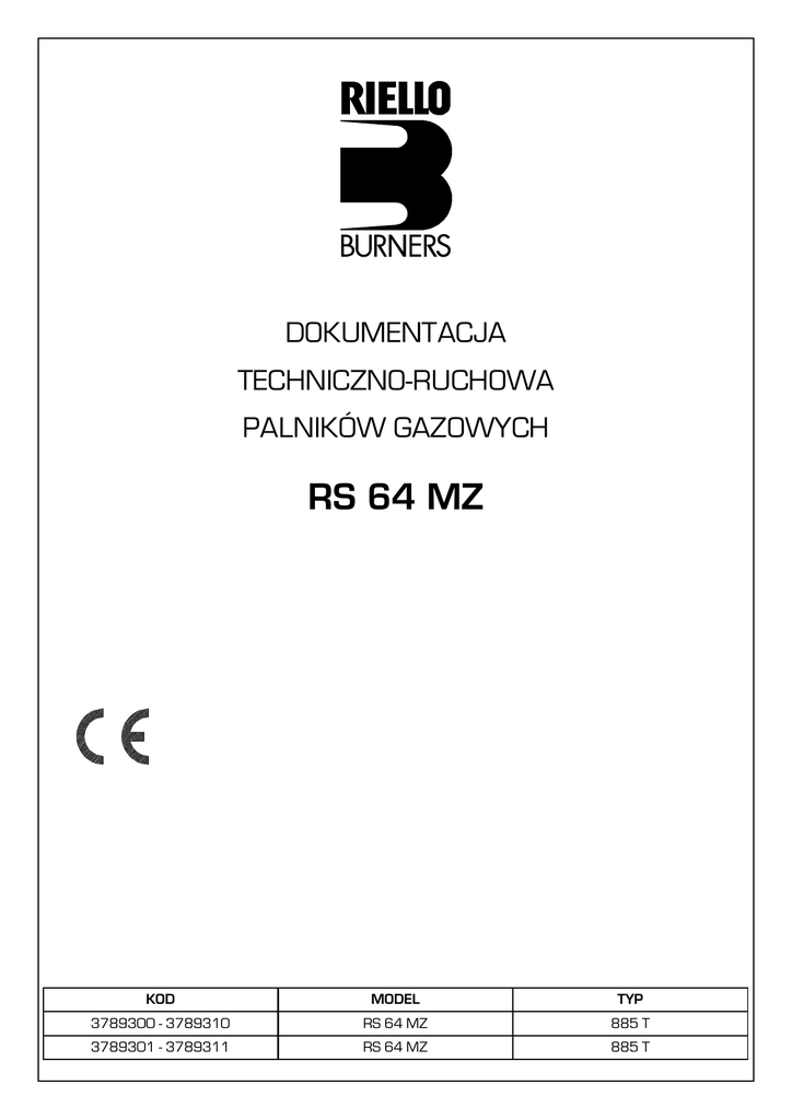 DOKUMENTACJA TECHNICZNO-RUCHOWA PALNIKÓW GAZOWYCH RS 64 MZ KOD MODEL TYP 3789300 - 3789310 RS 64 MZ 885 T 3789301 - 3789311 RS 64 MZ 885 T STR: 2 RS 64 MZ DEKLARACJA O ZGODNOŚCI Z WYMAGANIAMI A.R. 8/1/2004 - Belgia Producent: RIELLO S.p.A. I - 37048 Legnago (VR) Tel. +39.0442.630111 http:// www.riello.it Rozprowadzany przez: RIELLO NV Ninovesteenweg 198 9320 Erembodegem Tel. (053) 769 030 Fax. (053) 789 440 e-mail. [email protected] URL. www.riello.be Niniejszym zaświadczamy, że seria urządzeń wyszczególniona poniżej jest zgodna z typem modelu opisanego w deklaracji zgodności CE, który jest produkowany i oddany do upowszechniania zgodnie z wymaganiami określonymi w A.R. z 8 stycznia 2004 r. Typ produktu : Palnik gazowy z nadmuchem powietrza Model 885 T RS 64 MZ Wielkości mierzone* średnia NOx (mg/kWh) 96,153 CO maks. (mg/kWh) 1 * Działanie z zastosowaniem gazu ziemnego Zastosowane normy : EN 676 i A.R. z 8 stycznia 2004 r. Organy nadzoru: TÜV Industrie Service GmbH TÜV SÜD Gruppe Ridlerstrase, 65 80339 Munchen NIEMCY Data: 01/12/2006 r. Wersja: RS64MZ_i RIELLO S.p.A. STR: 3 RS 64 MZ ➔ Palnik jest oznakowany etykietą CE i zgodny z głównymi wymaganiami następujących Dyrektyw: - Certyfikacja EC N.: 0085BR0588 według 90/396/EEC; - EMC 89/336/CEE; - Niskie napięcie 73/23/CEE; - Maszyny 98/37/CEE; - Wydajność 92/42/CEE. ➔ Palnik odpowiadający stopniowi bezpieczeństwa IP 40 według EN 60529 IDENTYFIKACJA Płytka znamionowa zawiera numer fabryczny, model i główne charakterystyki techniczne. Brak płytki znamionowej lub jej zdjęcie czy zmiana nie pozwala na właściwą identyfikację produktu i powoduje, że operacje instalacji i utrzymania stają się trudne i/lub niebezpieczne. PORADY OGÓLNE Celem zapewnienia spalania przy minimalnym poziomie emisji zanieczyszczających, wymiary i typ komory spalania generatora muszą odpowiadać ściśle określonym wartościom. Jest więc zalecane powiadamianie Służby Technicznej przed wyborem tego palnika dla wyposażenia kotła. Palnik może zostać przeznaczony jedynie do takiego stosowania, do jakiego został celowo zaprojektowany. Konstruktor uchyla się od wszelkiej odpowiedzialności wynikającej z kontraktem lub poza nim, za szkody wyrządzone osobom, zwierzętom lub innym przedmiotom, spowodowane wadliwą instalacją, regulacją, utrzymaniem i niewłaściwym użyciem. INFORMACJE DLA UŻYTKOWNIKA W przypadku wystąpienia nieprawidłowości podczas zapłonu, palnik dokonuje „zatrzymania awaryjnego”, sygnalizowanego czerwonym wskaźnikiem blokowania. Należy wówczas wcisnąć przycisk odblokowania, celem ponownego ustawienia warunków uruchomienia. Wskaźnik czerwony gaśnie, kiedy palnik ponownie się uruchamia. Operacja ta może zostać powtórzona maksymalnie 3 krotnie. W przypadku zbyt licznych „zatrzymań awaryjnych", niezbędne jest wezwanie obsługi posprzedażnej. PODSTAWOWE NORMY BEZPIECZEŃSTWA ➔ Używanie urządzenia przez dzieci lub osoby niedoświadczone jest zabronione. ➔ Jest ściśle zabronione zatykanie kratek wlotowych i otworu wentylacyjnego pomieszczenia, gdzie urządzenie jest zainstalowane, za pomocą szmat, papieru lub innych rzeczy. ➔ Zabrania się dokonywania napraw przez osoby nieuprawnione. ➔ Nie naciągać lub skręcać kabli elektrycznych. ➔ Zawsze odłączać urządzenie od zasilania elektrycznego, przed przeprowadzeniem jakiejkolwiek czynności czyszczenia. ➔ Nie czyścić palnika lub jego części za pomocą substancji łatwopalnych (np. benzyny, alkoholu, itd.). Obudowę czyścić jedynie za pomocą wody z mydłem. ➔ Nie kłaść żadnego przedmiotu na palniku. ➔ Nie pozostawiać pojemników lub substancji palnych w pomieszczeniu, gdzie urządzenie jest zainstalowane. W niektórych częściach podręcznika, stosowane są następujące symbole : UWAGA = w przypadku czynności wymagających pewnej ostrożności i odpowiedniego przygotowania ZABRONIONE = dla czynności, które bezwzględnie NIE POWINNY BYĆ wykonywane. Wersja: RS64MZ_i STR: 4 RS 64 MZ SPIS TREŚCI SPECYFIKACJA TECHNICZNA......................................................... Dane techniczne............................................................................ Akcesoria dodatkowe........................................................................ Opis palnika................................................................................... Opakowanie - waga ......................................................................... Wymiary zewnętrzne...................................................................... Wyposażenie standardowe.............................................................. Zakresy mocy................................................................................ Wzorcowa komora spalania............................................................. Ciśnienie gazu.............................................................................. 5 5 5 6 6 6 6 7 7 8 INSTALACJA............................................................................... Płyta kotła..................................................................................... Długość głowicy............................................................................ Mocowanie palnika do kotła............................................................. Regulacja głowicy spalającej............................................................ Linia zasilania gazem ...................................................................... Regulacja przed pierwszym uruchomieniem........................................ Sterownik..................................................................................... Uruchomienie palnika..................................................................... Zapalenie palnika........................................................................... Regulacja palnika:.......................................................................... 1 - M