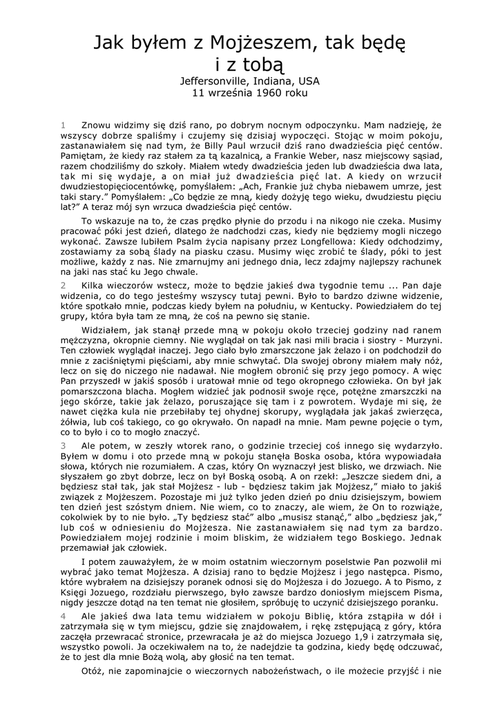 Jak byłem z Mojżeszem, tak będę i z tobą Jeffersonville, Indiana, USA 11 września 1960 roku 1 Znowu widzimy się dziś rano, po dobrym nocnym odpoczynku. Mam nadzieję, że wszyscy dobrze spaliśmy i czujemy się dzisiaj wypoczęci. Stojąc w moim pokoju, zastanawiałem się nad tym, że Billy Paul wrzucił dziś rano dwadzieścia pięć centów. Pamiętam, że kiedy raz stałem za tą kazalnicą, a Frankie Weber, nasz miejscowy sąsiad, razem chodziliśmy do szkoły. Miałem wtedy dwadzieścia jeden lub dwadzieścia dwa lata, tak mi się wydaje, a on miał już dwadzieścia pięć lat. A kiedy on wrzucił dwudziestopięciocentówkę, pomyślałem: „Ach, Frankie już chyba niebawem umrze, jest taki stary.” Pomyślałem: „Co będzie ze mną, kiedy dożyję tego wieku, dwudziestu pięciu lat?” A teraz mój syn wrzuca dwadzieścia pięć centów. To wskazuje na to, że czas prędko płynie do przodu i na nikogo nie czeka. Musimy pracować póki jest dzień, dlatego że nadchodzi czas, kiedy nie będziemy mogli niczego wykonać. Zawsze lubiłem Psalm życia napisany przez Longfellowa: Kiedy odchodzimy, zostawiamy za sobą ślady na piasku czasu. Musimy więc zrobić te ślady, póki to jest możliwe, każdy z nas. Nie zmarnujmy ani jednego dnia, lecz zdajmy najlepszy rachunek na jaki nas stać ku Jego chwale. 2 Kilka wieczorów wstecz, może to będzie jakieś dwa tygodnie temu ... Pan daje widzenia, co do tego jesteśmy wszyscy tutaj pewni. Było to bardzo dziwne widzenie, które spotkało mnie, podczas kiedy byłem na południu, w Kentucky. Powiedziałem do tej grupy, która była tam ze mną, że coś na pewno się stanie. Widziałem, jak stanął przede mną w pokoju około trzeciej godziny nad ranem mężczyzna, okropnie ciemny. Nie wyglądał on tak jak nasi mili bracia i siostry - Murzyni. Ten człowiek wyglądał inaczej. Jego ciało było zmarszczone jak żelazo i on podchodził do mnie z zaciśniętymi pięściami, aby mnie schwytać. Dla swojej obrony miałem mały nóż, lecz on się do niczego nie nadawał. Nie mogłem obronić się przy jego pomocy. A więc Pan przyszedł w jakiś sposób i uratował mnie od tego okropnego człowieka. On był jak pomarszczona blacha. Mogłem widzieć jak podnosił swoje ręce, potężne zmarszczki na jego skórze, takie jak żelazo, poruszające się tam i z powrotem. Wydaje mi się, że nawet ciężka kula nie przebiłaby tej ohydnej skorupy, wyglądała jak jakaś zwierzęca, żółwia, lub coś takiego, co go okrywało. On napadł na mnie. Mam pewne pojęcie o tym, co to było i co to mogło znaczyć. 3 Ale potem, w zeszły wtorek rano, o godzinie trzeciej coś innego się wydarzyło. Byłem w domu i oto przede mną w pokoju stanęła Boska osoba, która wypowiadała słowa, których nie rozumiałem. A czas, który On wyznaczył jest blisko, we drzwiach. Nie słyszałem go zbyt dobrze, lecz on był Boską osobą. A on rzekł: „Jeszcze siedem dni, a będziesz stał tak, jak stał Mojżesz - lub - będziesz takim jak Mojżesz,” miało to jakiś związek z Mojżeszem. Pozostaje mi już tylko jeden dzień po dniu dzisiejszym, bowiem ten dzień jest szóstym dniem. Nie wiem, co to znaczy, ale wiem, że On to rozwiąże, cokolwiek by to nie było. „Ty będziesz stać” albo „musisz stanąć,” albo „będziesz jak,” lub coś w odniesieniu do Mojżesza. Nie zastanawiałem się nad tym za bardzo. Powiedziałem mojej rodzinie i moim bliskim, że widziałem tego Boskiego. Jednak przemawiał jak człowiek. I potem zauważyłem, że w moim ostatnim wieczornym poselstwie Pan pozwolił mi wybrać jako temat Mojżesza. A dzisiaj rano to będzie Mojżesz i jego następca. Pismo, które wybrałem na dzisiejszy poranek odnosi się do Mojżesza i do Jozuego. A to Pismo, z Księgi Jozuego, rozdziału pierwszego, było zawsze bardzo doniosłym miejscem Pisma, nigdy jeszcze dotąd na ten temat nie głosiłem, spróbuję to uczynić dzisiejszego poranku. 4 Ale jakieś dwa lata temu widziałem w pokoju Biblię, która zstąpiła w dół i zatrzymała się w tym miejscu, gdzie się znajdowałem, i rękę zstępującą z góry, która zaczęła przewracać stronice, przewracała je aż do miejsca Jozuego 1,9 i zatrzymała się, wszystko powoli. Ja oczekiwałem na to, że nadejdzie ta godzina, kiedy będę odczuwać, że to jest dla mnie Bożą wolą, aby głosić na ten temat. Otóż, nie zapominajcie o wieczornych nabożeństwach, o ile możecie przyjść i nie Jak byłem z Mojżeszem, tak będę i z tobą 2 macie jakiegoś posterunku. Jeżeli macie zbory, które was potrzebują, oczywiście, polecamy wam wasz zbór. Dzisiejszego poranku będziemy się modlić za chorymi zaraz po skończeniu poselstwa. Wydaje mi się, że zaraz potem odbędzie się uroczystość chrztu. Natomiast dzisiejszego wieczoru, jeżeli Pan pozwoli, pragnę głosić na temat: „Pięć niezawodnych, biblijnych cech tożsamości kościoła” i naszego stosunku wobec niego, wobec kościoła Nowego Testamentu. A nabożeństwo, usługa pieśni rozpocznie się o godzinie 19.30, o godzinie 20.00 będę chciał stać już za kazalnicą. Zakończyć chcielibyśmy o godzinie 21.30, jeżeli Pan pozwoli. 5 A potem, mam nadzieję, że dzisiaj nie stanie się, żeby jedno słowo ... Kiedy dojdę do sprawy polecenia, że nikomu z was ta sprawa nie uniknie, ponieważ jest bardzo ważną rzeczą, abyśmy w obecnej chwili odłożyli wszystko na bok i rozważali w oczekiwaniu na Ducha Świętego. Zanim przystąpimy do tego wspaniałego i kosztownego Słowa, chciałbym poprosić mojego dobrego przyjaciela i współpracownika doktora Lee Vayle, żeby powstał i poprowadził nas kilkoma słowami modlitwy, zanim otworzymy Słowo. Bracie Vayle. [Brat Vayle zaczyna się modlić, później na taśmie jest puste miejsce]. Dziękuję ci, bracie Vayle, za tę inspirującą modlitwę do Boga. 6 A więc teraz zechciejmy otworzyć Pismo. Jest wiele rzeczy do powiedzenia, ale oglądam ile ludzi m