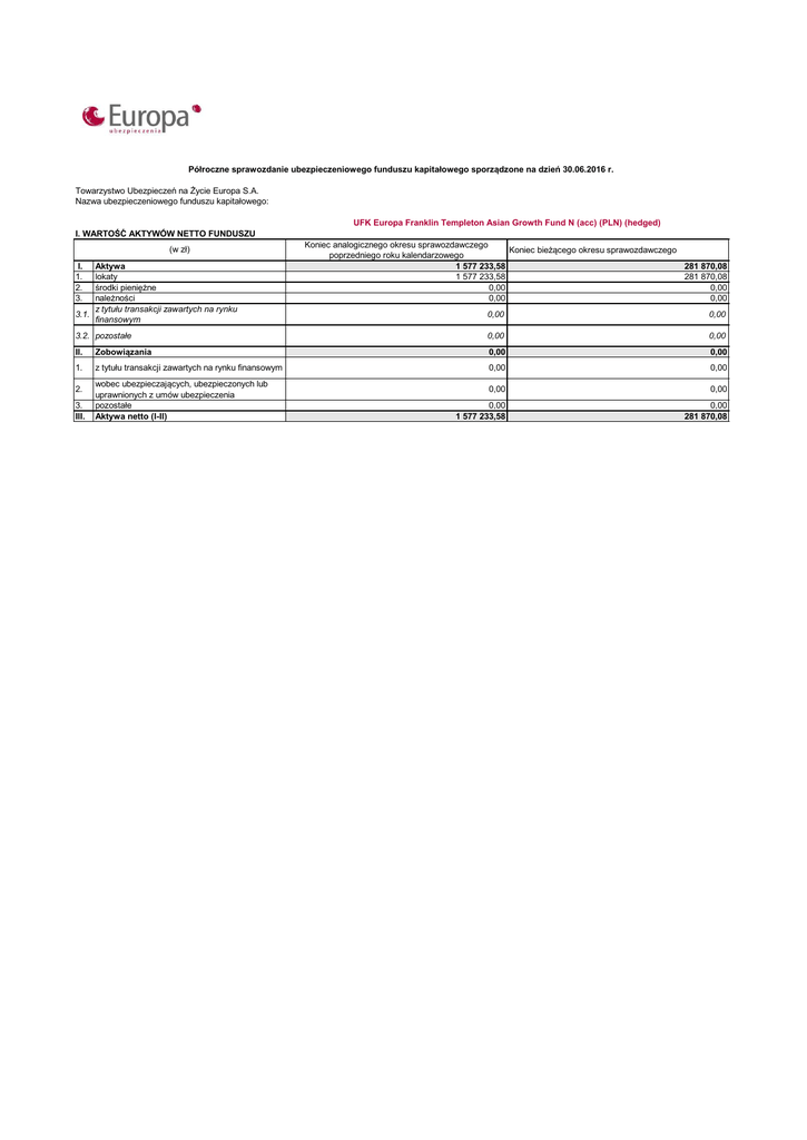 Półroczne sprawozdanie ubezpieczeniowego funduszu kapitałowego sporządzone na dzień 30.06.2016 r. Towarzystwo Ubezpieczeń na Życie Europa S.A. Nazwa ubezpieczeniowego funduszu kapitałowego: UFK Europa Franklin Templeton Asian Growth Fund N (acc) (PLN) (hedged) I. WARTOŚĆ AKTYWÓW NETTO FUNDUSZU (w zł) I. 1. 2. 3. Aktywa lokaty środki pieniężne należności z tytułu transakcji zawartych na rynku 3.1. finansowym 3.2. pozostałe Koniec analogicznego okresu sprawozdawczego Koniec bieżącego okresu sprawozdawczego poprzedniego roku kalendarzowego 1 577 233,58 281 870,08 1 577 233,58 281 870,08 0,00 0,00 0,00 0,00 0,00 0,00 0,00 0,00 II. Zobowiązania 0,00 0,00 1. z tytułu transakcji zawartych na rynku finansowym 0,00 0,00 0,00 0,00 0,00 1 577 233,58 0,00 281 870,08 2. 3. III. wobec ubezpieczających, ubezpieczonych lub uprawnionych z umów ubezpieczenia pozostałe Aktywa netto (I-II) Półroczne sprawozdanie ubezpieczeniowego funduszu kapitałowego sporządzone na dzień 30.06.2016 r. Towarzystwo Ubezpieczeń na Życie Europa S.A. Nazwa ubezpieczeniowego funduszu kapitałowego: UFK Europa Franklin Templeton Asian Growth Fund N (acc) (PLN) (hedged) II. ZMIANY WARTOŚCI AKTYWÓW NETTO FUNDUSZU Analogiczny okres sprawozdawczy poprzedniego roku (w zł) Bieżący okres sprawozdawczy kalendarzowego A. Aktywa netto funduszu na początek okresu 2 379 906,70 297 262,21 sprawozdawczego -776 845,14 -27 088,17 B. Stan netto z działalności operacyjnej (I–II) 923 526,96 0,00 I. Zwiększenia funduszu 1. tytułem składek zwiększających wartość funduszu 923 526,96 0,00 0,00 0,00 2. pozostałe przychody 0,00 0,00 3. pozostałe zwiększenia 1 700 372,10 27 088,17 II. Zmniejszenia funduszu 1 689 016,63 25 679,80 1. tytułem wykupu 2. tytułem wypłat pozostałych świadczeń 0,00 0,00 ubezpieczeniowych 3. tytułem opłat za ryzyko ubezpieczeniowe oraz 243,49 41,07 innych opłat potrącanych z fuduszu 0,00 0,00 4. tytułem zwrotu składek ubezpieczeniowych 5. tytułem opłat za zarządzanie funduszem oraz innych opłat tytułem administrowania funduszem 1 367,30 11 111,98 0,00 0,00 6. pozostałe koszty 7. pozostałe zmniejszenia C. Wynik netto z działalności inwestycyjnej D. Aktywa netto funduszu na koniec okresu sprawozdawczego 0,00 -25 827,98 0,00 11 696,04 1 577 233,58 281 870,08 Półroczne sprawozdanie ubezpieczeniowego funduszu kapitałowego sporządzone na dzień 30.06.2016 r. Towarzystwo Ubezpieczeń na Życie Europa S.A. Nazwa ubezpieczeniowego funduszu kapitałowego: III I. 1. 2. II. 1. 2. 3. 4. UFK Europa Franklin Templeton Asian Growth Fund N (acc) (PLN) (hedged) LICZBA I WARTOŚĆ JEDNOSTEK ROZRACHUNKOWYCH Analogiczny okres sprawozdawczy poprzedniego roku Pozycja Bieżący okres sprawozdawczy kalendarzowego Liczba jednostek rozrachunkowych: 169 750,84 na początek okresu sprawozdawczego 116 143,87 na koniec okresu sprawozdawczego Wartość jednostki rozrachunkowej: 14,02 na początek okresu sprawozdawczego minimalna wartość jednostki rozrachunkowej w 13,52 okresie sprawozdawczym maksymalna wartość jednostki rozrachunkowej w 15,37 okresie sprawozdawczym 13,58 na koniec okresu sprawozdawczego 28 804,47 25 954,91 10,32 9,17 11,11 10,86 Półroczne sprawozdanie ubezpieczeniowego funduszu kapitałowego sporządzone na dzień 30.06.2016 r. Towarzystwo Ubezpieczeń na Życie Europa S.A. Nazwa ubezpieczeniowego funduszu kapitałowego: UFK Europa Franklin Templeton Asian Growth Fund N (acc) (PLN) (hedged) IV I. 1. 2. ZESTAWIENIE AKTYWÓW NETTO FUNDUSZU– PÓŁROCZNE 1 Lokaty (suma 1-12) papiery wartościowe emitowane, poręczone lub gwarantowane przez Skarb Państwa lub organizacje międzynarodowe, których członkiem jest Rzeczpospolita Polska obligacje emitowane lub poręczone przez jednostki samorządu terytorialnego lub związki jednostek samorządu terytorialnego Wartość bilansowa (w zł) 2 Udział w aktywach netto funduszu (w %) 3 281 870,08 100,00% 0,00 0,00% 0,00 0,00% 3. Inne dłużne papiery wartościowe o stałej stopie dochodu 0,00 0,00% 4. 5. 6. akcje udziały jednostki uczestnictwa i certyfikaty inwestycyjne w funduszach inwestycyjnych instrumenty pochodne inne papiery wartościowe o zmiennej kwocie dochodu pożyczki nieruchomości depozyty bankowe pozostałe lokaty Środki pieniężne Należności Zobowiązania Aktywa netto (w tym) krajowe zagraniczne – państwa UE zagraniczne – państwa poza UE 0,00 0,00% 0,00% 281 870,08 100,00% 0,00 0,00 0,00 0,00 0,00 0,00 0,00 0,00 0,00 281 870,08 0,00 281 870,08 0,00 0,00% 0,00% 0,00% 0,00% 0,00% 0,00% 0,00% 0,00% 0,00% 100,00% 0,00% 100,00% 0,00% 7. 8. 9. 10. 11. 12. II. III. IV. V. 1. 2. 3.