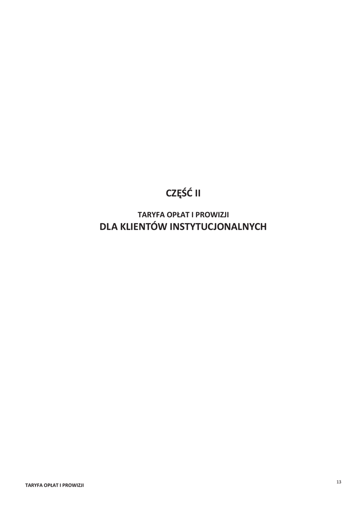 CZĘŚĆ II TARYFA OPŁAT I PROWIZJI DLA KLIENTÓW INSTYTUCJONALNYCH TARYFA OPŁAT I PROWIZJI 13 ROZDZIAŁ I. NOWA LINIA RACHUNKÓW BIEŻĄCYCH 1.1. Rachunki bieżące dla przedsiębiorstw Tryb pobierania opłaty Konto BIZNES START Konto BIZNES PREMIUM Konto BIZNES PRESTIGE opłata jednorazowa miesięcznie 0,00 15,00 0,00 30,00 0,00 59,00 miesięcznie 10,00 10,00 0,00 - na rachunki prowadzone w Banku - na rachunki ZUS, Urzędu Skarbowego od każdego przelewu od każdego przelewu 0,00 1,00 0,00 0,50 0,00 0,50 - na rachunki prowadzone w innych bankach od każdego przelewu 1,50 1,00 1,00 - przelew ekspresowy (BlueCash) - przelew pilny (SORBNET, kwota 1.000.000 zł i więcej) od każdego przelewu od każdego przelewu 5,00 25,00 5,00 25,00 5,00 25,00 - przelew pilny (SORBNET, kwota niższa niż 1.000.000 zł) od każdego przelewu 35,00 35,00 35,00 WYKONYWANE W WIELOFUNKCYJNYCH URZĄDZENIACH SAMOOBSŁUGOWYCH BS TORUŃ - na rachunki prowadzone w Banku od każdego przelewu - na rachunki prowadzone w innych bankach od każdego przelewu 0,00 0,00 0,00 1,50 1,00 1,00 2,00 6,00 2,00 6,00 2,00 6,00 Rodzaj czynności/usługi Otwarcie i prowadzenie rachunku Otwarcie rachunku bieżącego/pomocniczego Prowadzenie rachunku podstawowego Prowadzenie rachunku pomocniczego Przelewy WYKONYWANE PRZEZ INTERNET BANKING WYKONYWANE W PLACÓWCE - na rachunki prowadzone w Banku4 od każdego przelewu - na rachunki ZUS, Urzędu Skarbowego - na rachunki prowadzone w innych bankach od każdego przelewu od każdego przelewu 6,00 6,00 6,00 - przelew ekspresowy (BlueCash) - przelew pilny (SORBNET, kwota 1.000.000 zł i więcej) od każdego przelewu od każdego przelewu 10,00 25,00 10,00 25,00 10,00 25,00 - przelew pilny (SORBNET, kwota niższa niż 1.000.000 zł) od każdego przelewu 35,00 35,00 35,00 Ustanowienie zlecenia stałego za pośrednictwem internetu od każdej dyspozycji 0,00 0,00 0,00 Ustanowienie zlecenia stałego w placówce Modyfikacja/odwołanie zlecenia stałego za pośrednictwem internetu od każdej dyspozycji od każdej dyspozycji 3,00 0,00 3,00 0,00 3,00 0,00 Modyfikacja/odwołanie zlecenia stałego w placówce od każdej dyspozycji 3,00 3,00 3,00 Realizacja zlecenia na rachunki prowadzone w Banku Realizacja zlecenia na rachunki ZUS, Urzędu Skarbowego od każdego przelewu od każdego przelewu 0,00 1,00 0,00 0,50 0,00 0,50 Realizacja zlecenia na rachunki prowadzone w innych bankach od każdego przelewu 1,50 1,20 1,00 Ustanowienie/modyfikacja/odwołanie polecenia zapłaty od każdej dyspozycji 3,00 3,00 3,00 Odwołanie pojedynczego polecenia zapłaty Realizacja polecenia zapłaty na rachunki prowadzone w Banku od każdej dyspozycji od każdego przelewu 3,00 0,00 3,00 0,00 3,00 0,00 Realizacja polecenia zapłaty na rachunki prowadzone w innych bankach od każdego przelewu 1,50 1,20 1,00 od każdej wpłaty 0,20% (min. 2,00) 0,15%(min. 2,00) 0,10% (min. 2,00) od każdej wpłaty 0,40% (min. 5,00) 0,30% (min. 5,00) 0,20% (min. 5,00) od każdej wpłaty 0,30% (min. 5,00) 0,20% (min. 5,00) 0,15% (min. 5,00) od każdej wypłaty od każdej wypłaty od każdej wypłaty 0,00 0,15% 0,30% (min. 5,00) 0,00 0,15% 0,20% (min. 5,00) 0,00 0,15% 0,15% (min. 5,00) Zlecenia stałe Polecenie zapłaty Wpłaty gotówkowe Wpłaty gotówkowe na rachunek dokonywane w wielofunkcyjnych urządzeniach samoobsługowych BS Toruń Wpłaty gotówkowe na rachunek dokonywane w placówce (w przypadku wpłaty przez osoby trzecie - opłata pobierana od wpłacającego) Wpłaty gotówkowe na rachunek dokonywane w formie zamkniętej Wypłaty gotówkowe Wypłaty gotówkowe z rachunku dokonywane w wielofunkcyjnych urządzeniach samoobsługowych BS Toruń a) do kwoty 5000 zł włącznie b) powyżej kwoty 5000 zł Wypłaty gotówkowe z rachunku dokonywane w placówce Wyciągi Wyciąg za okres danego miesiąca (wersja zgodnie z wyborem dokonanym przez Klienta) - w wersji elektronicznej pobierany przez Klienta za pośrednictwem Internet za każdy wyciąg Bankingu/Internet Bankingu dla Firm - w wersji elektronicznej wysyłany na adres e-mail za każdy wyciąg - w wersji papierowej wysyłany listem zwykłym za każdy wyciąg - w wersji papierowej odbierany w oddziale za każdy wyciąg Dodatkowe wyciągi (zgodnie z życzeniem Klienta) - w wersji elektronicznej wysyłany na adres e-mail - w wersji papierowej wysyłany listem zwykłym - w wersji papierowej odbierany w oddziale - dane historyczne (powyżej 12 miesięcy) za każdy wyciąg za każdy wyciąg za każdy wyciąg za każdy wyciąg 0,00 0,00 0,00 0,00 0,00 0,00 0,00 0,00 0,00 0,00 0,00 0,00 0,00 10,00 10,00 25,00 0,00 10,00 10,00 25,00 0,00 10,00 10,00 25,00 4 Nie dotyczy przelewów na rachunek lokaty terminowej Posiadacza, konta oszczędnościowego Posiadacza oraz związanych z zakupem jednostek uczestnictwa TFI i obsługą zobowiązań w stosunku do Banku TARYFA OPŁAT I PROWIZJI 14 1.2. Rachunki bieżące dla indywidualnych gospodarstw rolnych Tryb pobierania opłaty Rodzaj czynności/usługi Konto AGRO START Konto AGRO PREMIUM Konto AGRO PRESTIGE Otwarcie i prowadzenie rachunku Otwarcie rachunku podstawowego/pomocniczego opłata jednorazowa 0,00 0,00 0,00 miesięcznie miesięcznie 12,00 10,00 25,00 10,00 55,00 0,00 - na rachunki prowadzone w Banku - na rachunki ZUS, Urzędu Skarbowego od każdego przelewu od każdego przelewu 0,00 1,00 0,00 0,50 0,00 0,50 - na rachunki prowadzone w innych bankach - przelew ekspresowy (BlueCash) od każdego przelewu od każdego przelewu 1,50 5,00 1,00 5,00 1,00 5,00 - przelew pilny (SORBNET, kwota 1.000.000 zł i więcej) - przelew pilny (SORBNET, kwota niższa niż 1.000.000 zł) od każdego przelewu od każdego przelewu 25,00 35,00 25,00 35,00 25,00 35,00 WYKONYWANE W WIELOFUNKCYJNYCH URZĄDZENIACH SAMOOBSŁUGOWYCH BS TORUŃ - na rachunki prowadzone w Banku od każdego przelewu - na rachunki prowadzone w innych bankach od każdego przelewu 0,00 1,50 0,00 1,00 0,00 1,00 2,00 6,00 2,00 6,00 Prowadzenie rachunku podstawowego Prowadzenie rachunku pomocniczego Przelewy