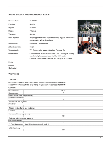 Austria, Stubaital, hotel Medrazerhof, autokar Symbol oferty: 5443587/111 Państwo: Austria Region: Stubaital Miasto: Fulpmes Transport: Autokar Profil wyjazdu: Pobyt wypoczynkowy, Wyjazd rodzinny, Wyjazd biznesowo - Wyżywienie: śniadanie, Obiadokolacje Zakwaterowanie: Hotel Wyposażenie: TV, Restauracja, sauna, Solarium, Parking, Bar świadczenia: Cana zawiera: przejazd autokarem Lux, 7 noclegów, opiekę motywacyjny, Wyjazd narciarski rezydenta i pilota, ubezpieczenie KL,NW, bagaż. Cena nie zawiera: ubezpiecznie Ski, napojów so posiłków Hotel aaaaaa Stubaital Wyżywienie TERMINY: od: 2017-03-10 do: 2017-03-19 (10 dni), miejsca: zamów cena od: 1690 PLN od: 2017-03-17 do: 2017-03-26 (10 dni), miejsca: zamów cena od: 1690 PLN CENNIK: Długość pobytu: 10 dni Grupa cenowa: A Ubezpieczenie (obligatoryjne) (*) ubezpieczenie NWKL Transport (do wyboru) (*) Autokar Miasto wyjazdowe (do wyboru) (*) Kraków Warszawa Piłusdskiego (19:00) Pobyt w obiekcie (do wyboru) dziecko 0-2 lat-gratis (*) Pokój dwuosobowy - duże łóżko standardowo dla osób: 2 pokój 1-osobowy (-) (-) (-) 100 (-) (-) 350 1/2 pokój 3 osobowy standardowo dla osób: 3 Rodzaj osoby (do wyboru) (*) osoba dorosła dz2-12 jako 3os Ubezpieczenie (opcjonalne) ubezpieczenie NWKL + SKI (-) 1690 1390 45 Waluta: PLN Aktualne ceny z systemu S.A.R.T. (-) - cena usługi, podatku kalkulowana przy osobie lub gratis (*) - kwota wliczona w cenę standardową 2/2