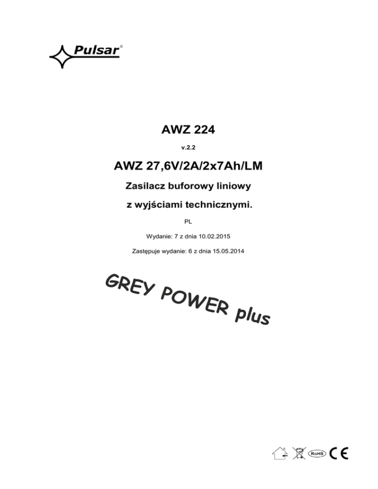 AWZ 224 v.2.2 AWZ 27,6V/2A/2x7Ah/LM Zasilacz buforowy liniowy z wyjściami technicznymi. PL Wydanie: 7 z dnia 10.02.2015 Zastępuje wydanie: 6 z dnia 15.05.2014 GREY POW ER plus www.pulsar.pl AWZ224 GREY POWER plus Cechy zasilacza: zgodność z normą PN-EN50131-6 w stopniu 1, 2 i klasy środowiskowej II napięcie zasilania AC 230V bezprzerwowe zasilanie DC 27,6V miejsce na akumulator 2x7Ah/12V wydajność prądowa zasilacza: 0,58A – dla stopnia 1 , 2 * 2A – dla ogólnego zastosowania ** (patrz rozdz. 1.1) liniowy stabilizator napięcia mikroprocesorowy system automatyki kontrola napięcia wyjściowego dynamiczny test akumulatora kontrola ciągłości obwodu akumulatora kontrola napięcia akumulatora kontrola stanu bezpiecznika akumulatora kontrola ładowania i konserwacji akumulatora ochrona akumulatora przed nadmiernym rozładowaniem (UVP) zabezpieczenie wyjścia akumulatora przed zwarciem i odwrotnym podłączeniem prąd ładowania akumulatora 0,4A funkcja START manualnego załączenia zasilania z akumulatora funkcja STOP manualnego wyłączenia podczas pracy akumulatorowej sygnalizacja optyczna LED sygnalizacja akustyczna wyjście techniczne EPS zaniku sieci 230V- typu OC wyjście techniczne PSU sygnalizacji awarii zasilacza i akumulatora - typu OC wyjście techniczne LoB niskiego napięcia akumulatora – typu OC opcja montażu modułu przekaźnikowego MPSBS zmieniającego wyjścia techniczne typu OC na przekaźnikowe regulowane czasy sygnalizacji zaniku sieci AC zabezpieczenia: przeciwzwarciowe SCP przeciążeniowe OLP nadnapięciowe OVP termiczne OHP przepięciowe antysabotażowe gwarancja – 5 lat od daty produkcji SPIS TREŚCI: 1. Opis techniczny. 1.1. Opis ogólny 1.2. Schemat blokowy 1.3. Opis elementów i złącz zasilacza 1.4. Parametry techniczne 2. Instalacja. 2.1. Wymagania 2.2. Procedura instalacji 3. Sygnalizacja pracy zasilacza. 3.1. Sygnalizacja optyczna 3.2. Sygnalizacja akustyczna 3.3. Wyjścia techniczne 3.4. Wyjścia techniczne przekaźnikowe. 4. Praca bateryjna. 4.1. Uruchomienie zasilacza z akumulatora 4.2. Ochrona akumulatora przed nadmiernym rozładowaniem UVP 4.3. Dynamiczny test akumulatora 4.4. Okres gotowości 4.5. Czas ładowania akumulatora 5. Obsługa oraz eksploatacja. 5.1. Zabezpieczenie nadnapięciowe OVP wyjścia zasilacza 5.2. Przeciążenie lub zwarcie wyjścia zasilacza (zadziałanie SCP) 5.3. Konserwacja. 1. Opis techniczny. 1.1. Opis ogólny. Zasilacz buforowy został zaprojektowany zgodnie z wymaganiami normy PN-EN 50131-6 w stopniu 1, 2 i klasie środowiskowej II. Zasilacz buforowy przeznaczony jest do nieprzerwanego zasilania urządzeń systemów alarmowych wymagających stabilizowanego napięcia 24V DC (+/-15%). Zastosowany w urządzeniu liniowy układ stabilizacyjny dostarcza napięcia o mniejszym poziomie szumów i krótszym czasie odpowiedzi na zakłócenie, niż w przypadku stosowania stabilizatora impulsowego. 2 www.pulsar.pl AWZ224 GREY POWER plus W zależności od wymaganego stopnia zabezpieczenia systemu alarmowego w miejscu instalacji wydajność zasilacza oraz prąd ładowania akumulatora należy ustalić w sposób następujący: *Stopień 1, 2 - okres gotowości 12h Prąd wyjściowy 0,58A + prąd ładowania akumulatora 0,4A **Ogólnego zastosowania - jeżeli zasilacz nie jest montowany w instalacji spełniającej wymagania normy alarmowej wg PN-EN 50131 wówczas dopuszczalna wydajność prądowa zasilacza wynosi: 1. Prąd wyjściowy 2A (bez akumulatora) 2. Prąd wyjściowy 1,6A + 0,4A prąd ładowania akumulatora Sumaryczny prąd odbiorników + prąd ładowania akumulatora wynosi max 2A. W przypadku zaniku napięcia sieciowego następuje bezprzerwowe przełączenie na zasilanie akumulatorowe. Zasilacz umieszczony jest w obudowie metalowej z miejscem na akumulator 2x7Ah/12V. Obudowa wyposażona jest w mikroprzełącznik sygnalizujący otwarcie drzwiczek (czołówki) 1.2. Schemat blokowy (rys.1). Rys.1. Schemat blokowy zasilacza. 1.3. Opis elementów i złącz zasilacza. Tabela 1. Elementy płyty pcb zasilacza (patrz rys. 2). Element Opis elementu nr TAC; zworki J1, J2 - konfiguracja czasu opóźnienia sygnalizacji zaniku sieci AC J1= , J2= czas opóźnienia T= 0s J1= , J2= czas opóźnienia T= 5min J1= , J2= czas opóźnienia T= 1h J1= , J2= czas opóźnienia T= 6h TBAT; zworki J1, J2 - konfiguracja czasu odłączenia rozładowanego akumulatora J1= , J2= czas opóźnienia T= 20s J1= , J2= czas opóźnienia T= 15min J1= , J2= czas opóźnienia T= 1h J1= , J2= brak odłączenia akumulatora=brak ochrony akumulatora UVP Opis: zworka założona, zworka zdjęta 3 www.pulsar.pl AWZ224 GREY POWER plus STOP przycisk (wyłączenie zasilacza z akumulatora lub załączanie/wyłączanie testu akumulatora) Zaciski ~AC~ – wejście zasilania AC START przycisk (uruchomienie zasilacza z akumulatora) – zworka; załączenie sygnalizacji dźwiękowej - sygnalizacja załączona - sygnalizacja wyłączona Opis: zworka założona, zworka zdjęta VADJ potencjometr, regulacja napięcia DC 24 ÷ 29V BUZZER – sygnalizator dźwiękowy LB – sygnalizacja optyczna ładowania akumulatora CZERWONA DIODA sygnalizacja optyczna ZIELONA DIODA sygnalizacja optyczna OVP – sygnalizacja optyczna zadziałania układu nadnapięciowego FBAT – bezpiecznik w obwodzie akumulatora, F3,15A / 250V Zaciski: TAMPER – zaciski mikrowyłącznika ochrony antysabotażowej LoB – wyjście techniczne sygnalizacji niskiego napięcia akumulatora stan hi-Z = napięcie akumulatora UBAT <23V stan 0V = napięcie akumulatora UBAT >23V EPS – wyjście techniczne sygnalizacji zaniku sieci AC stan hi-Z = awaria zasilania AC stan 0V = zasilanie AC - O.K. PSU – wyjście techniczne sygnalizacji awarii zasilacza stan hi-Z = awaria stan 0V = praca zasilacza O.K. +AUX- – wyjście zasilania DC (+AUX= +U, -AUX=GND) Opis: hi-Z – wysoka impedancja, 0V – zwarcie do masy GND Rys. 2. Widok płyty pcb zasilacza. 4 www.pulsar.pl AWZ224 GREY POWER plus Tabela 2. Elementy zasilacza (patr
