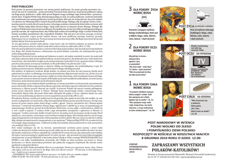 POST PUBLICZNY Ktoś powie: Ja poszczę prywatnie, nie muszę pościć publicznie. Za swoje grzechy prywatne nie – nawet nie jest to wskazanie – posty prywatne Pan Jezus każe ukrywać. Za grzechy publiczne należą się Bogu posty publiczne i tylko takie przed Bogiem mogą wybłagać Jego miłosierdzie i powstrzymanie kary. Tragedia Polski dnia dzisiejszego polega na tym, że osoby publiczne, zarówno kościelne jak i państwowe nie uznają publicznie swoich grzechów, albo ich nie widzą lub nie chcą ich widzieć a na pewno nie skłaniają siebie i innych do postu publicznego. Dlatego, aby nie zginąć razem z nimi – musimy pościć za nich, dla ich nawrócenia i własnego ocalenia z katastrofy, która idzie na świat, jeśli świat i Polska będą dalej obrażać Boga i będą dalej bierni na łamanie prawa Bożego. Dlatego dla ocalenia Polski konieczny jest post publiczny. Post publiczny ma być nie tylko przebłaganiem Boga za grzechy narodu, ale wyproszeniem, aby Polska była wolna od wszelkiego złego a ziemia Polska była ziemią wszelkiej pomyślności dla wszystkich Polaków. Tak jak post prywatny pomaga zwalczyć grzechy prywatne, często przed ludźmi ukryte, tak post publiczny pomaga zwalczyć grzechy dokonujące się we wspólnocie. Post prywatny jest przeznaczony tylko dla Boga i powinien być przed ludźmi ukryty. Pan Jezus powiedział: Ty zaś, gdy pościsz, namaść sobie głowę i umyj twarz, aby nie ludziom pokazać, że pościsz, ale Ojcu twemu, który jest w ukryciu. A Ojciec twój, który widzi w ukryciu, odda tobie. (Mt 6, 17-18). Tak wiec post publiczny też można a nawet trzeba tak przeprowadzać, aby nie pokazywać go ludziom lecz Bogu. Nie chodzi bowiem o obnoszenie się przed ludźmi z postem, ale wykonywanie go bez widocznego pokazywania. Święty Jan Chrzciciel też nie pokazywał ludziom, że pości, ale ludzie wiedzieli że pości, bo mało jadł i pił. Jego zadaniem było dać przykład ludziom, że powinni pościć, aby dokonało się w nich skuteczne nawrócenie, aby łaska Boża mogła się do nich przedostać i pobudzić ich do czynienia dobra. Dlatego pościł na tyle jawnie, że wszyscy wiedzieli, że Nie jadł chleba i nie pił wina (Łk 7, 33) Jezus dokonał 40-dniowego postu w ukryciu. Gdyby nie Ewangelie, nie wiedzielibyśmy o tym. Po ludzku powinien umrzeć. Jednakże czynił ten post w Bogu i dla Boga przeżył. Nie myślcie, że będziecie ocalenie dzięki innym, że ominie was kara, bo inni poszczą. Każdy musi pokutować za siebie i za bliźniego. Jest znane powiedzenie, Bóg stworzył nas bez nas, ale bez nas nie zbawi nas. Każdy musi sam zapracować ciężko na swoje zbawienie, czyli uwolnienie duszy od złego, a nato pomóc Jezusowi zbawiać innych. Jeśli będzie pracował wysiłkiem nadludzkim, na wzór Jezusa Chrystusa, może też przyczynić się do zbawienia innych. Świat spotykają coraz większe klęski, kataklizmy ze strony żywiołów oraz katastrofy spowodowane przez człowieka. Wiele z tego jest karą Bożą za grzechy, ale ludzie tego nie widzą lub nie chcą widzieć, zwłaszcza ci, którzy jeszcze ukarani nie zostali. A przecież Polska tak mocno została pobłogosławiona przez obecność Jezusa w Polsce. Dlatego Jezus przestrzegał wtedy i przestrzega teraz. Powiedział: Biada tobie, Korozain! Bida tobie, Betsaido! Bo gdyby w Tyrze i Sydonie działy się cuda, które u was się dokonały, już dawno w worze i popiele by się nawróciły. (Mt 11, 21) Mieszkańcy Niniwy czynili post publiczny, bo ich grzechy jako społeczności były tak wielkie, że całe miasto zasługiwało na zniszczenie. Bóg ostrzegł jednak Niniwę przez proroka Jonasza. Począł więc Jonasz iść przez miasto jeden dzień drogi i wołał, i głosił: “Jeszcze czterdzieści dni i Niniwa będzie zburzona”. I uwierzyli mieszkańcy Niniwy Bogu, ogłosili post i oblekli się w wory od największego do najmniejszego. Doszła ta sprawa do króla Niniwy. Wstał wiec z tronu, zdjął z siebie płaszcz, oblókł się w wór i padł w popiele. Z rozkazu króla i jego dostojników zarządzono i ogłoszono w Niniwie co następuje: “Ludzie i zwierzęta, bydło i trzoda niech nic nie jedzą, niech się nie pasą i wody nie piją. Niech obloką się wory (ludzie i zwierzęta) i niech żarliwie wołają do Boga. Niech każdy odwróci się od swego złego postępowania i od nieprawości, którą popełnia swoimi rękami. Kto wie, może się odwróci i ulituje Bóg, odstąpi od zapalczywości swego gniewu, a nie zginiemy?” Zobaczył Bóg CZYNY ich, że odwrócili się od swojego złego postępowania. I ulitował się Bóg nad niedolą, którą postanowił na nich sprowadzić, i nie zesłał jej” (Jon 3, 4-10) Dziś widać nasilające się zło na świecie, spowodowane zarówno przez naturę i przez ludzi a także złe duchy, lecz ludzie zachowują się tak, jakby się nic nie działo. Jak wielkie zło musi się stać, aby ludzie, zwłaszcza w Polsce, obudzili się i zmądrzeli? Co musi się stać, aby zobaczyli w jak wielkim złu żyją w życiu prywatnym i publicznym? Co musi się stać, aby przestali się temu tylko przyglądać i komentować a zaczęli DZIAŁAĆ w kierunku dobra? Kiedy w Polsce nastąpi WSPÓŁDZIAŁANIE DLA DOBRA a nie tylko współdziałanie przeciwko złu? Walka ze złem powinna się toczyć w sferze duchowej a w sferze materialnej powinien być pokój dla osiągania wspólnych dla narodu celów zgodnych z zamysłem Bożym. Pan Jezus do Zofii Nosko powiedział: Pisz to co ci powiem: Ziemia jest zagrożona, koniec idzie. Ziemia cała zginie, jeśli się nie nawrócicie do Boga, który jest Ojcem waszym”. Powtarzane to było kilkanaście razy – każdy wyraz z namaszczeniem! „ZAPAMIĘTAJ TO! Jeżeli nadal będziecie grzeszyć, nie będzie dla was ratunku znikąd! POKUTUJCIE! TO JUŻ CZAS!” To było powtórzone ze sto razy. (1986) DLA POKORY ŻYCIA 3 WOBEC BOGA POST ŻYCIA OD MYŚLENIA LUDZKIEGO Poznanie i przyjęcie 
