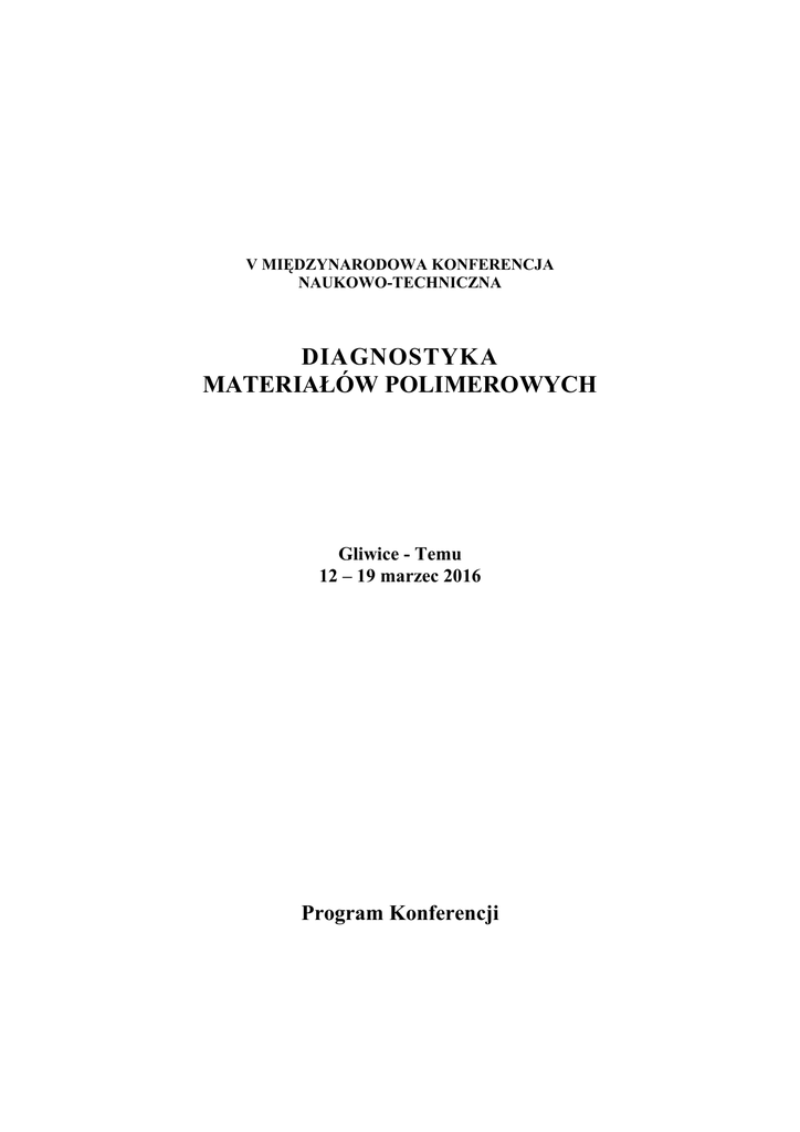 V MIĘDZYNARODOWA KONFERENCJA NAUKOWO-TECHNICZNA DIAGNOSTYKA MATERIAŁÓW POLIMEROWYCH Gliwice - Temu 12 – 19 marzec 2016 Program Konferencji ORGANIZATORZY KOMITET ORGANIZACYJNY Honorowy Przewodniczący dr hab. inż. Maciej Rojek Sekretarz Konferencji dr inż. Małgorzata Szymiczek Członkowie dr inż. Monika Chomiak dr inż. Rafał Honysz 2 KOMITET NAUKOWY prof. dr hab. inż. Gabriel WRÓBEL – Przewodniczący prof. dr hab. inż. Marta BŁAŻEWICZ dr hab. inż. Piotr CZARNOCKI, prof. nzw. w Pol. War. dr hab. inż. Andrzej GRZĄDZIELA, dr hab. inż. Jacek KACZMAR, prof. nzw. w Pol. Wr. dr hab inż. Jarosław KACZMARCZYK prof. dr hab. inż. Jan KOSMOL prof. dr hab. inż. Arkadiusz MĘŻYK dr hab. inż. Andrzej PUSZ, prof. nzw. w Pol. Śl. dr hab. inż. Wojciech SITEK, prof. nzw. w Pol. Śl. dr hab. inż. Józef STABIK, prof. nzw. w Pol. Śl. prof dr hab. Barbara SUROWSKA prof. dr hab. inż. Eugeniusz ŚWITOŃSKI 3 4 RAMOWY PROGRAM V KONFERENCJI NAUKOWO – TECHNICZNEJ „DIAGNOSTYKA MATERIAŁÓW POLIMEROWYCH” PROGRAM KONFERECJI Sobota 12 III 2016 15:00‐19:00 REJESTRACJA I ZAKWATEROWANIE UCZESTNIKÓW MIEJSCE: HOTEL AVIO***, VIA ROMA, 26, 25050 TEMU BS, WŁOCHY Spotkanie informacyjne z rezydentem 5 Niedziela 13 III 2016 Przewodniczący: Prof. dr hab. inż. Gabriel Wróbel 17:30 POWITANIE I UROCZYSTE OTWARCIE KONFERENCJI Wystąpienie otwierające V Konferencję Naukowo‐Techniczną DIAGNOSTYKA 2016 Wprowadzenie do tematu konferencji: Diagnostyka materiałów polimerowych Diagnostyka materiałów i urządzeń technicznych to zespół badań podejmowanych w celu identyfikacji aktualnego lub kolejnych stanów obiektu badań w aspekcie ich oceny, odtworzenia historii poprzedzającej badane stany bądź stworzenia prognozy przyszłej ewolucji obiektu. Wynikiem badania diagnostycznego może być opis lub ocena stanu obiektu, ale także opisy procesów zachodzących w obiekcie badań. Ta druga grupa wyników jest szczególnie cenna jako podstawa prognozowania i kształtowania przyszłości obiektu badań; dla kryminologów, historyków czy archeologów ‐ również przeszłości. Specyfika badań diagnostycznych zależy w zasadniczym stopniu od badanego obiektu, a ściślej wyboru badanych charakterystyk tego obiektu. Charakterystyki te mogą mieć specyfikę fizyczną (mechaniczną, elektryczną, elektromagnetyczną, cieplną itd.), chemiczną, geometryczną, strukturalną, funkcjonalną i in. Mogą mieć charakter statyczny lub dynamiczny. Z punktu widzenia funkcjonalności obiektu badań mogą być charakterystykami użytkowymi, związanymi z zdolnością i jakością pełnienia funkcji celowości technicznej obiektu, bądź nie związanymi z tymi zdolnościami, przynajmniej wprost. Mając na uwadze znaczenie dla bezpieczeństwa obsługi czy też użytkowania badanych obiektów, ekonomiki procesów eksploatacji, ochronę środowiska można stwierdzić, że zagadnienia diagnostyczne zajmują kluczowe miejsce w działalności technicznej. Możliwości podejmowania i skutecznego rozwiązywania zadań z tego obszaru zależą od jakości metod i narzędzi badawczych, kwalifikacji specjalistów oraz zaangażowanej współpracy zainteresowanych diagnostyką grup na rynku dóbr konsumpcyjnych, narzędzi i usług. Mam nadzieję, że kolejna konferencja pod hasłem Diagnostyka materiałów polimerowych dostarczy wielu okazji dzielenia się doświadczeniem i wiedzą w gronie uczestników naukowych sesji, ale również pozwoli na dalsze wzajemne zbliżenie w umacnianiu struktur współpracy dla dostrzegania i rozwiązywania problemów diagnostyki w uzasadnionych potrzebą miejscach i na wszystkich jej poziomach. Mamy wśród nas badaczy stanu materiałów inżynierskich jak też biologicznych, urządzeń technicznych – maszyn oraz budowli, działających w laboratorium, na poligonie, w hali maszyn czy w wirtualnej przestrzeni modeli symulacyjnych. Wspólnym celem są badania diagnostyczne, co sprawi, że w najbliższych dniach zapewne nie braknie wspólnych tematów do dyskusji integrujących przybyłych na konferencję i reprezentowane przez nich ośrodki naukowe, firmy produkcyjne i dystrybucyjne zainteresowane rozwojem diagnostyki. Wszystkim życzę spełnienia takich oczekiwań ale i wielu cennych efektów nieoczekiwanych, które z reguły towarzyszą procesom nie do końca poddającym się diagnostyce i prognozowaniu. 6 Poniedziałek 14 III 2016 Przewodniczący: dr hab. inż. Wojciech Jurczak, prof. nadzw. AMW 17:30 – 19:00 I panel: Diagnostyka materiałowa obiektów w gospodarce morskiej WYSTĄPIENIE WPROWADZAJĄCE: 17:30 Andrzej Grządziela: WYKORZYSTANIE POLIMERÓW W KONSTRUKCJACH OKRĘTOWYCH UKŁADÓW NAPĘDOWYCH – PROBLEMY W DIAGNOZOWANIU 18:00 Gabriel Wróbel, Małgorzata Szymiczek, Jarosław Kaczmarczyk: WPŁYW STRUKTURY ORAZ LICZBY WARSTW WZMOCNIENIA NA STAN NAPRĘŻENIA W POWŁOKACH ZBIORNIKÓW I RUR CIŚNIENIOWYCH 18:30 Dyskusja 21:30 DEBATA NA TEMAT BUDOWANIA RELACJI POMIĘDZY ŚRODOWISKIEM NAUKOWYM A PRZEMYSŁEM Budowanie właściwych relacji między nauką a biznesem to bardzo ważny problem dla obu środowisk, a wręcz strategiczny dla gospodarki. „Co zrobić aby przedsiębiorcy szerzej współpracowali z nauką” 7 Wtorek 15 III 2016 Przewodniczący: prof. dr hab. Zbigniew Bartczak 17:30‐19:00 II panel: Diagnozowanie stanu materiału po modyfikacji 17:30 Ewa OLEWNIK‐KRUSZKOWSKA: WPŁYW KOMPATYBILIZATORA NA WŁASCIWOŚCI TERMICZNE KOMPOZYTÓW NA BAZIE POLILAKTYDU NAŚWIETLANYCH PROMIENIOWANIEM UV‐C 18:00 Ewa OLEWNIK‐KRUSZKOWSKA: WPŁYW MODYFIKATORÓW NA BAZIE KARBAZOLU NA WŁASCIWOŚCI KOMPOZYTÓW POLIETYLENU 18:30 Dyskusja 21:30 DEBATA NA TEMAT DZIAŁAŃ NA RZECZ KOMERCJALIZACJI WYNIKÓW BADAŃ NAUKOWYCH I PRAC ROZWOJOWYCH Nawiązanie współpracy pozwoli na pełne wykorzystanie potencjału nauki i przemysłu, tak istotne dla wzrostu innowacyjności i produktywności. Efektywne wykorzystywanie wiedzy to priorytet dla dzisiejszej gospodarki, szczególnie w dobie 