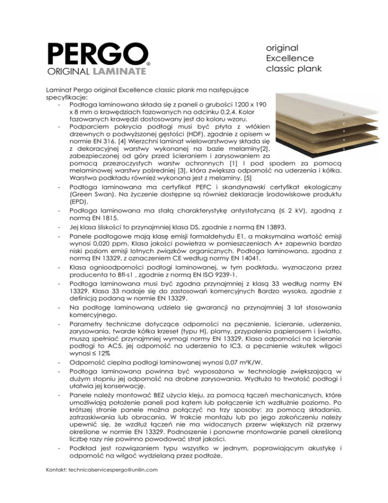 original Excellence classic plank Laminat Pergo original Excellence classic plank ma następujące specyfikacje: - Podłoga laminowana składa się z paneli o grubości 1200 x 190 x 8 mm o krawędziach fazowanych na odcinku 0,2,4. Kolor fazowanych krawędzi dostosowany jest do koloru wzoru. - Podparciem pokrycia podłogi musi być płyta z włókien drzewnych o podwyższonej gęstości (HDF), zgodnie z opisem w normie EN 316. [4] Wierzchni laminat wielowarstwowy składa się z dekoracyjnej warstwy wykonanej na bazie melaminy[2], zabezpieczonej od góry przed ścieraniem i zarysowaniem za pomocą przezroczystych warstw ochronnych [1] I pod spodem za pomocą melaminowej warstwy pośredniej [3], która zwiększa odporność na uderzenia i kółka. Warstwa podkładu również wykonana jest z melaminy. [5] - Podłoga laminowana ma certyfikat PEFC i skandynawski certyfikat ekologiczny (Green Swan). Na życzenie dostępne są również deklaracje środowiskowe produktu (EPD). - Podłoga laminowana ma stałą charakterystykę antystatyczną (≤ 2 kV), zgodną z normą EN 1815. - Jej klasa śliskości to przynajmniej klasa DS, zgodnie z normą EN 13893. - Panele podłogowe mają klasę emisji formaldehydu E1, a maksymalna wartość emisji wynosi 0,020 ppm. Klasa jakości powietrza w pomieszczeniach A+ zapewnia bardzo niski poziom emisji lotnych związków organicznych. Podłoga laminowana, zgodna z normą EN 13329, z oznaczeniem CE według normy EN 14041. - Klasa ognioodporności podłogi laminowanej, w tym podkładu, wyznaczona przez producenta to Bfl-s1 , zgodnie z normą EN ISO 9239-1. - Podłoga laminowana musi być zgodna przynajmniej z klasą 33 według normy EN 13329. Klasa 33 nadaje się do zastosowań komercyjnych Bardzo wysoka, zgodnie z definicją podaną w normie EN 13329. - Na podłogę laminowaną udziela się gwarancji na przynajmniej 3 lat stosowania komercyjnego. - Parametry techniczne dotyczące odporności na pęcznienie, ścieranie, uderzenia, zarysowania, twarde kółka krzeseł (typu H), plamy, przypalenia papierosem i światło, muszą spełniać przynajmniej wymogi normy EN 13329. Klasa odporności na ścieranie podłogi to AC5, jej odporność na uderzenia to IC3, a pęcznienie wskutek wilgoci wynosi ≤ 12% - Odporność cieplna podłogi laminowanej wynosi 0,07 m²K/W. - Podłoga laminowana powinna być wyposażona w technologię zwiększającą w dużym stopniu jej odporność na drobne zarysowania. Wydłuża to trwałość podłogi i ułatwia jej konserwację. - Panele należy montować BEZ użycia kleju, za pomocą łączeń mechanicznych, które umożliwiają położenie paneli pod kątem lub połączenie ich wzdłużnie poziomo. Po krótszej stronie panele można połączyć na trzy sposoby: za pomocą składania, zatrzaskiwania lub obracania. W trakcie montażu lub po jego zakończeniu należy upewnić się, że wzdłuż łączeń nie ma widocznych przerw większych niż przerwy określone w normie EN 13329. Podnoszenie i ponowne montowanie paneli określoną liczbę razy nie powinno powodować strat jakości. - Podkład jest rozwiązaniem typu wszystko w jednym, poprawiającym akustykę i odporność na wilgoć wydzielaną przez podłoże. Kontakt: [email protected] - Odstępy od ścian zostaną zasłonięte listwami przyściennymi lub profilami o pasującym do paneli wzorze. Wzór można wybrać z kolekcji original Excellence, classic plank. Kontakt: [email protected]