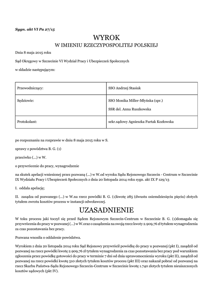 Sygn. akt VI Pa 27/15 WYROK W IMIENIU RZECZYPOSPOLITEJ POLSKIEJ Dnia 8 maja 2015 roku Sąd Okręgowy w Szczecinie VI Wydział Pracy i Ubezpieczeń Społecznych w składzie następującym: Przewodniczący: SSO Andrzej Stasiuk Sędziowie: SSO Monika Miller-Młyńska (spr.) SSR del. Anna Ruszkowska Protokolant: sekr.sądowy Agnieszka Furtak Kozłowska po rozpoznaniu na rozprawie w dniu 8 maja 2015 roku w S. sprawy z powództwa B. G. (1) przeciwko (...) w W. o przywrócenie do pracy, wynagrodzenie na skutek apelacji wniesionej przez pozwaną (...) w W.od wyroku Sądu Rejonowego Szczecin - Centrum w Szczecinie IX Wydziału Pracy i Ubezpieczeń Społecznych z dnia 20 listopada 2014 roku sygn. akt IX P 129/13 I. oddala apelację; II. zasądza od pozwanego (...) w W.na rzecz powódki B. G. (1)kwotę 285 (dwustu osiemdziesięciu pięciu) złotych tytułem zwrotu kosztów procesu w instancji odwoławczej. UZASADNIENIE W toku procesu jaki toczył się przed Sądem Rejonowym Szczecin-Centrum w Szczecinie B. G. (1)domagała się przywrócenia do pracy w pozwanej (...) w W.oraz o zasądzenia na swoją rzecz kwoty 2.909,76 zł tytułem wynagrodzenia za czas pozostawania bez pracy. Pozwana wnosiła o oddalenie powództwa. Wyrokiem z dnia 20 listopada 2014 roku Sąd Rejonowy przywrócił powódkę do pracy u pozwanej (pkt I), zasądził od pozwanej na rzecz powódki kwotę 2.909,76 zł tytułem wynagrodzenia za czas pozostawania bez pracy pod warunkiem zgłoszenia przez powódkę gotowości do pracy w terminie 7 dni od dnia uprawomocnienia wyroku (pkt II), zasądził od pozwanej na rzecz powódki kwotę 510 złotych tytułem kosztów procesu (pkt III) oraz nakazał pobrać od pozwanej na rzecz Skarbu Państwa-Sądu Rejonowego Szczecin-Centrum w Szczecinie kwotę 1.740 złotych tytułem nieuiszczonych kosztów sądowych (pkt IV). Powyższe rozstrzygnięcie Sąd Rejonowy wydał w oparciu o następujące ustalenia faktyczne i rozważania prawne: Strony od dnia 1 stycznia 1996 r. łączył stosunek pracy, na podstawie którego powódka świadczyła pracę na rzecz pozwanej ostatnio na stanowisku inspektora do spraw księgowych w dziale inwestycji (...) oddziału pozwanej. Od 1 kwietnia 1996 r. podstawą tego stosunku jest umowa o pracę na czas nieokreślony. Do obowiązków pracowniczych powódki należało sporządzanie opisów kontrolingowych, opisywanie faktur pod względem zgodności z umowami o zarządzanie, podział kosztów wynikających z poszczególnych faktur między budynki administrowane przez pozwaną, uczestniczenie w zebraniach wspólnot, weryfikacja uchwał wspólnot w przedmiocie wysokości opłat. Powódka nie miała pisemnie przypisanego terenu, w którym miały być położone budynki, którymi się zajmowała. Teren ten ustalał jej przełożony w formie polecenia ustnego. W dziale inwestycji oddziału (...) pozwana zatrudniała 20 pracowników. Prócz powódki jeszcze dwóch pracowników wykonywało takie same obowiązki jak ona. Były to A. J. i D. P., zatrudnione na stanowiskach inspektorów. W okresie między 27 lutego 2012 r. i 31 stycznia 2013 r. powódka była nieobecna w pracy przez 333 dni. W tym czasie przebywała na zwolnieniu lekarskim, a przez 4 dni korzystała z urlopu na żądanie. Na mocy porozumienia zawartego w dniu 13 czerwca 2012 r. między pozwaną i (...) Związkiem Zawodowym (...)(...), począwszy od czerwca 2012 r. do 31 grudnia 2012 r. miało dojść do wypowiedzenia umów o pracę (...)pracownikom. Jako kryteria doboru do zwolnienia wskazano: zgodę na dobrowolne odejście w trybie porozumienia stron, posiadanie praw emerytalnych lub rentowych lub też spełnienie wymogów do ich uzyskania, likwidację stanowiska lub zadań wykonywanych przez pracownika, odmowę przyjęcia przez pracownika zaproponowanych mu nowych warunków pracy, analizę dotychczasowego stosunku do obowiązków służbowych, kwalifikacje i wykształcenie do pracy na danym stanowisku. W oddziale regionalnym pozwanej w S. do zwolnienia wytypowano 12 pracowników, w tym powódkę jako jedyną ze swojego działu. Jako przewidywany termin jej zwolnienia wskazano 30 listopada 2012 r. Komórka oddziałowa (...)(...)w S.zakwestionowała wytypowanie powódki do wypowiedzenia umowy o pracę. W dniu 4 stycznia 2013 r. pozwana zawiadomiła m.in. Związek Zawodowy (...)(...) o zamiarze wypowiedzenia powódce umowy o pracę, wskazując jako przyczynę likwidację jej stanowiska pracy. Organizacja ta w dniu 9 stycznia 2013 r. nie wyraziła zgody na wypowiedzenie powódce umowy. W dniu 11 lutego 2013 r. pozwana wypowiedziała powódce umowę o pracę z zachowaniem trzymiesięcznego okresu wypowiedzenia. Jako przyczynę swojej decyzji wskazała likwidację stanowiska pracy powódki. Przy wręczaniu powódce oświadczenia o wypowiedzeniu umowy nie tłumaczono jej, dlaczego to właśnie jej stanowisko pracy zostało zlikwidowane. Ustalenia faktyczne w sprawie poczynione zostały w oparciu o dowody z dokumentów, zeznania świadków M. D. (1) i E. Ż. oraz zeznania powódki. Sąd uznał je za w pełni wiarygodne. Pominięte zostały wnioski dowodowe powódki o dopuszczenie dowodu z zeznań świadków E. S., R. W., M. R., H. K.. W tak ustalonym stanie faktycznym sąd I instancji uznał powództwo za uzasadnione. W pierwszej kolejności Sąd Rejonowy wskazał, że podstawę prawną żądania powódki stanowił art. 45 § 1 k.p. Podkreślił, że wynikający z tego przepisu wymóg zasadności wypowiedzenia umowy o pracę zawartej na czas nieokreślony implikuje ustanowienie z mocy art. 30 § 4 k.p. obowiązku wskazania przez pracodawcę w pisemnym oświadczeniu woli o rozwiązaniu stosunku zatrudnienia konkretnej przyczyny owego wypowiedzenia. Wskazanie tejże przyczyny lub przyczyn przesądza o tym, iż spór przed sądem pracy może się toczyć tylko w ich granicach. Sąd Rejonowy wskazał, że w judykaturze ugruntowany jest pogląd, że okoliczności podane pracownikowi na uzasadnienie decyzji o rozwiązaniu s