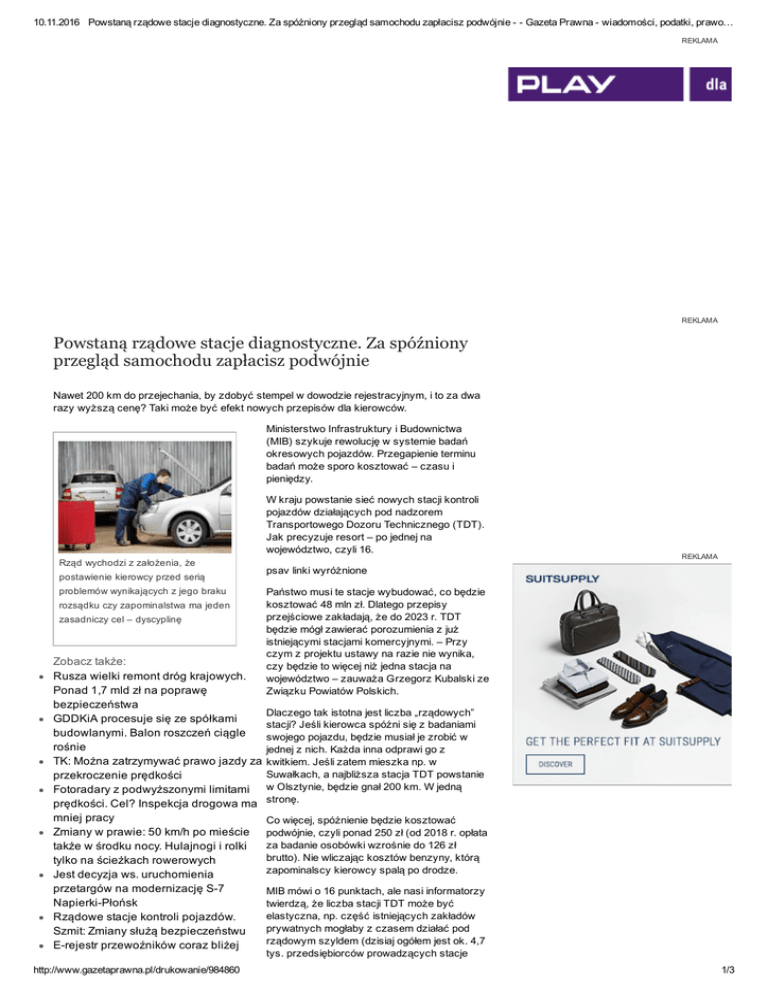 10.11.2016 Powstaną rządowe stacje diagnostyczne. Za spóźniony przegląd samochodu zapłacisz podwójnie Gazeta Prawna wiadomości, podatki, prawo… REKLAMA REKLAMA Powstaną rządowe stacje diagnostyczne. Za spóźniony przegląd samochodu zapłacisz podwójnie Nawet 200 km do przejechania, by zdobyć stempel w dowodzie rejestracyjnym, i to za dwa razy wyższą cenę? Taki może być efekt nowych przepisów dla kierowców. Ministerstwo Infrastruktury i Budownictwa (MIB) szykuje rewolucję w systemie badań okresowych pojazdów. Przegapienie terminu badań może sporo kosztować – czasu i pieniędzy. W kraju powstanie sieć nowych stacji kontroli pojazdów działających pod nadzorem Transportowego Dozoru Technicznego (TDT). Jak precyzuje resort – po jednej na województwo, czyli 16. Rząd wychodzi z założenia, że postawienie kierowcy przed serią problemów wynikających z jego braku rozsądku czy zapominalstwa ma jeden zasadniczy cel – dyscyplinę Zobacz także: Rusza wielki remont dróg krajowych. Ponad 1,7 mld zł na poprawę bezpieczeństwa GDDKiA procesuje się ze spółkami budowlanymi. Balon roszczeń ciągle rośnie TK: Można zatrzymywać prawo jazdy za przekroczenie prędkości Fotoradary z podwyższonymi limitami prędkości. Cel? Inspekcja drogowa ma mniej pracy Zmiany w prawie: 50 km/h po mieście także w środku nocy. Hulajnogi i rolki tylko na ścieżkach rowerowych Jest decyzja ws. uruchomienia przetargów na modernizację S7 NapierkiPłońsk Rządowe stacje kontroli pojazdów. Szmit: Zmiany służą bezpieczeństwu Erejestr przewoźników coraz bliżej http://www.gazetaprawna.pl/drukowanie/984860 REKLAMA psav linki wyróżnione Państwo musi te stacje wybudować, co będzie kosztować 48 mln zł. Dlatego przepisy przejściowe zakładają, że do 2023 r. TDT będzie mógł zawierać porozumienia z już istniejącymi stacjami komercyjnymi. – Przy czym z projektu ustawy na razie nie wynika, czy będzie to więcej niż jedna stacja na województwo – zauważa Grzegorz Kubalski ze Związku Powiatów Polskich. Dlaczego tak istotna jest liczba „rządowych” stacji? Jeśli kierowca spóźni się z badaniami swojego pojazdu, będzie musiał je zrobić w jednej z nich. Każda inna odprawi go z kwitkiem. Jeśli zatem mieszka np. w Suwałkach, a najbliższa stacja TDT powstanie w Olsztynie, będzie gnał 200 km. W jedną stronę. Co więcej, spóźnienie będzie kosztować podwójnie, czyli ponad 250 zł (od 2018 r. opłata za badanie osobówki wzrośnie do 126 zł brutto). Nie wliczając kosztów benzyny, którą zapominalscy kierowcy spalą po drodze. MIB mówi o 16 punktach, ale nasi informatorzy twierdzą, że liczba stacji TDT może być elastyczna, np. część istniejących zakładów prywatnych mogłaby z czasem działać pod rządowym szyldem (dzisiaj ogółem jest ok. 4,7 tys. przedsiębiorców prowadzących stacje 1/3 10.11.2016 Powstaną rządowe stacje diagnostyczne. Za spóźniony przegląd samochodu zapłacisz podwójnie Gazeta Prawna wiadomości, podatki, prawo… kontroli pojazdów). Resort infrastruktury tłumaczy, że chodzi o efektywne zdyscyplinowanie posiadaczy aut. Daje też szansę na uniknięcie kłopotów. psav linki wyróżnione – W projekcie (nowelizacji ustawy – Prawo o ruchu drogowym – red.) zaproponowano, aby właściciel pojazdu miał dodatkowo 30 dni na wykonanie badania bez ponoszenia konsekwencji. Po tym terminie zobowiązany będzie do wykonania badania tylko w wyznaczonej stacji kontroli – wyjaśnia Elżbieta Kisil, rzeczniczka MIB. Wyznaczonej, czyli rządowej. Rządowe stacje diagnostyczne, do których karnie odsyłani będą niefrasobliwi kierowcy, szybko mogą się zatkać. W Polsce aż ok. 40 proc. kierowców zapomina na czas zrobić badania okresowe swoich pojazdów Pytania i wątpliwości, związane z przygotowanym przez Ministerstwo Infrastruktury i Budownictwa (MIiB) projektem ustawy wciąż się mnożą. I nie chodzi bynajmniej o przyświecający im cel, lecz realność rządowych założeń. Jeśli kierowca, po dodatkowych 30 dniach od upływu terminu badania, dowie się o problemie i w związku z tym uda się do jednej z rządowych stacji, może się okazać, że przed nim już ustawiła się długa kolejka oczekujących. Trzeba bowiem założyć, że nie będzie jedynym zapominalskim w województwie (szacuje się, że w Polsce aż 40 proc. kierowców nie robi badań technicznych na czas). Poza tym stacje Transportowego Dozoru Technicznego (TDT), o ile nie będą się raczej zajmować „zwykłymi badaniami pojazdów” (za te odpowiadają stacje podstawowe i okręgowe), o tyle będą miały i tak sporo innych obowiązków, takich jak np. przeprowadzanie okresowych i dodatkowych badań pojazdów przystosowanych do przewozu niebezpiecznych towarów, badań pojazdów, w których dokonano istotnych zmian konstrukcyjnych czy weryfikacji stanu technicznego tramwajów i trolejbusów. psav linki wyróżnione – Istnieje obawa, że jeśli rząd nie powiększy liczby stacji TDT, te szybko się zapchają. Rozumiem, że chodzi o zdyscyplinowanie kierowców i pośrednie ukaranie ich za niedopilnowanie terminu badań. Ale czy nie gubimy po drodze zdrowego rozsądku? Planując wizytę w jednej z takich rządowych stacji, kierowca będzie musiał pomyśleć o jakimś noclegu, bo nie wiadomo, ile czasu spędzi na miejscu, czekając na swoją kolej – ironizuje jeden z naszych rozmówców. Co więcej, wcale nie jest powiedziane, że wyprawa do rządowej stacji zakończy się powodzeniem. – Wynik badania nie jest przesądzony. Kierowca po dojechaniu na miejsce może się np. dowiedzieć, że przewody hamulcowe w jego aucie nie nadają się do dalszej jazdy – zwraca uwagę Marcin Żak ze Stowarzyszenia Ekspertów Techniki Motoryzacyjnej i Diagnostów Samochodowych. Co więc jeśli kierowca dostanie negatywny wynik na jednej z rządowych stacji? Jak tłumaczy MIiB, procedury co do zasady nie ulegną zmianie, tzn. trzeb