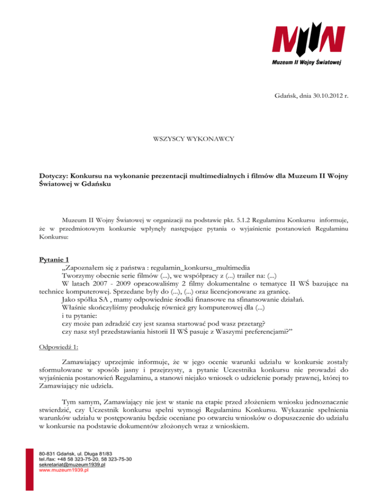 Gdańsk, dnia 30.10.2012 r. WSZYSCY WYKONAWCY Dotyczy: Konkursu na wykonanie prezentacji multimedialnych i filmów dla Muzeum II Wojny Światowej w Gdańsku Muzeum II Wojny Światowej w organizacji na podstawie pkt. 5.1.2 Regulaminu Konkursu informuje, że w przedmiotowym konkursie wpłynęły następujące pytania o wyjaśnienie postanowień Regulaminu Konkursu: Pytanie 1 „Zapoznałem się z państwa : regulamin_konkursu_multimedia Tworzymy obecnie serie filmów (...), we współpracy z (...) trailer na: (...) W latach 2007 - 2009 opracowaliśmy 2 filmy dokumentalne o tematyce II WŚ bazujące na technice komputerowej. Sprzedane były do (...), (...) oraz licencjonowane za granicę. Jako spółka SA , mamy odpowiednie środki finansowe na sfinansowanie działań. Właśnie skończyliśmy produkcję również gry komputerowej dla (...) i tu pytanie: czy może pan zdradzić czy jest szansa startować pod wasz przetarg? czy nasz styl przedstawiania historii II WŚ pasuje z Waszymi preferencjami?” Odpowiedź 1: Zamawiający uprzejmie informuje, że w jego ocenie warunki udziału w konkursie zostały sformułowane w sposób jasny i przejrzysty, a pytanie Uczestnika konkursu nie prowadzi do wyjaśnienia postanowień Regulaminu, a stanowi niejako wniosek o udzielenie porady prawnej, której to Zamawiający nie udziela. Tym samym, Zamawiający nie jest w stanie na etapie przed złożeniem wniosku jednoznacznie stwierdzić, czy Uczestnik konkursu spełni wymogi Regulaminu Konkursu. Wykazanie spełnienia warunków udziału w postępowaniu będzie oceniane po otwarciu wniosków o dopuszczenie do udziału w konkursie na podstawie dokumentów złożonych wraz z wnioskiem. 80-831 Gdańsk, ul. Długa 81/83 tel./fax: +48 58 323-75-20, 58 323-75-30 [email protected] www.muzeum1939.pl Pytanie 2 W związku z ogłoszonym Konkursem na wykonanie prezentacji multimedialnych dla Muzeum II wojny światowej w Gdańsku zwracam się z prośbą o interpretację zapisu w punkcie 2.1.3.B Regulaminu Konkursu (s. 6): wykonał (…) co najmniej jeden film dokumentalny i co najmniej jedną prezentację multimedialną…”. Czy wymienione w. warunki mogą być spełnione osobno przez dwie osoby wchodzące w skład zespołu realizacyjnego? Czy wymienione w. warunki mogą być spełnione osobno przez dwa podmioty wchodzące w skład konsorcjum? Odpowiedź 2: Odpowiadając na pytanie: czy wymienione w. warunki mogą być spełnione osobno przez dwa podmioty wchodzące w skład konsorcjum Zamawiający informuje, że zgodnie z zapisami pkt. II.2.1.7 Regulaminu Konkursu w przypadku wspólnego uczestnictwa w konkursie warunki wskazane w pkt II.2.1.3 Regulaminu mogą być spełnione łącznie przez Uczestników wspólnie ubiegających się o wzięcie udziału w konkursie. Wobec powyższego Uczestnicy konkursu występujący w konkursie wspólnie, mogą łączyć swój potencjał w taki sposób, aby razem spełnić warunki udziału w konkursie wskazane w pkt. II.2.1.3 Regulaminu Konkursu. Uczestnicy muszą mieć jednak na uwadze, że żaden z Uczestników wspólnie ubiegających się o wzięcie udziału w konkursie nie może podlegać wykluczeniu na podstawie art. 24 ust.1 Ustawy. Odnosząc się zaś do pytania: „Czy wymienione w. warunki mogą być spełnione osobno przez dwie osoby wchodzące w skład zespołu realizacyjnego?” Zamawiający informuje, że warunek wskazany w pkt. II.2.1.3.B) odnosi się bezpośrednio do Uczestników konkursu, a więc do podmiotów, które w wyniku prowadzonego konkursu zostaną zaproszone do negocjacji w trybie z wolnej ręki jako „Strona” przyszłej umowy. Warunek ten nie odnosi się do osób, które będą wykonywać przedmiot zamówienia jako np. pracownicy Uczestnika konkursu. 80-831 Gdańsk, ul. Długa 81/83 tel./fax: +48 58 323-75-20, 58 323-75-30 [email protected] www.muzeum1939.pl