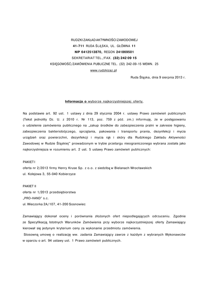 RUDZKI ZAKŁAD AKTYWNOŚCI ZAWODOWEJ 41-711 RUDA ŚLĄSKA, UL. GŁÓWNA 11 NIP 6412513870, REGON 241869501 SEKRETARIAT TEL./FAX. (32) 242 09 15 KSIĘGOWOŚĆ/ZAMÓWIENIA PUBLICZNE TEL. (32) 242-09-15 WEWN. 25 www.rudzkizaz.pl Ruda Śląska, dnia 9 sierpnia 2013 r. Informacja o wyborze najkorzystniejszej oferty. Na podstawie art. 92 ust. 1 ustawy z dnia 29 stycznia 2004 r. ustawy Prawo zamówień publicznych (Tekst jednolity Dz. U. z 2010 r. Nr 113, poz. 759 z póź. zm.) informuję, że w postępowaniu o udzielenie zamówienia publicznego na „zakup środków do zabezpieczenia pralni w zakresie higieny, zabezpieczenia bakteriobójczego, sprzątania, pakowania i transportu prania, dezynfekcji i mycia urządzeń oraz powierzchni, dezynfekcji i mycia rąk i skóry dla Rudzkiego Zakładu Aktywności Zawodowej w Rudzie Śląskiej" prowadzonym w trybie przetargu nieograniczonego wybrana została jako najkorzystniejsza w rozumieniu art. 2 ust. 5 ustawy Prawo zamówień publicznych: PAKIET I oferta nr 2/2013 firmy Henry Kruse Sp. z o.o. z siedzibą w Bielanach Wrocławskich ul. Kolejowa 3, 55-040 Kobierzyce PAKIET II oferta nr 1/2013 przedsiębiorstwa „PRO-HAND" s.c. ul. Wieczorka 2A/107, 41-200 Sosnowiec Zamawiający dokonał oceny i porównania złożonych ofert niepodlegających odrzuceniu. Zgodnie ze Specyfikacją Istotnych Warunków Zamówienia przy wyborze najkorzystniejszej oferty Zamawiający kierował się jedynym kryterium ceny za wykonanie przedmiotu zamówienia. Stosowną umowę o realizację ww. zadania Zamawiający zawrze z każdym z wybranych Wykonawców w oparciu o art. 94 ustawy ust. 1 Prawo zamówień publicznych. Wykaz Wykonawców, którzy ztożyli oferty: Nr oferty Nazwa Wykonawcy Siedziba i adres Wykonawcy 1/2013 „PRO-HAND" s.c. ul. Wieczorka 2A/107, 41-200 Sosnowiec 2/2013 Henry Kruse Sp. z o.o. Bielany Wrocławskie ul. Kolejowa 3, 55-040 Kobierzyce Wykaz i porównanie złożonych ofert: PAKIET I Nr Firma (nazwa) lub oferty nazwisko oraz adres wykonawcy Ranking złożonych ofert w kryterium Cena oferty ceny. Henry Kruse Sp. z o.o. Bielany Wrocławskie 2/2013 ul. Kolejowa 3, 119 854,55 1 - 1 0 0 punktów 55-040 Kobierzyce PAKIET II Nr Firma (nazwa) lub oferty nazwisko oraz adres wykonawcy Ranking złożonych ofert w kryterium Cena oferty ceny. „PRO-HAND" s.c. 170348,85 1/2013 ul. Wieczorka 2A/107, 1 - 1 0 0 punktów 41-200 Sosnowiec Henry Kruse Sp. z o.o. Bielany Wrocławskie 2/2013 ul. Kolejowa 3, 188 970,83 2 - 9 0 , 1 5 punktów 55-040 Kobierzyce Informacja o wyborze oferty najkorzystniejszej została umieszczona również na stronie internetowej Rudzkiego Zakładu Aktywności Zawodowej: www.rudzkizaz.pl . Na podstawie oceny spełnienia warunków udziału w postępowaniu oraz kryteriów oceny ofert ustalono, iż w PAKIECIE NR I oferta nr 2/2013 firmy Henry Kruse Sp. z o.o. a w PAKIECIE NR II oferta nr 1/2013 przedsiębiorstwa „PRO-HAND" s.c. odpowiada wszystkim wymaganiom określonym w ustawie Prawo zamówień publicznych oraz w specyfikacji istotnych warunków zamówienia i została oceniona jako najkorzystniejsza w oparciu o kryterium wyboru podane w specyfikacji istotnych warunków zamówienia oraz ogłoszeniu o postępowaniu w BZP. Z poważaniem DYRE RudzkieooZoktodu Ak mgr Joann OR I Zawodowe) wa